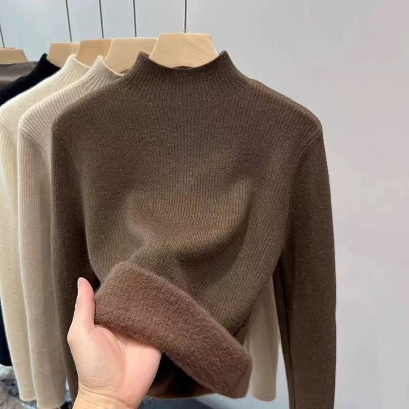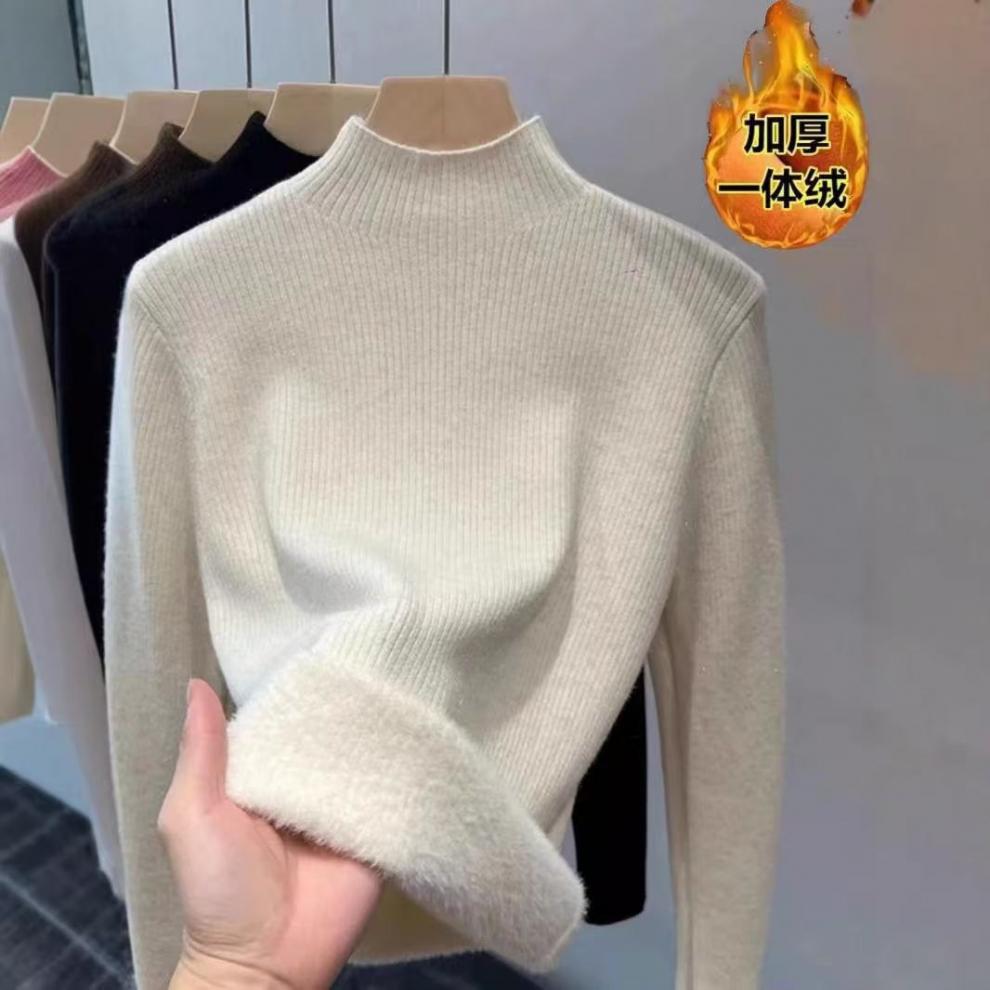 2025 기모 두꺼운 원피스 벨벳 하프 터틀넥 슬림핏 여성용 가을과 겨울 따뜻한 탑, 스웨터베이스 셔츠스토어 가기