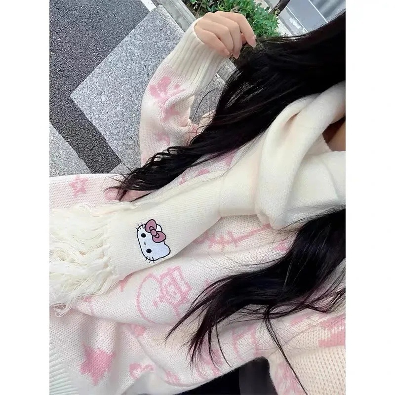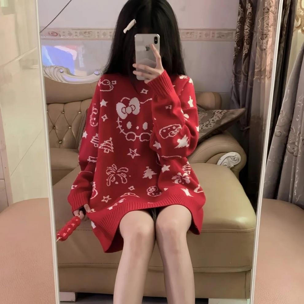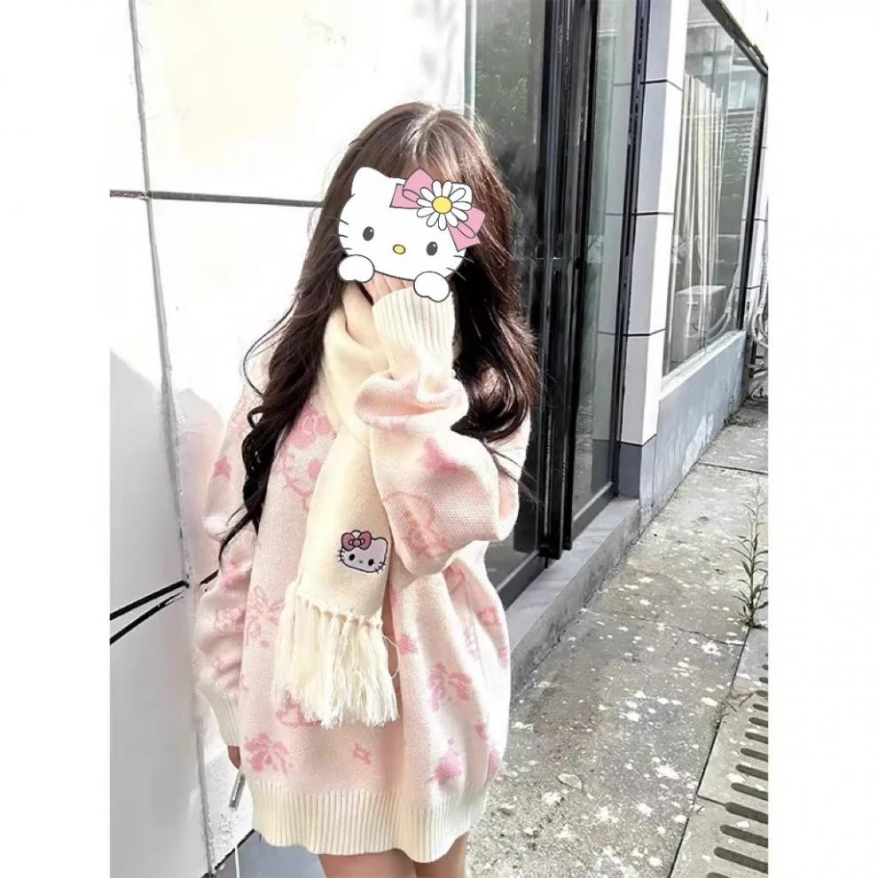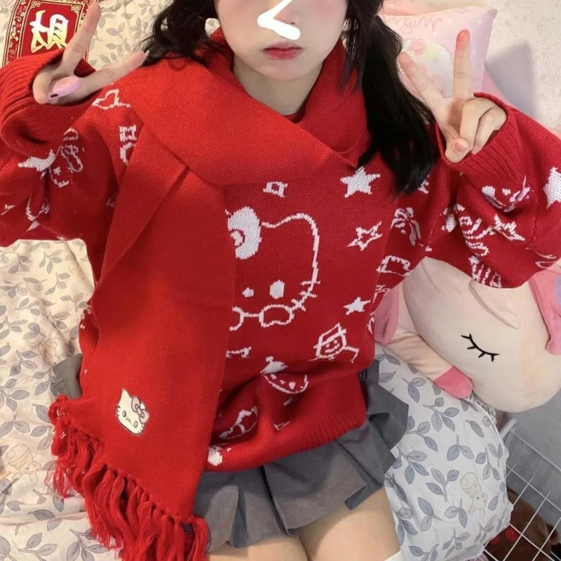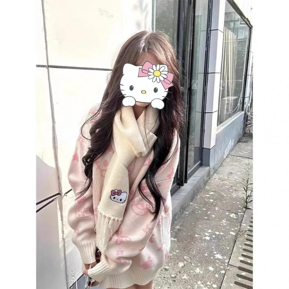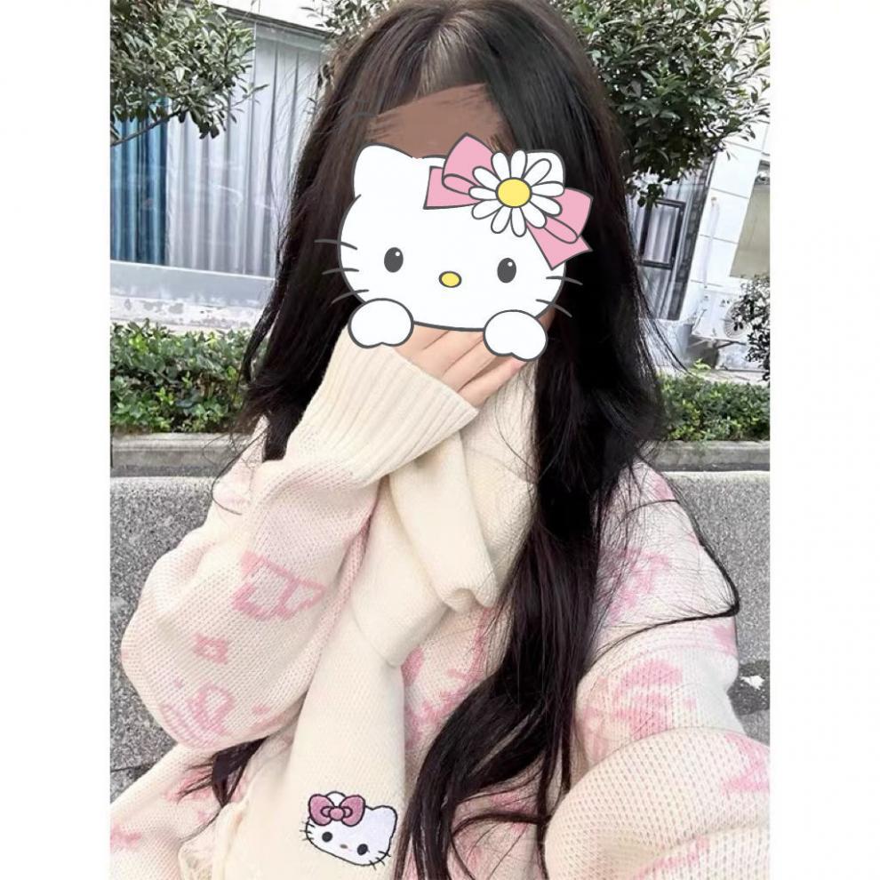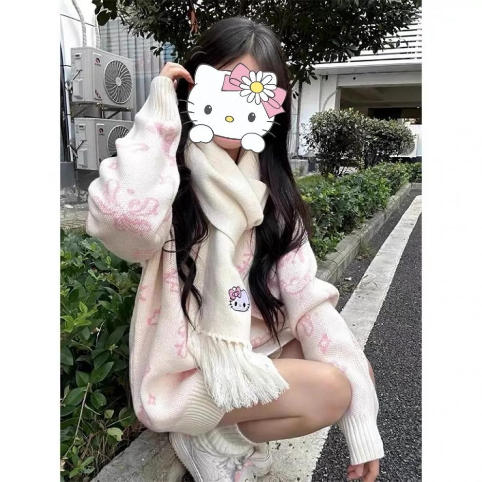 가을과 겨울 2 피스 일본식 만화 키티 고양이 크루 넥 스웨터 여성용 루즈 올 매치 스웨터 탑스토어 가기