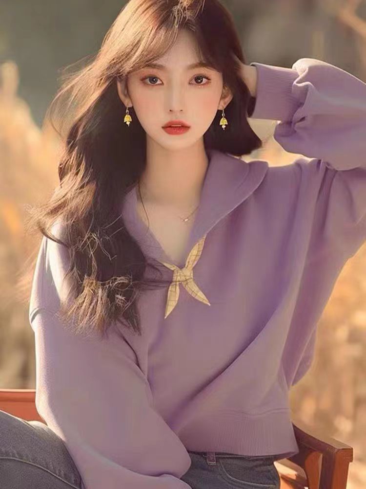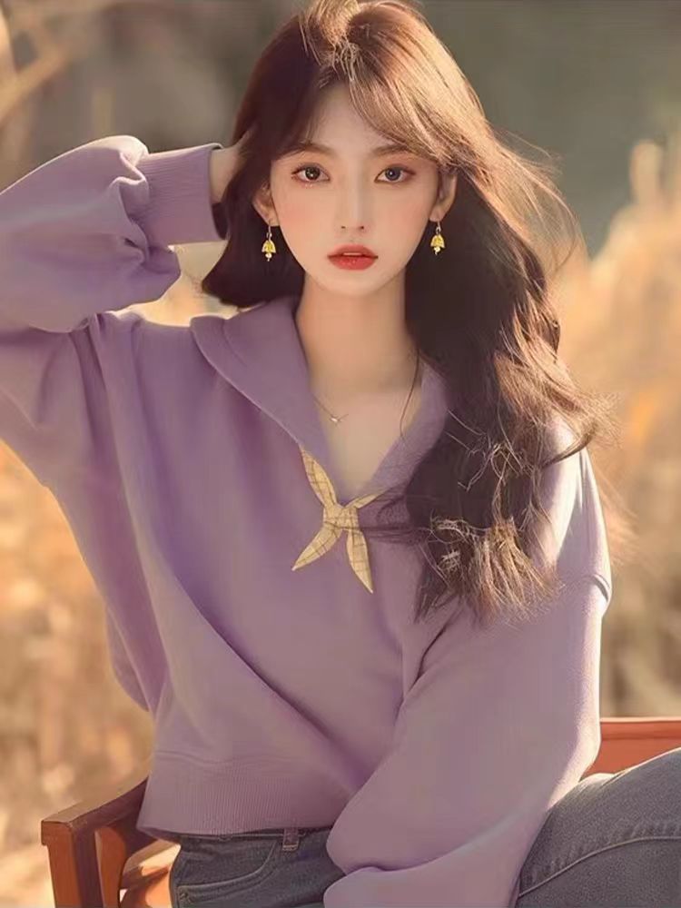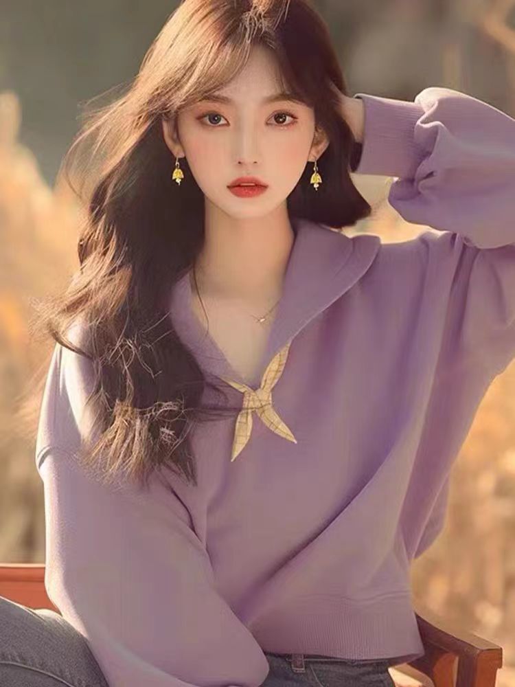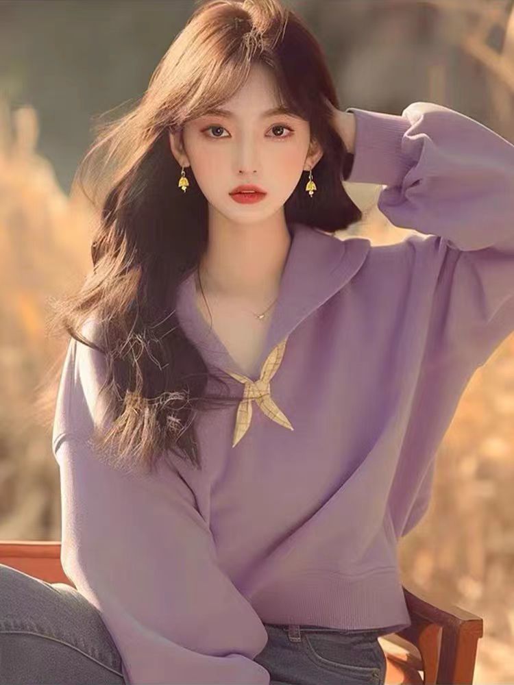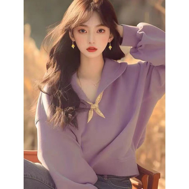 보라색 스웨트 셔츠 여성 폭발 봄과 가을 새로운 패션 슬리밍 세련된 느슨한 게으른 스타일 짧은 이른 가을 긴 소매 탑