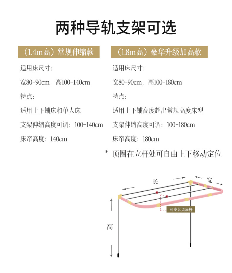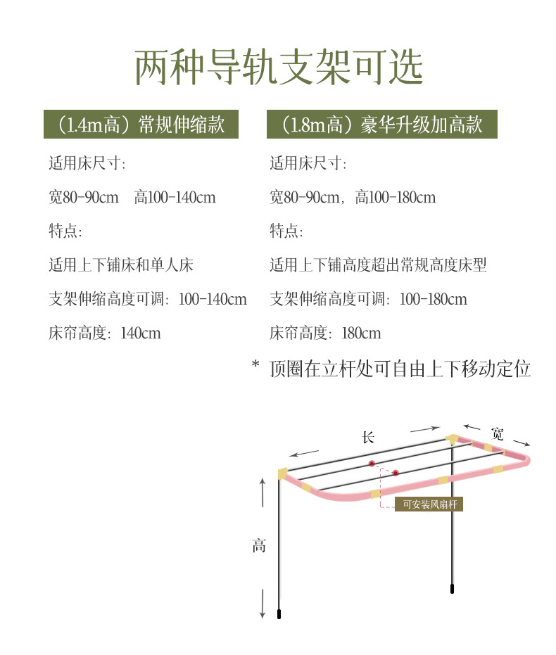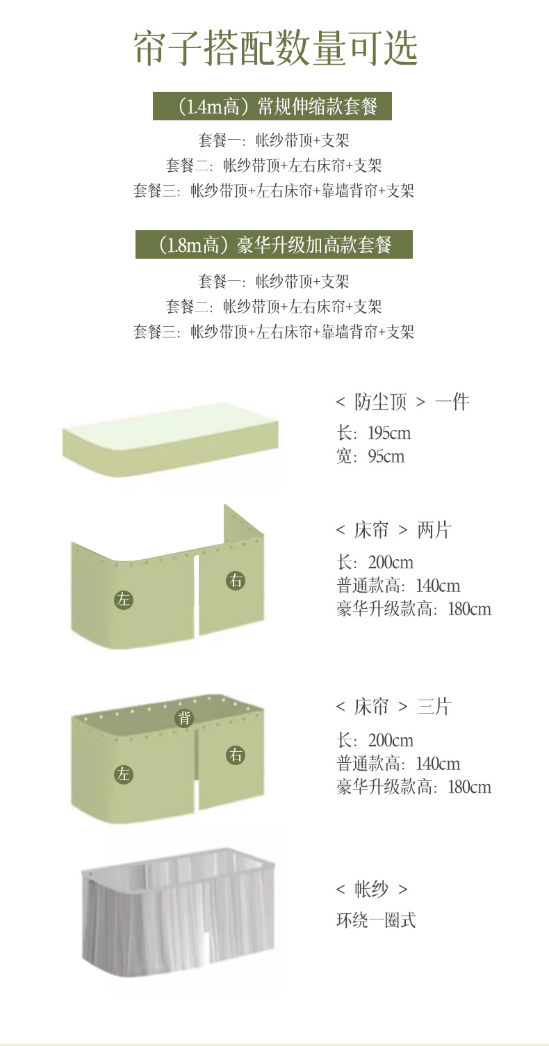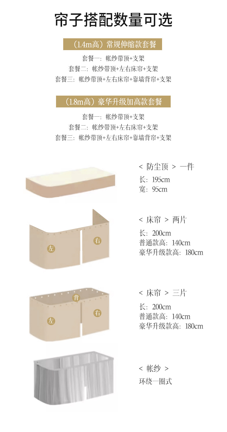 • 패키지 3(높이 1.8) 상단 + 왼쪽 및 오른쪽 커튼 + 벽 커튼 + 브래킷이 있는 모기장