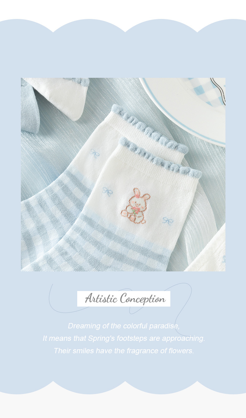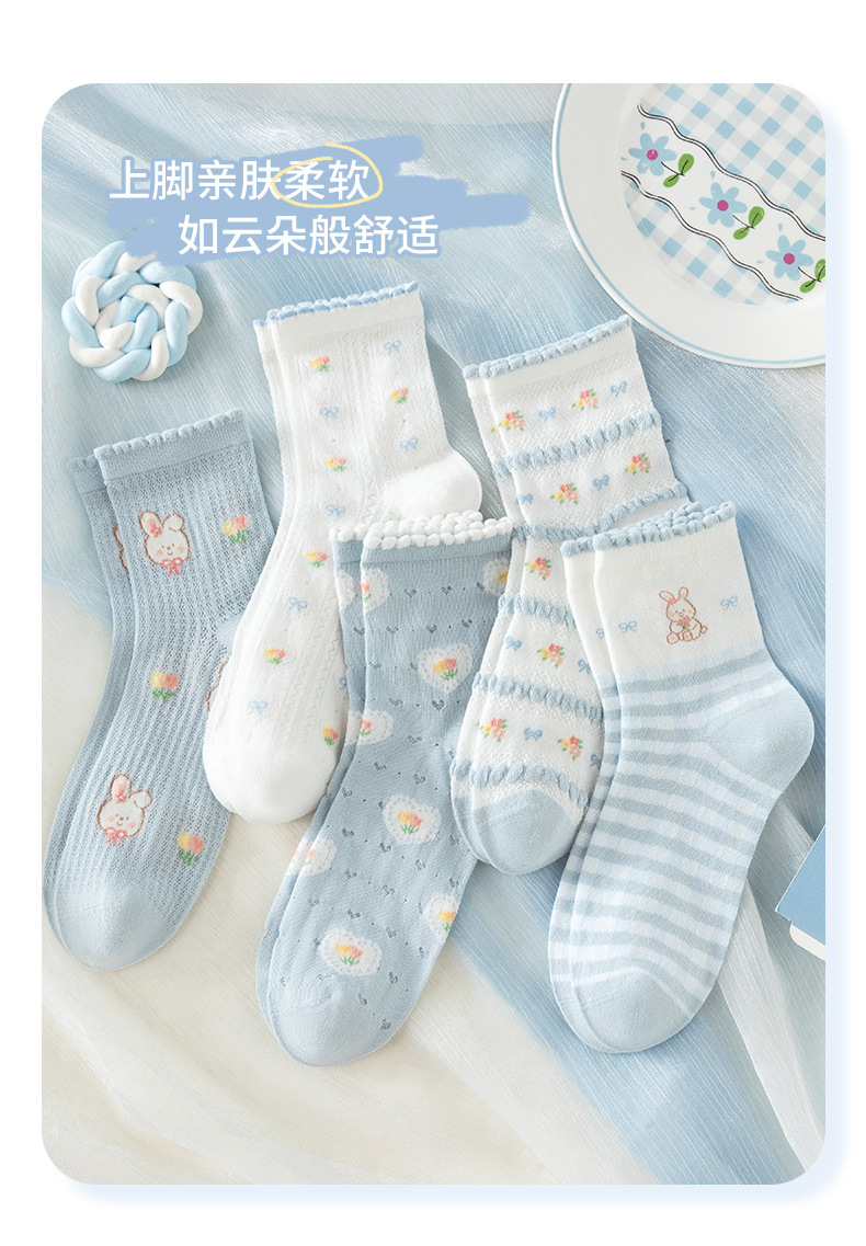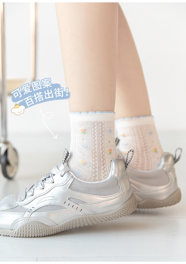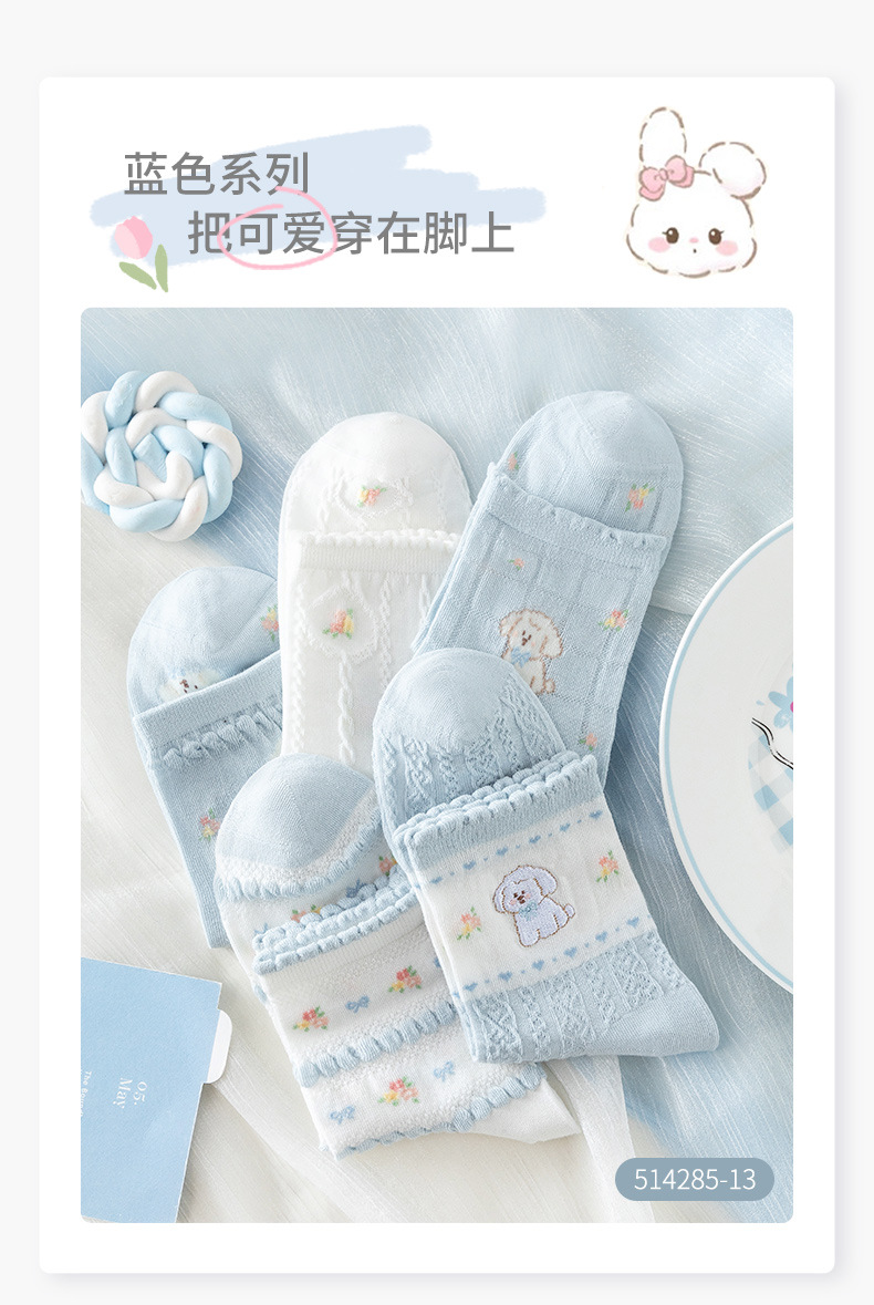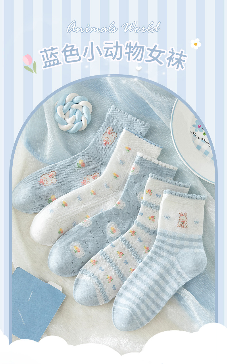 여성을위한 새로운 봄, 여름 양말 5 쌍 얇은 메쉬 짧은 양말 블루 레이스 만화 양말 귀여운 숙녀 양말