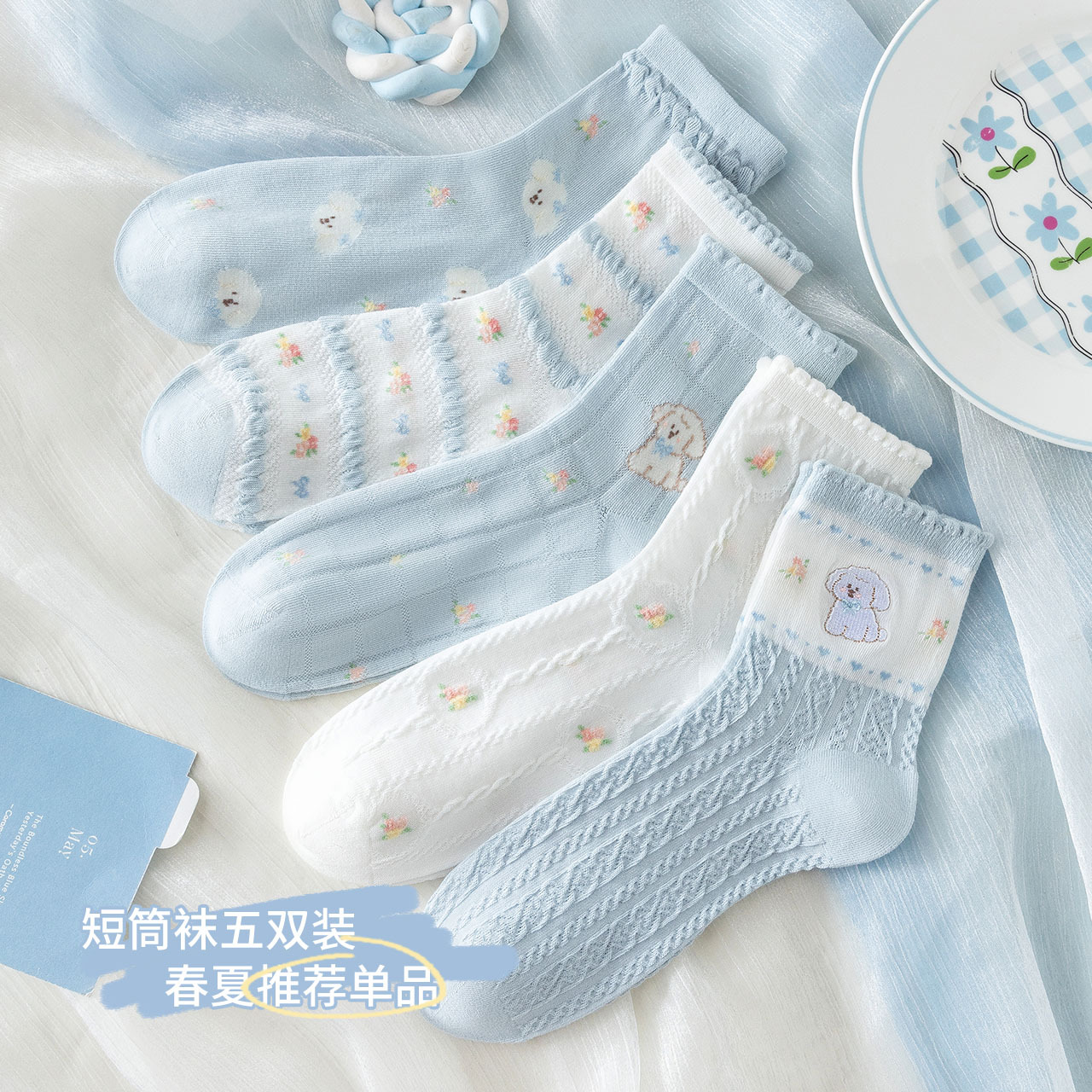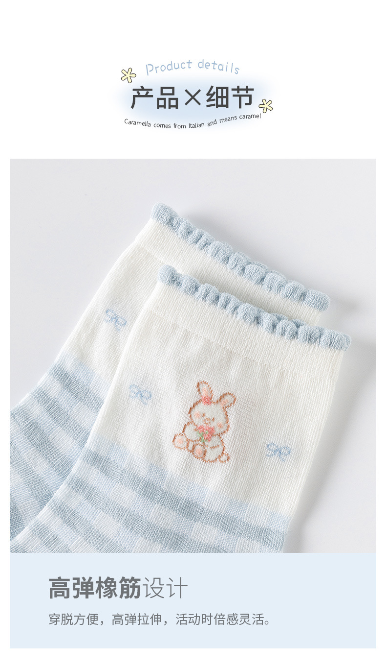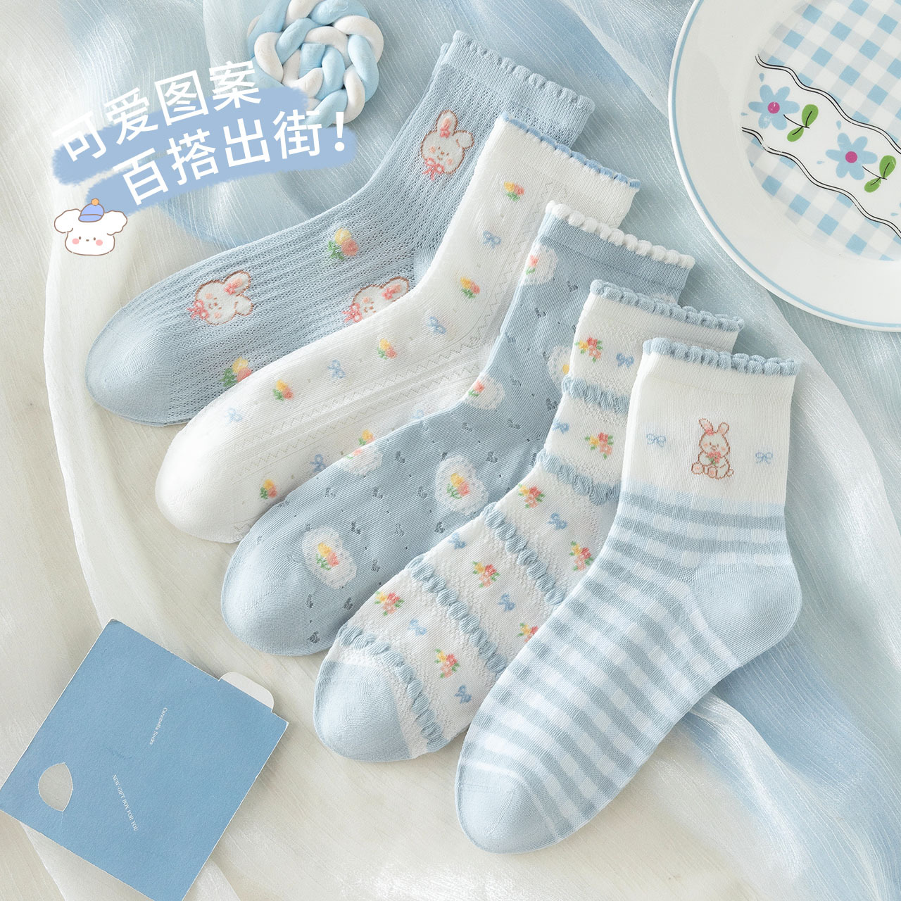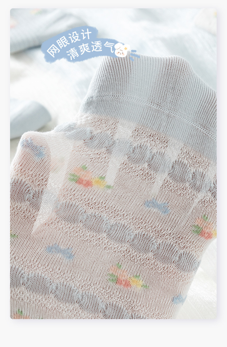 여성을위한 새로운 봄, 여름 양말 5 쌍 얇은 메쉬 짧은 양말 블루 레이스 만화 양말 귀여운 숙녀 양말