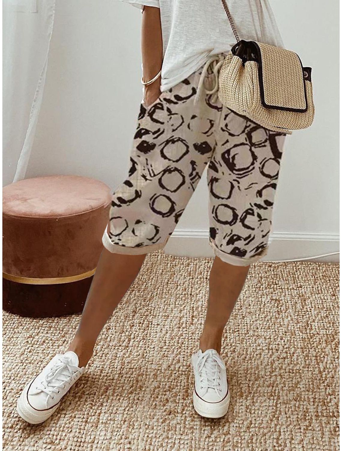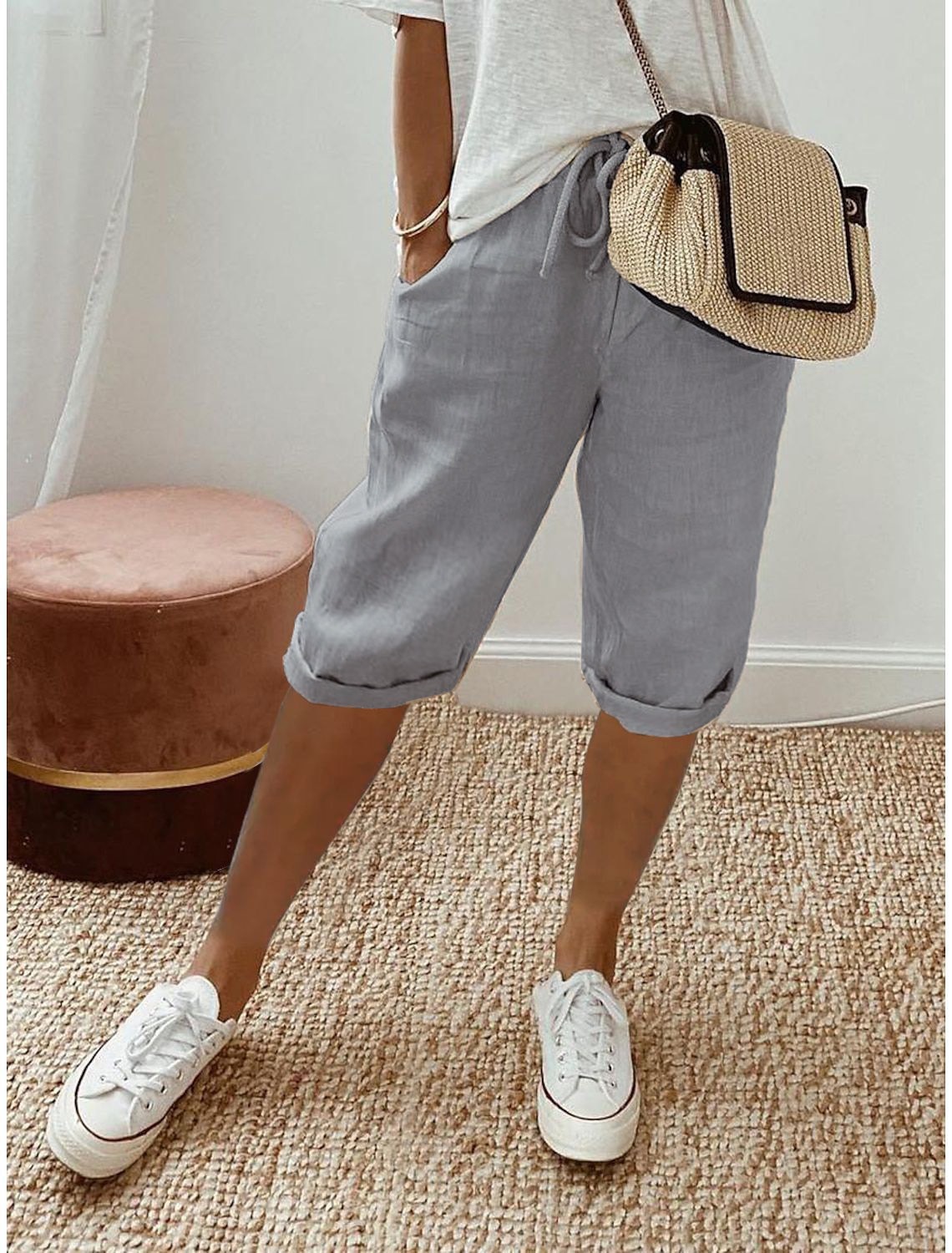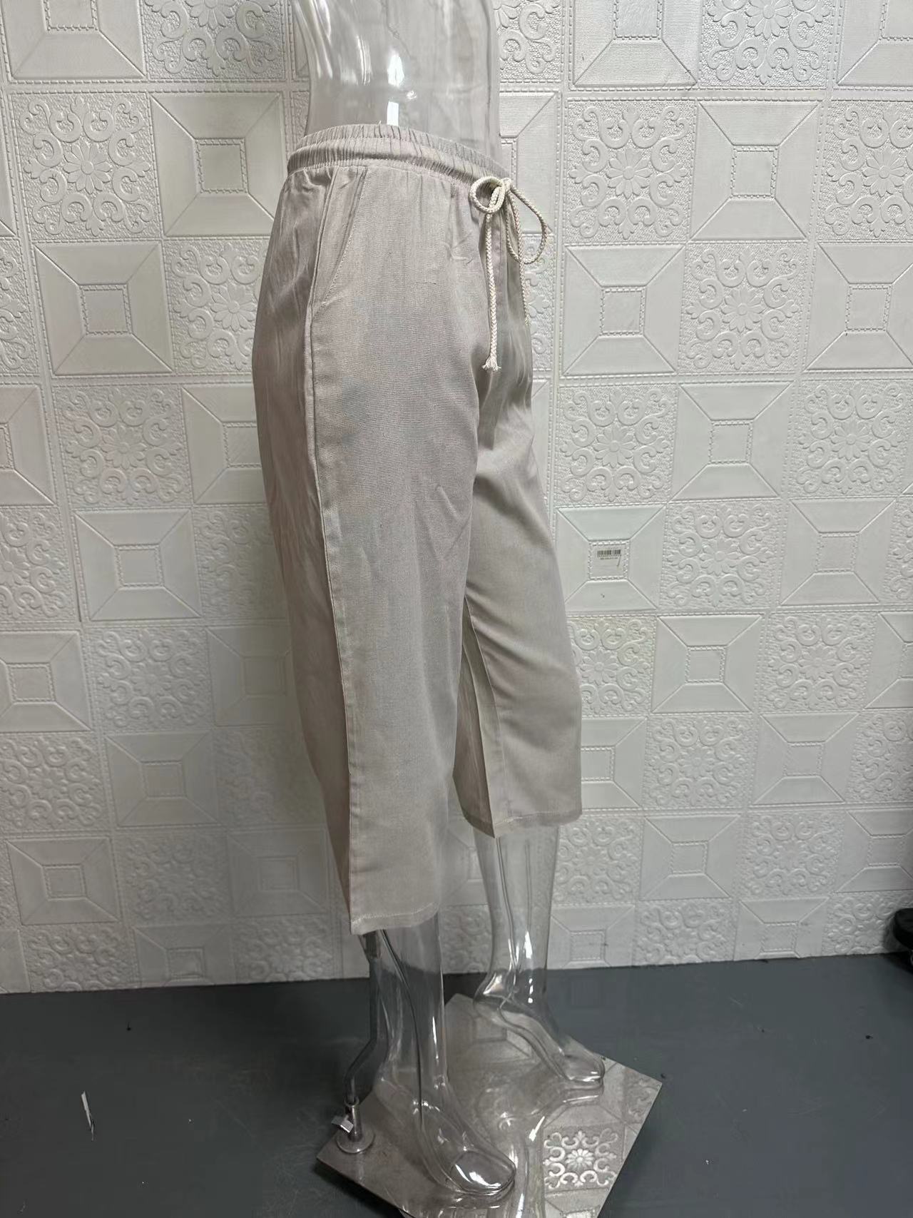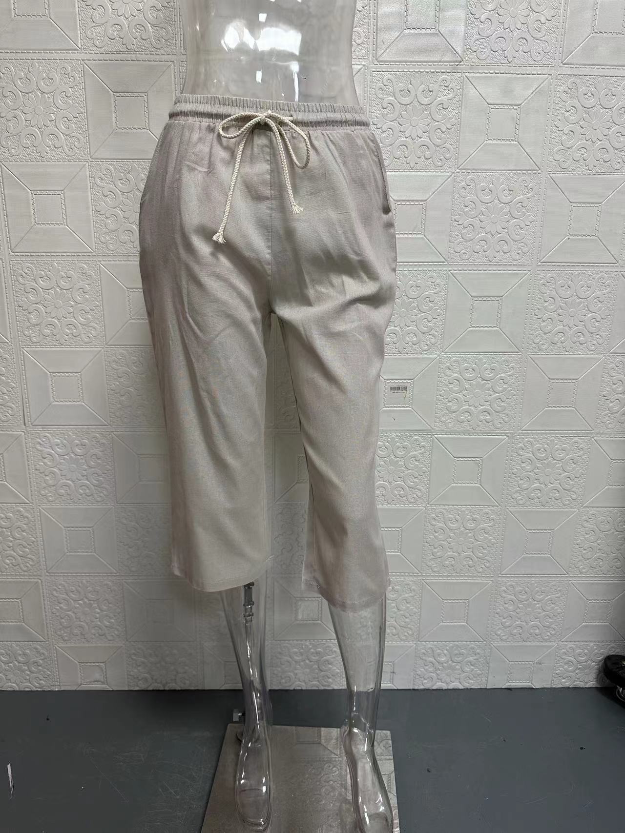 2025 새로운 크로스보더 아마존 패션 봄 여름 여성 면 및 린넨 포켓 신축성 캐주얼 바지 여성 바지 5부 바지스토어 가기