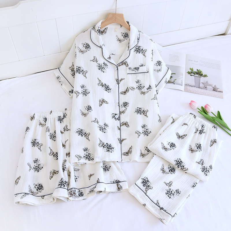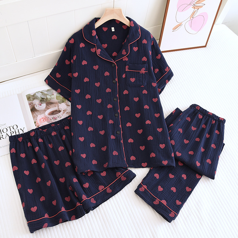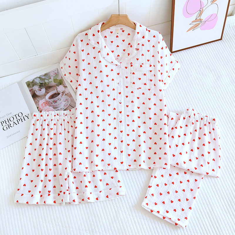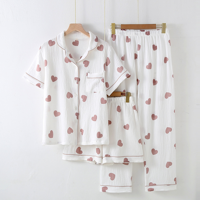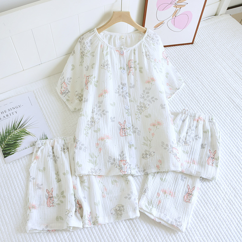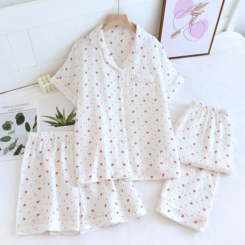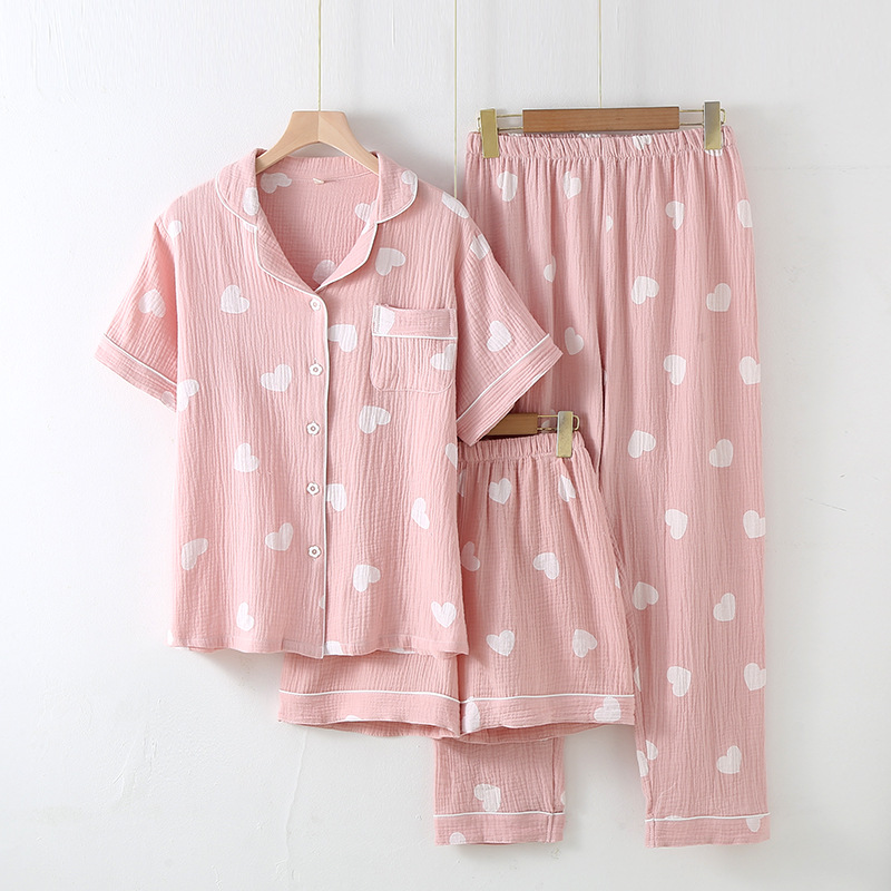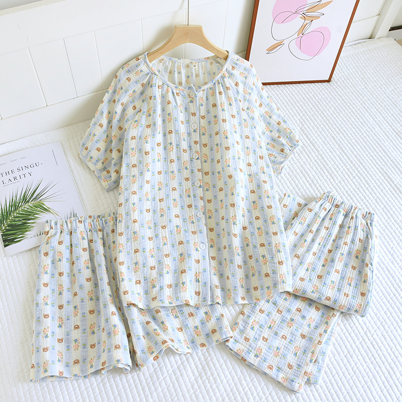 다양한 일본 달콤한 코튼 크레이프 여성 잠옷 3 피스 여름 코튼 짧은 소매 반바지 봄과 여름 세트스토어 가기