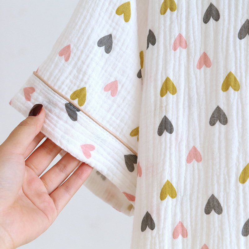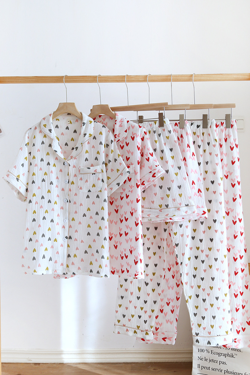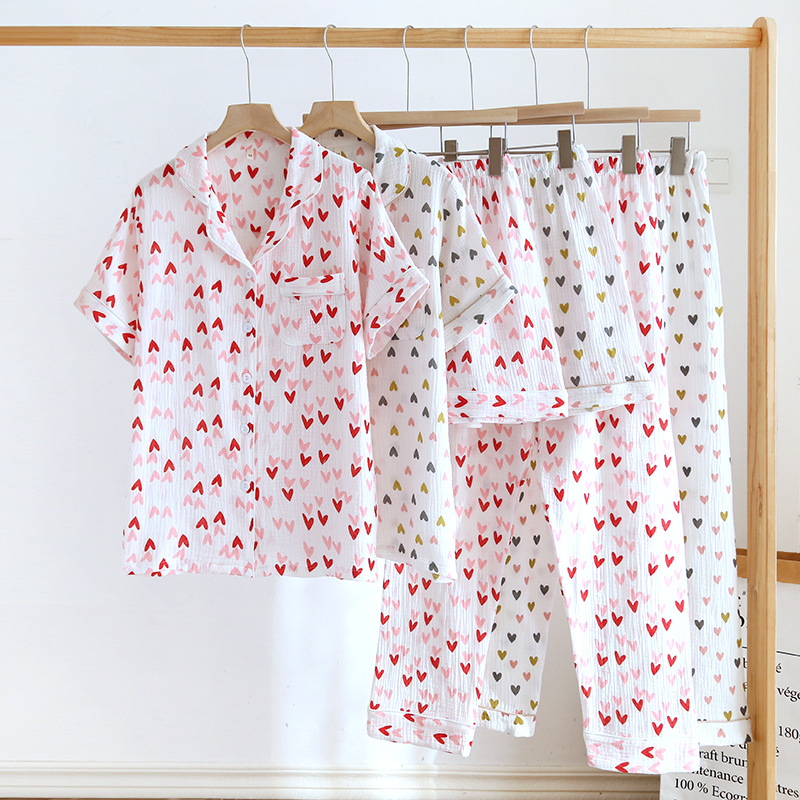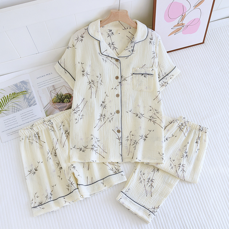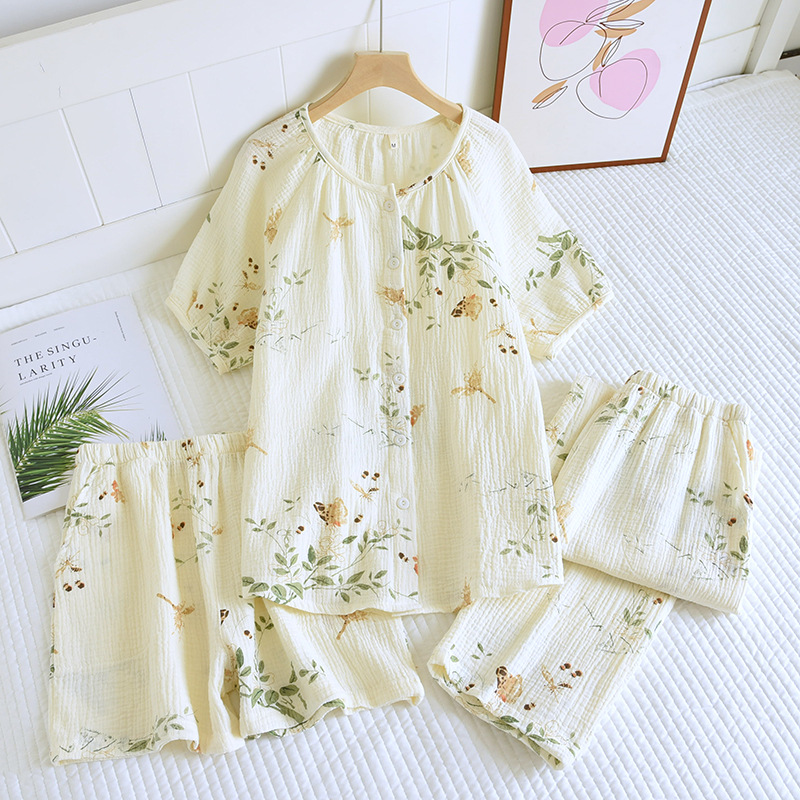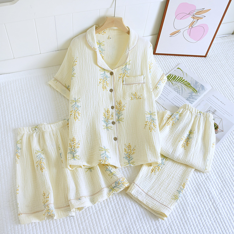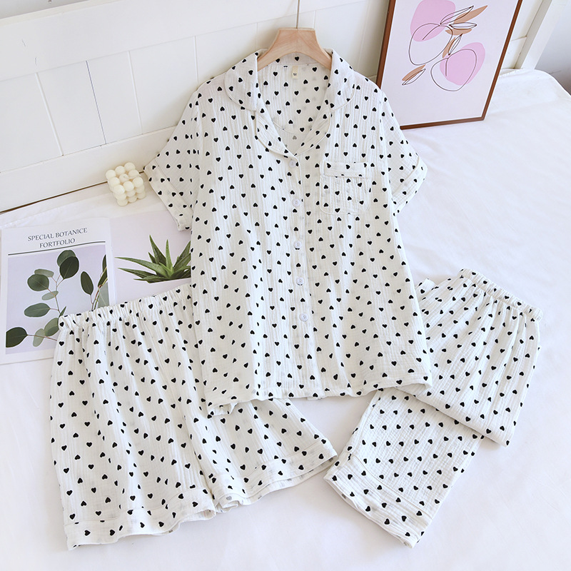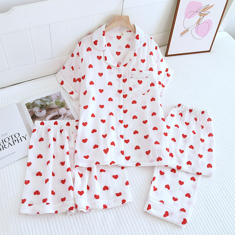 다양한 일본 달콤한 코튼 크레이프 여성 잠옷 3 피스 여름 코튼 짧은 소매 반바지 봄과 여름 세트스토어 가기
