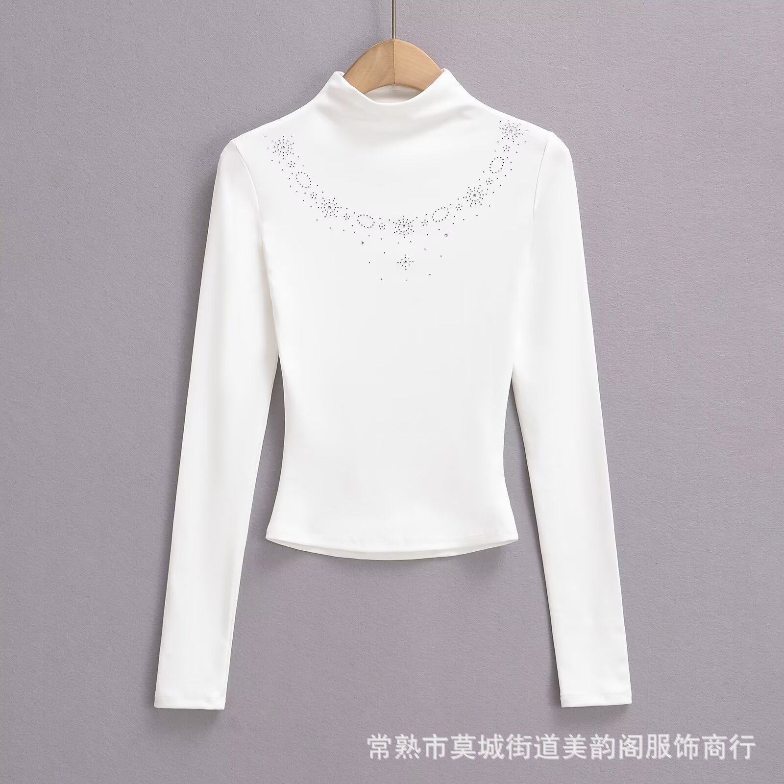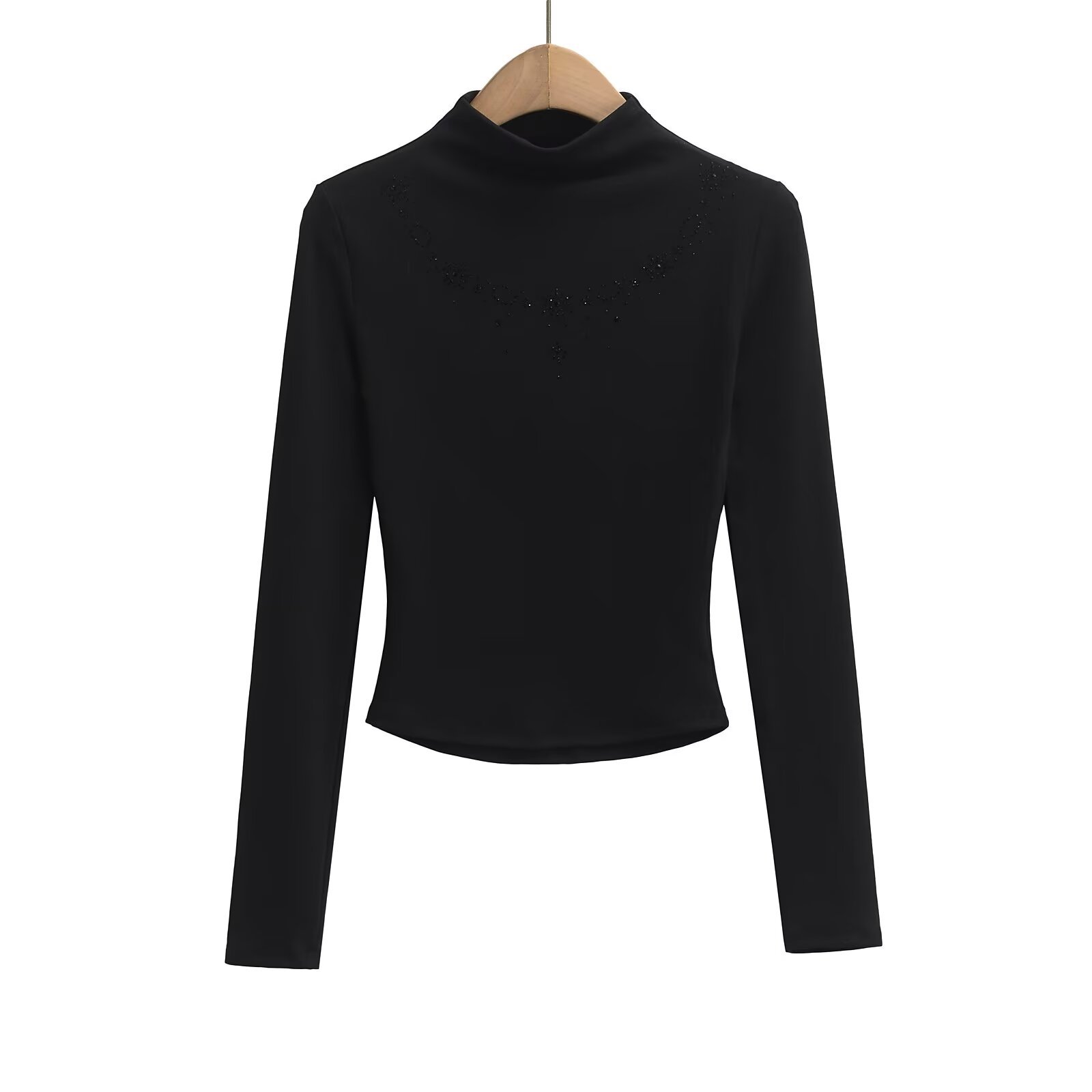 UC & ZA 국경 아마존 유럽과 미국 여성의 새로운 섹시한 슬림 핏 핫 드릴링 세미 하이 넥 베이스 착용 긴 소매 티셔츠스토어 가기