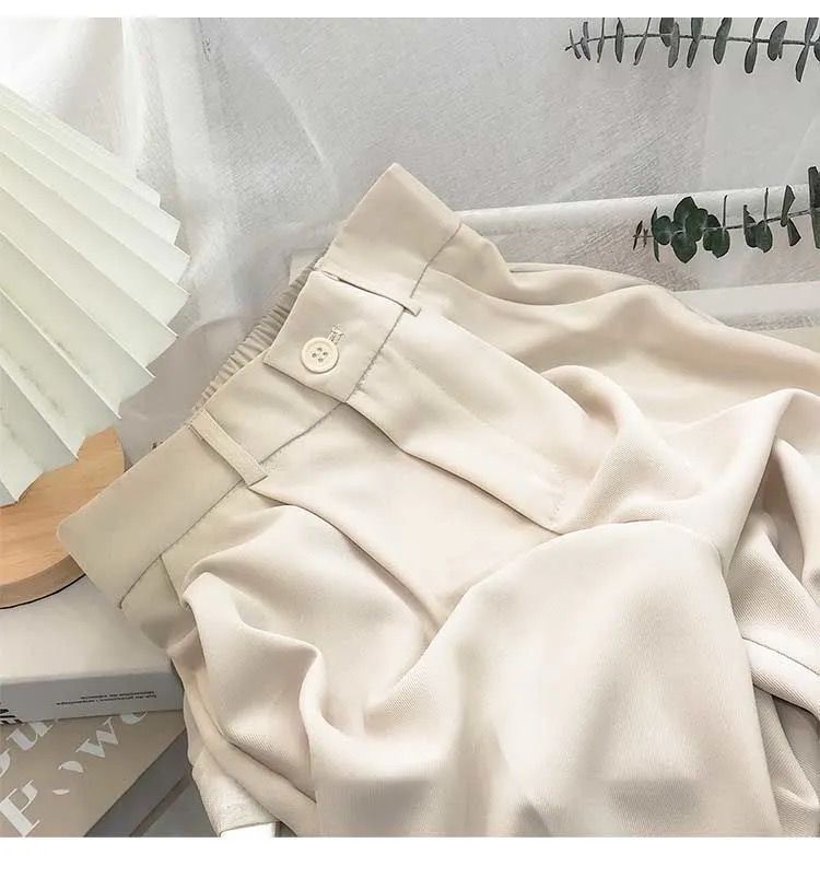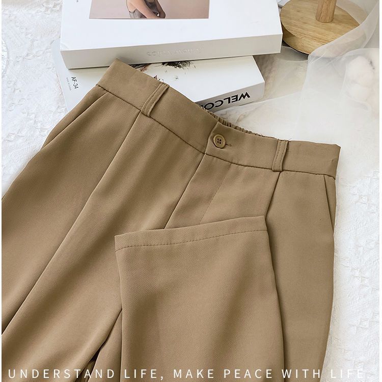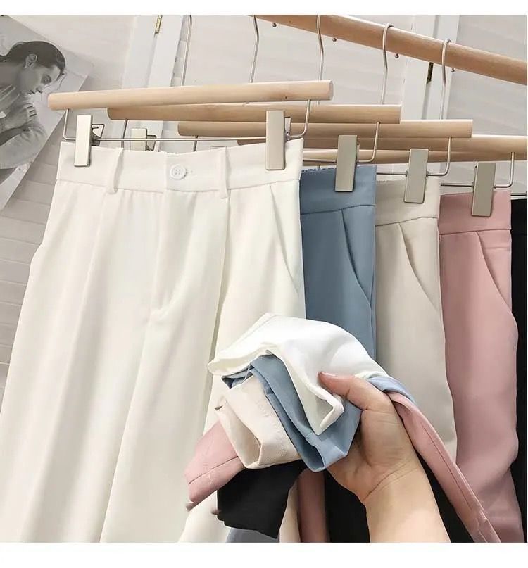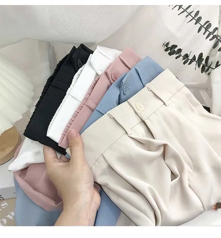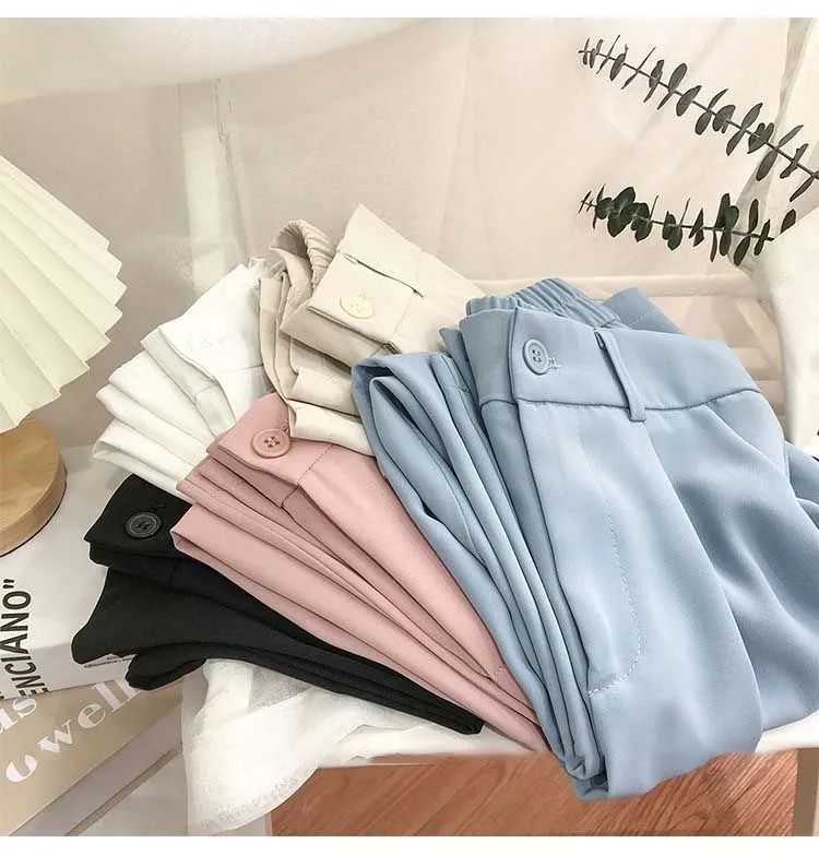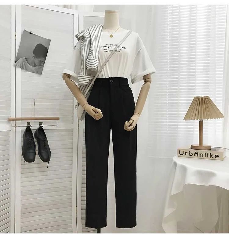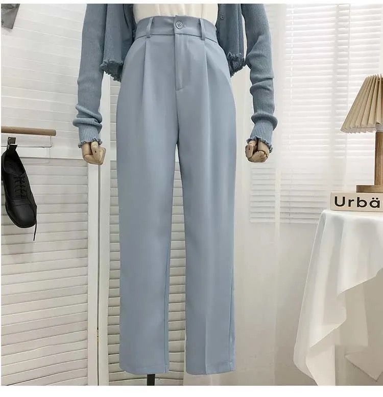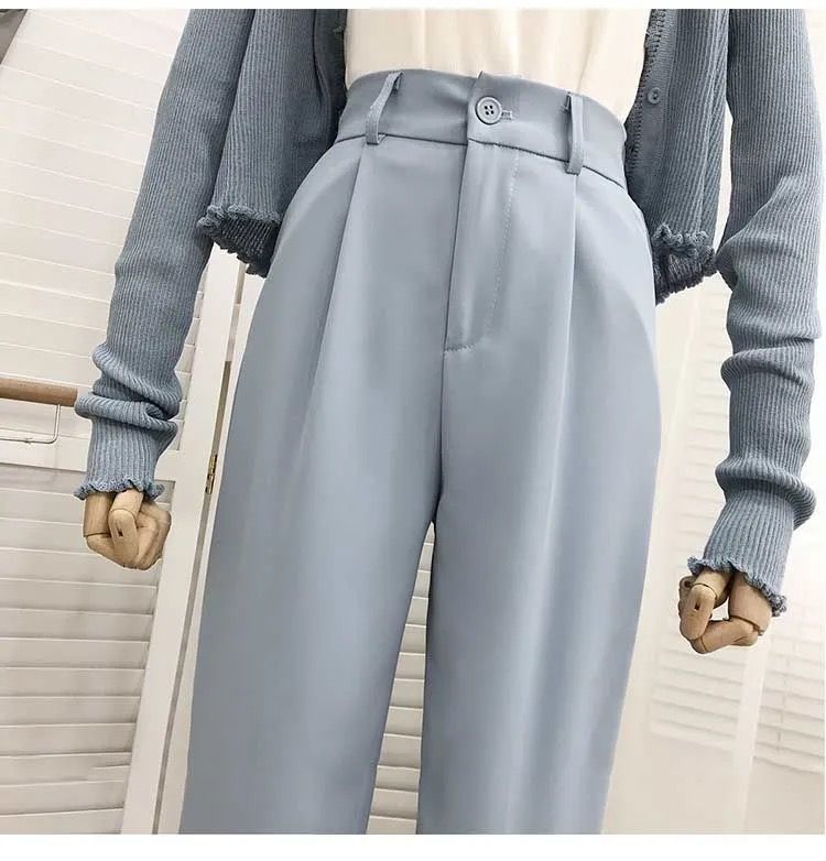 봄과 여름을위한 여성용 한국식 세트 바지 최신 하이 웨이스트 슬리밍 스트레이트 팬츠 헐렁한 크롭 캐주얼 파이프 팬츠스토어 가기