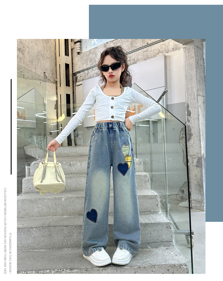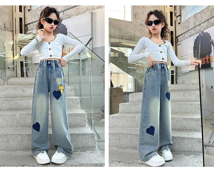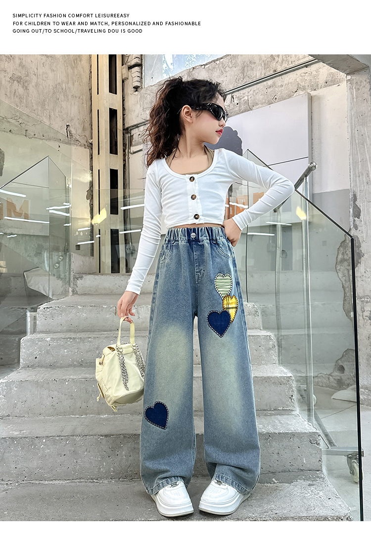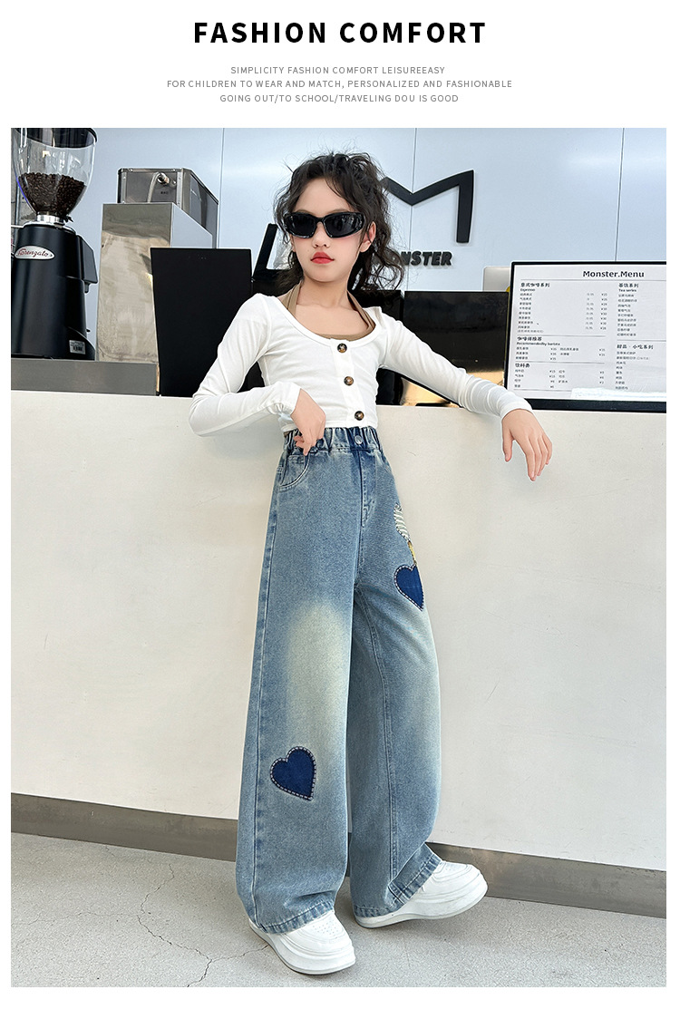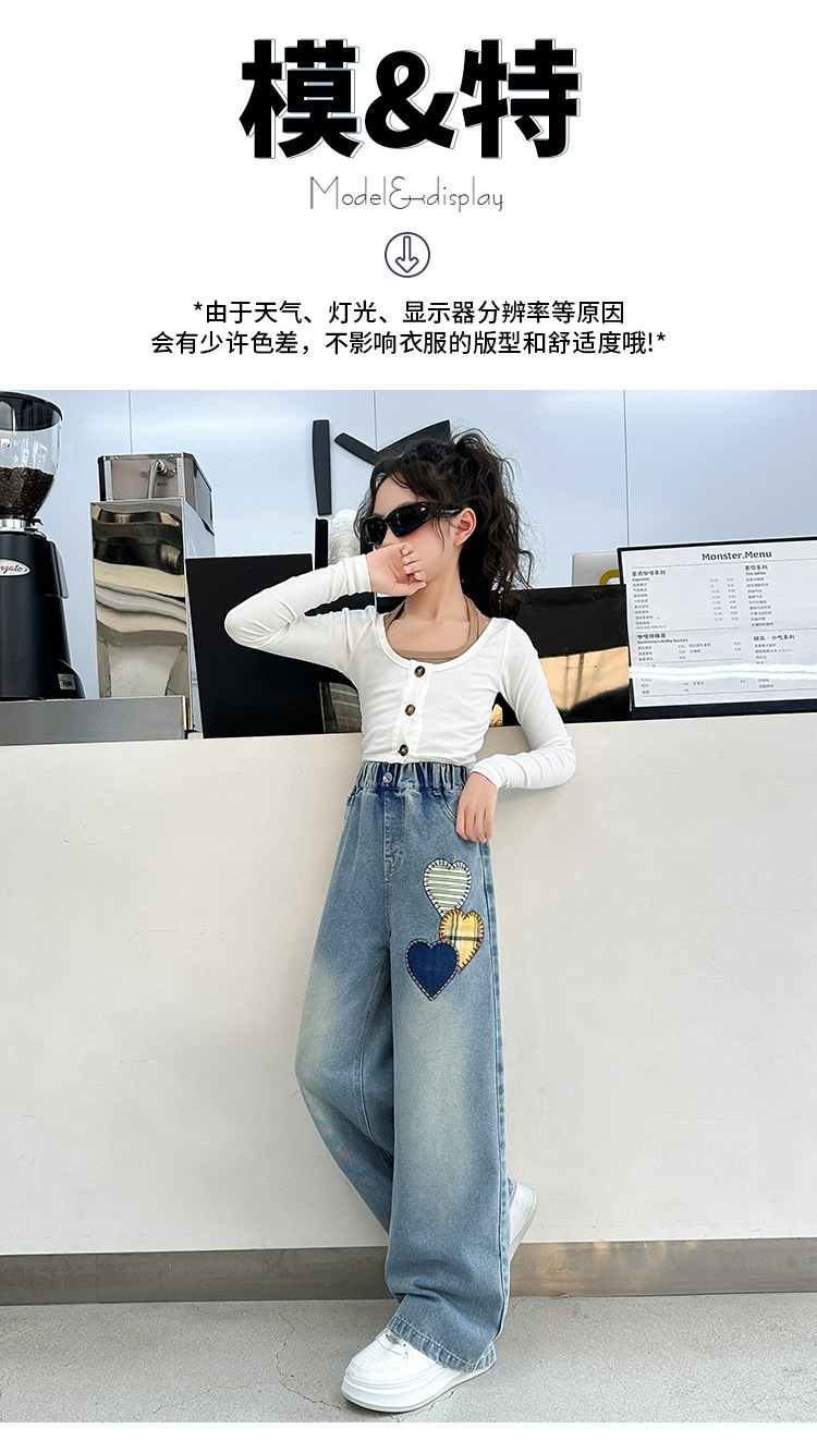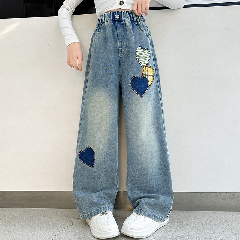 여자 바지 봄 느슨한 한국 스타일 어린이 서양식 올매치 여자 중학교 스트레이트 다리 청바지 Huzhou Zhili