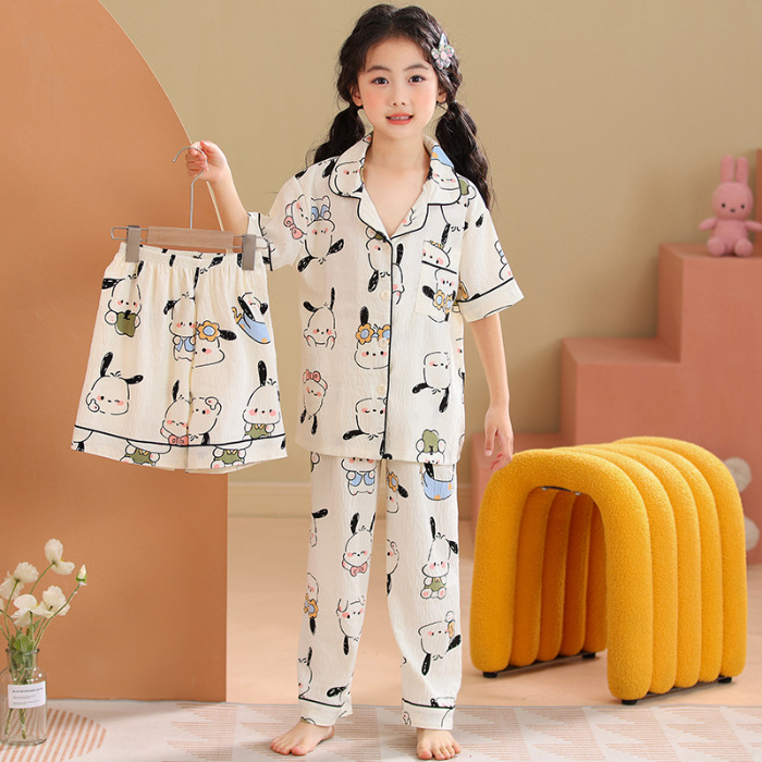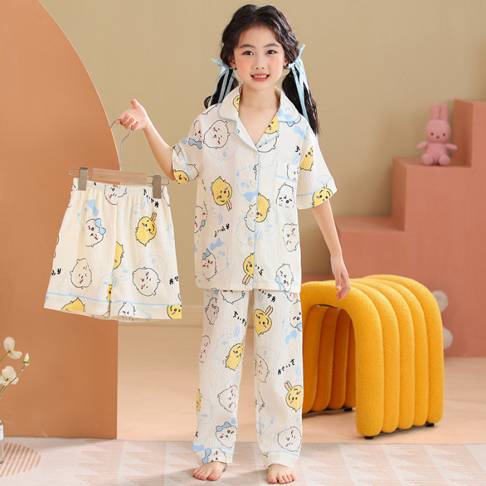 소녀 잠옷 구름 면화 여름 세 조각 세트 어린이 반팔 바지 얇은 소녀 중 큰 어린이 부모 자식 잠옷 집