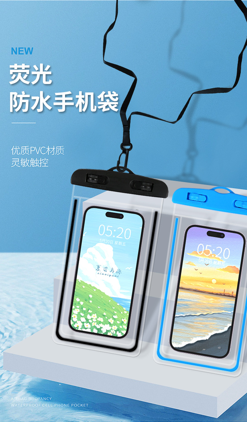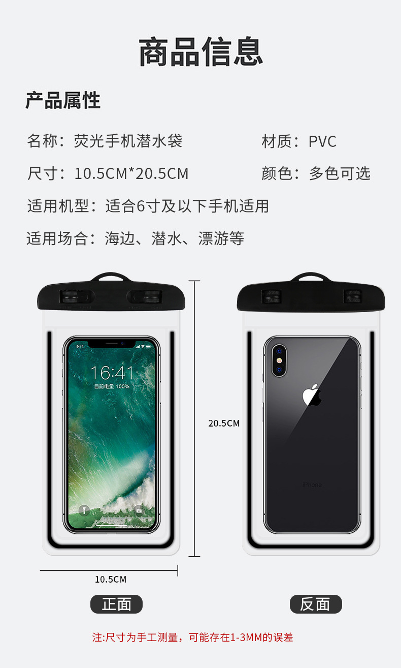 투명한 터치 스크린 휴대 전화 케이스 야외 온천 수영 다이빙 빛나는 방수 케이스 PVC 형광 휴대 전화 방수 가방