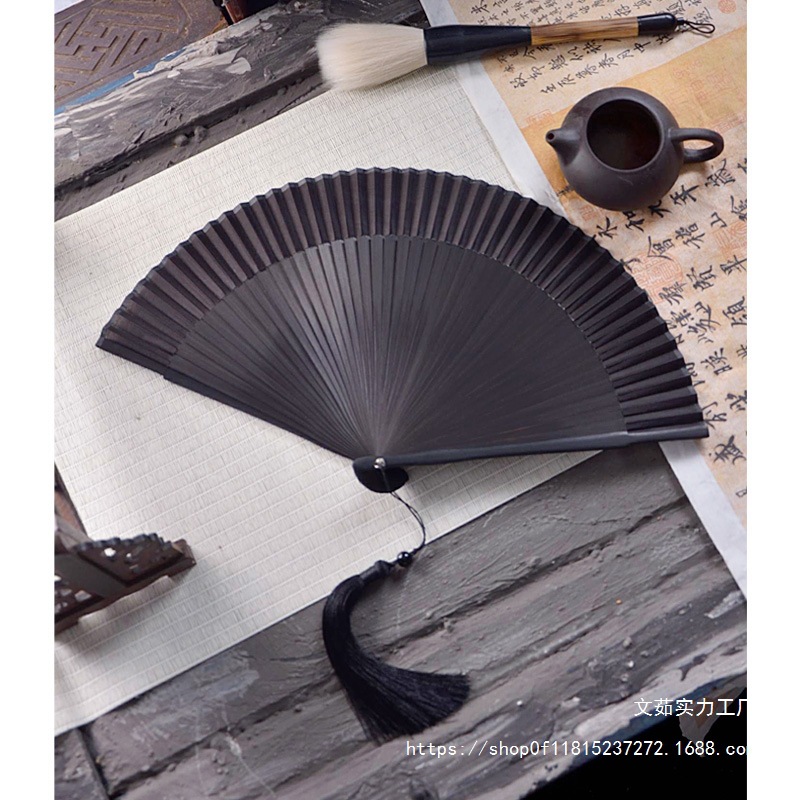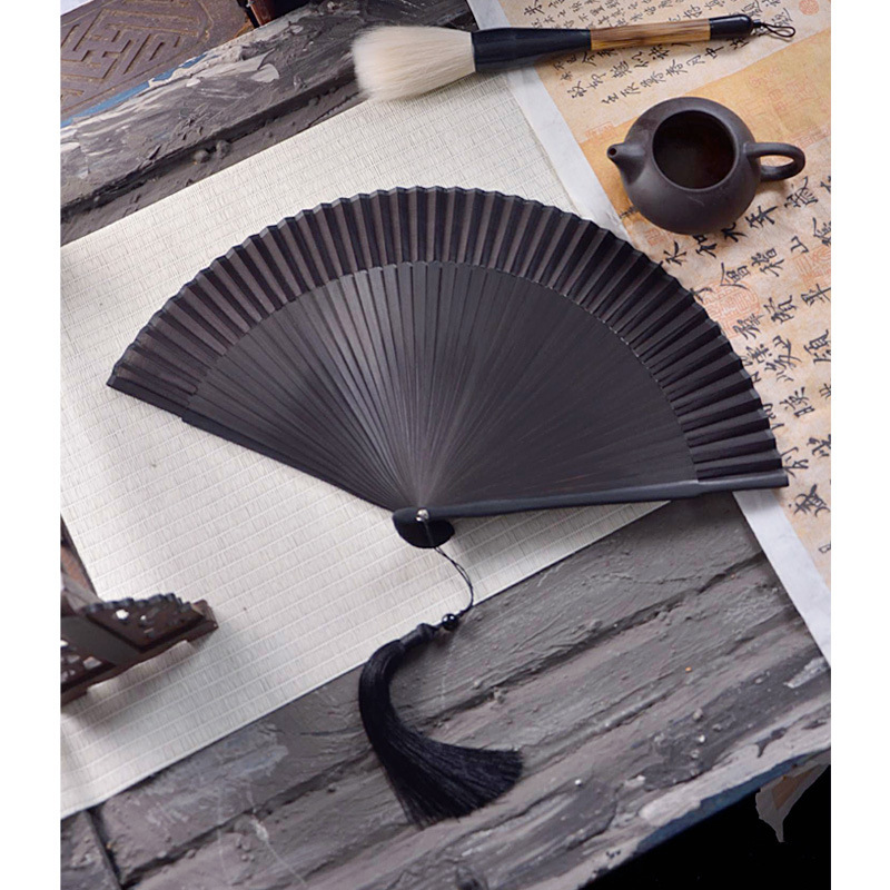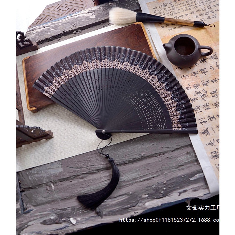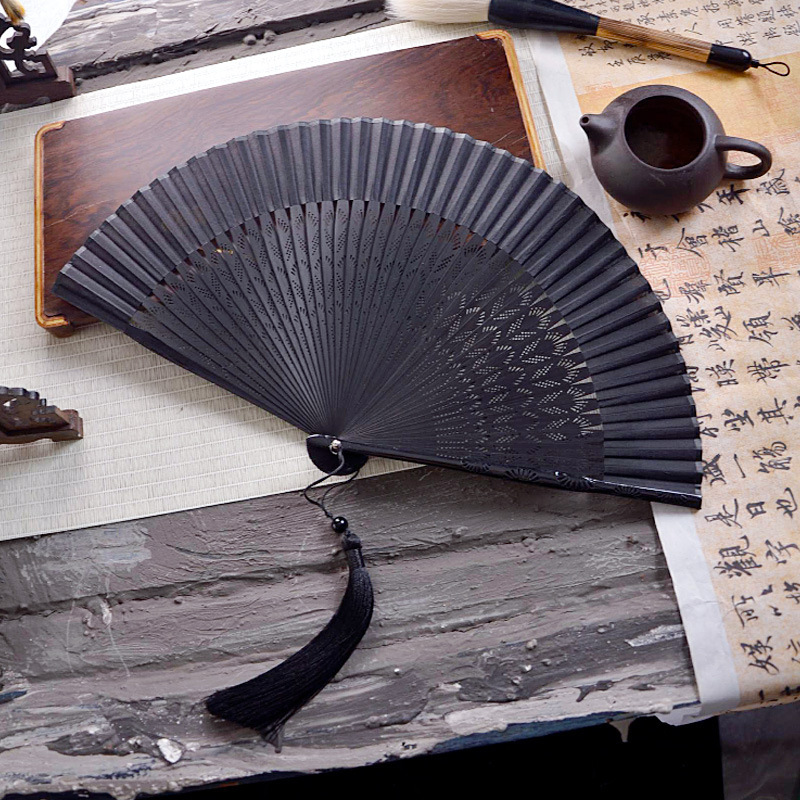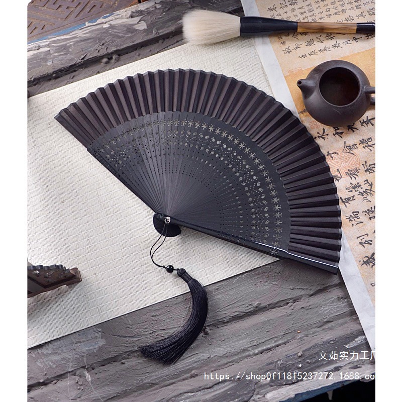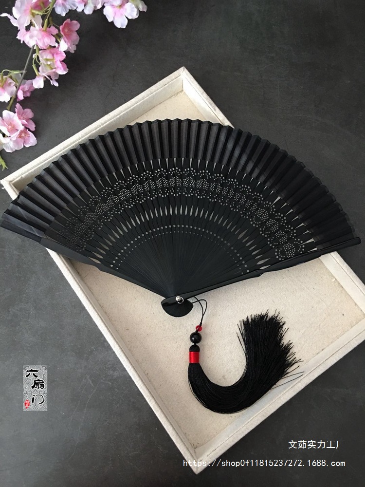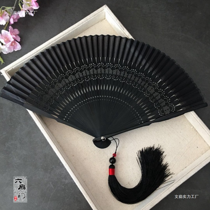 중국 스타일 풀 대나무 조각 빈 팬 일본 스타일 솔리드 컬러 블랙 팬 고대 스타일 청삼 여름 댄스 팬 남녀스토어 가기