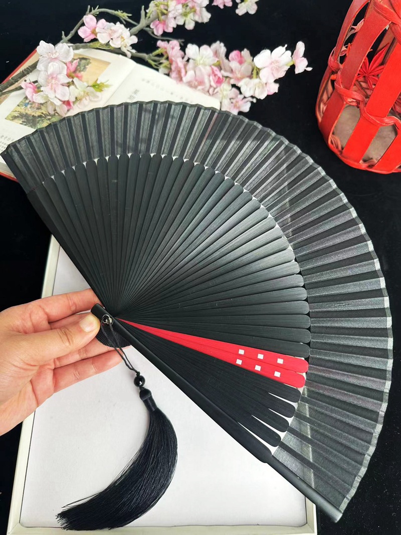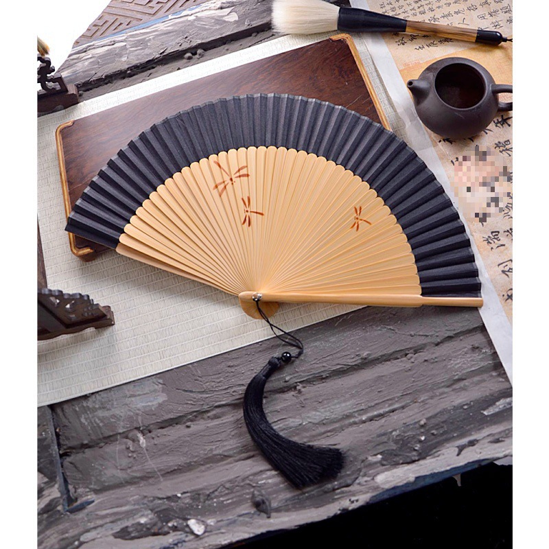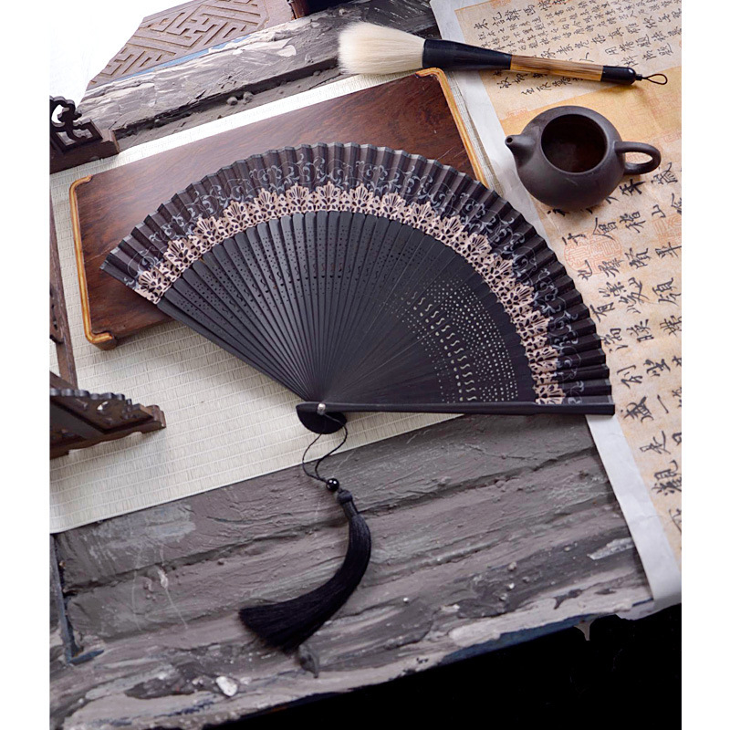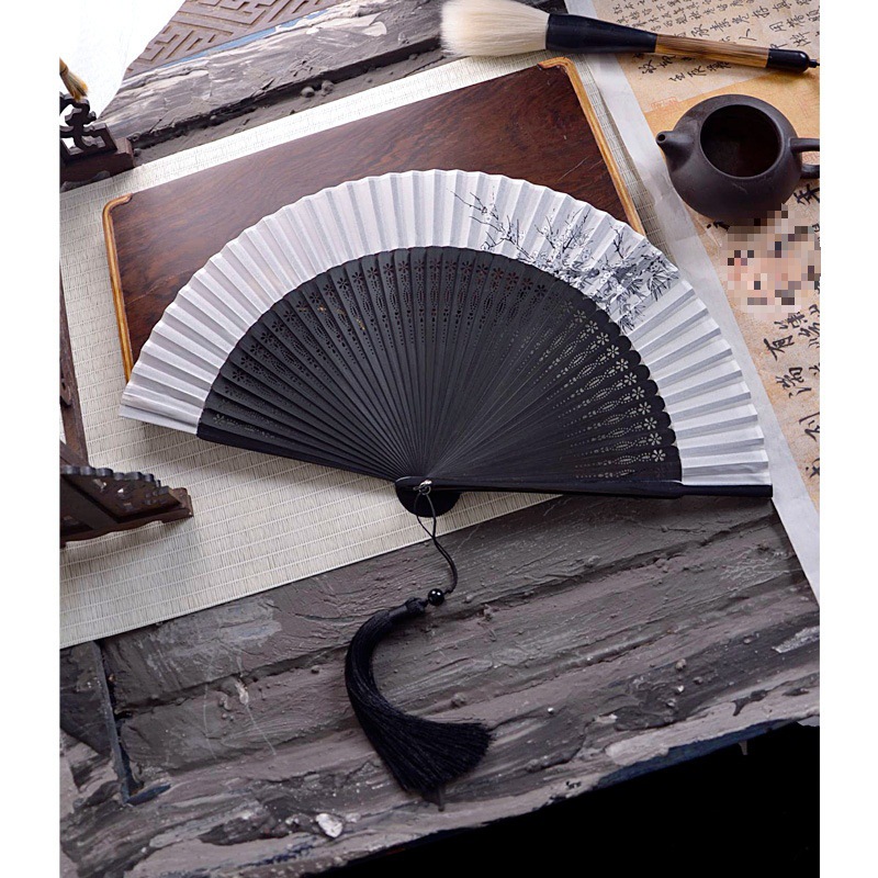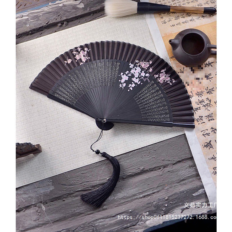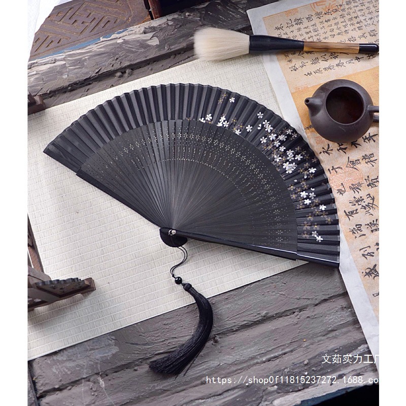 중국 스타일 풀 대나무 조각 빈 팬 일본 스타일 솔리드 컬러 블랙 팬 고대 스타일 청삼 여름 댄스 팬 남녀스토어 가기