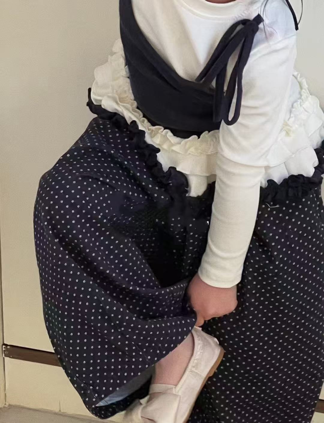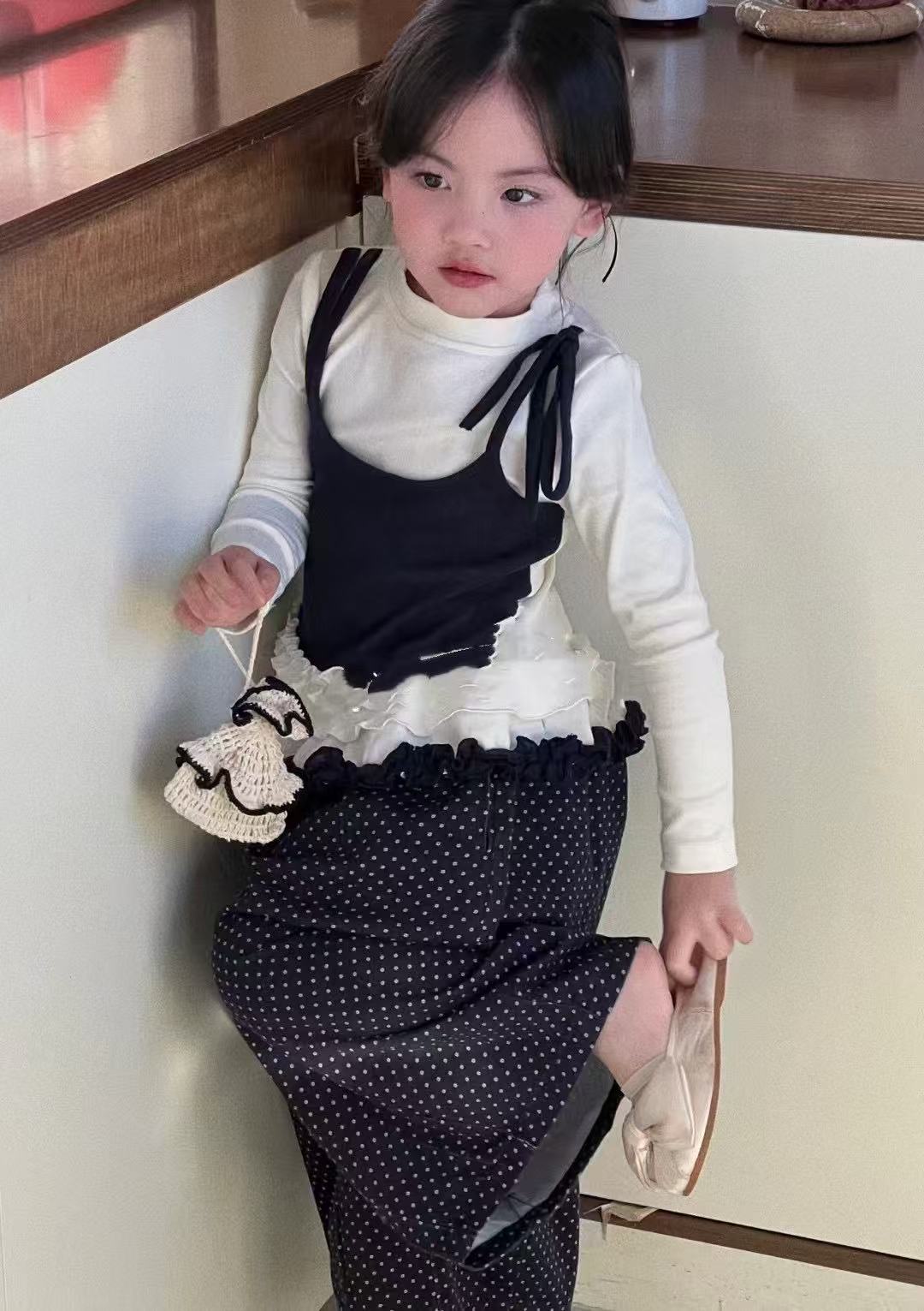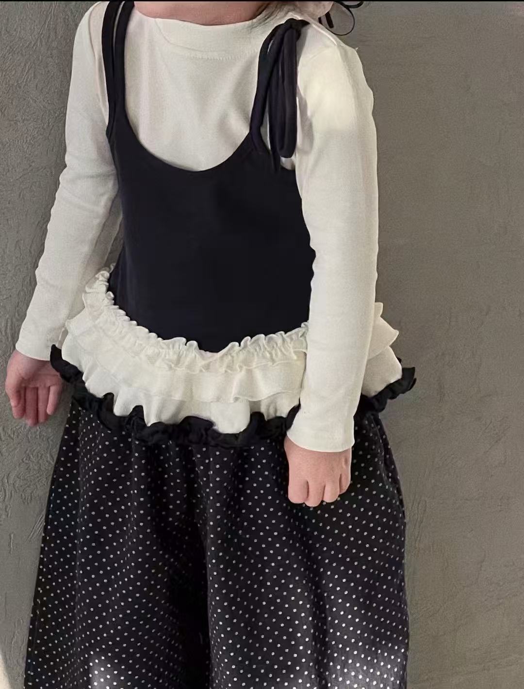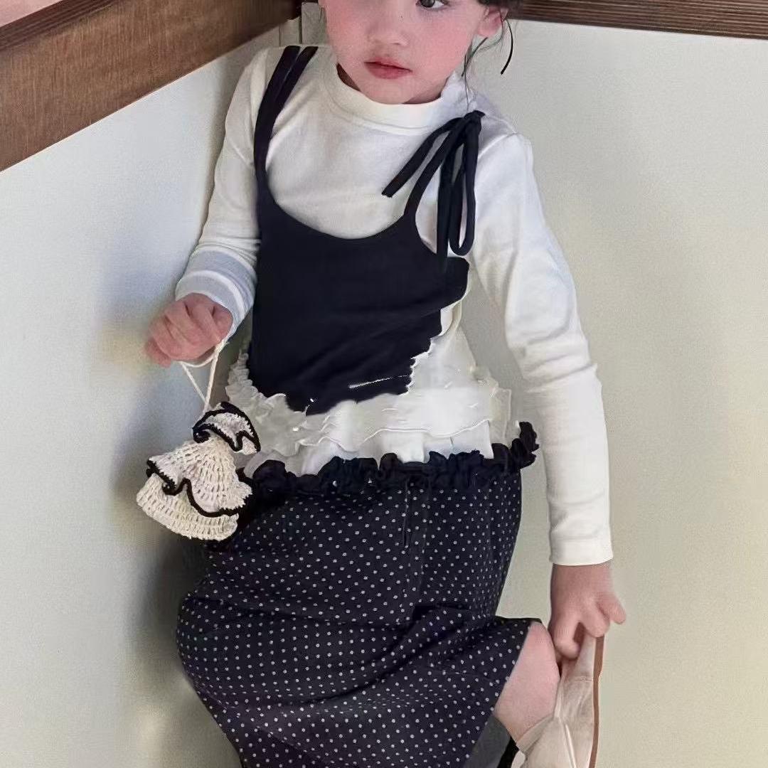 소녀 긴팔 보토밍 셔츠 봄과 가을 소녀 슬링 바느질 티셔츠 폴도트 와이드 다리 바지 세트