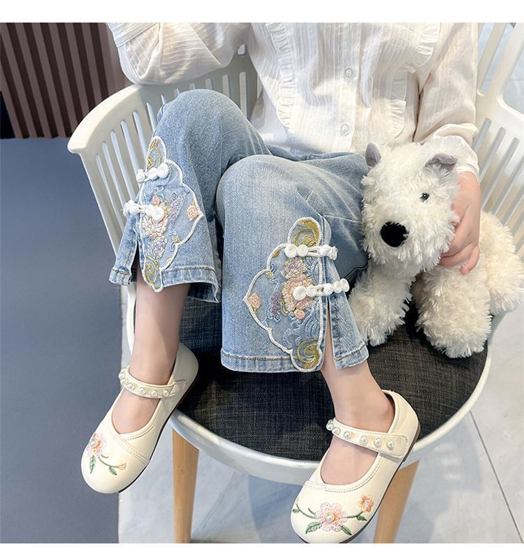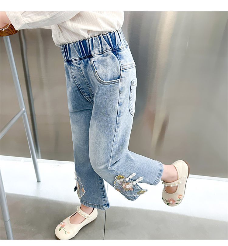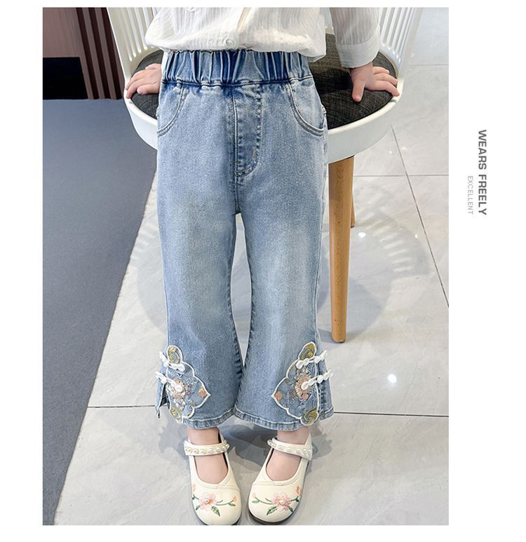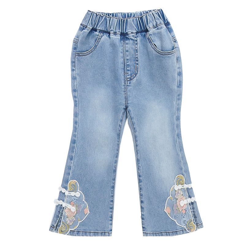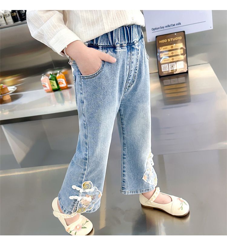 소녀 바지 2025 봄 새 스타일 프라이드 스트리트 어린이 새로운 중국 스타일 국가 스타일 경적 바지 아기 소녀 청바지 봄과 여름