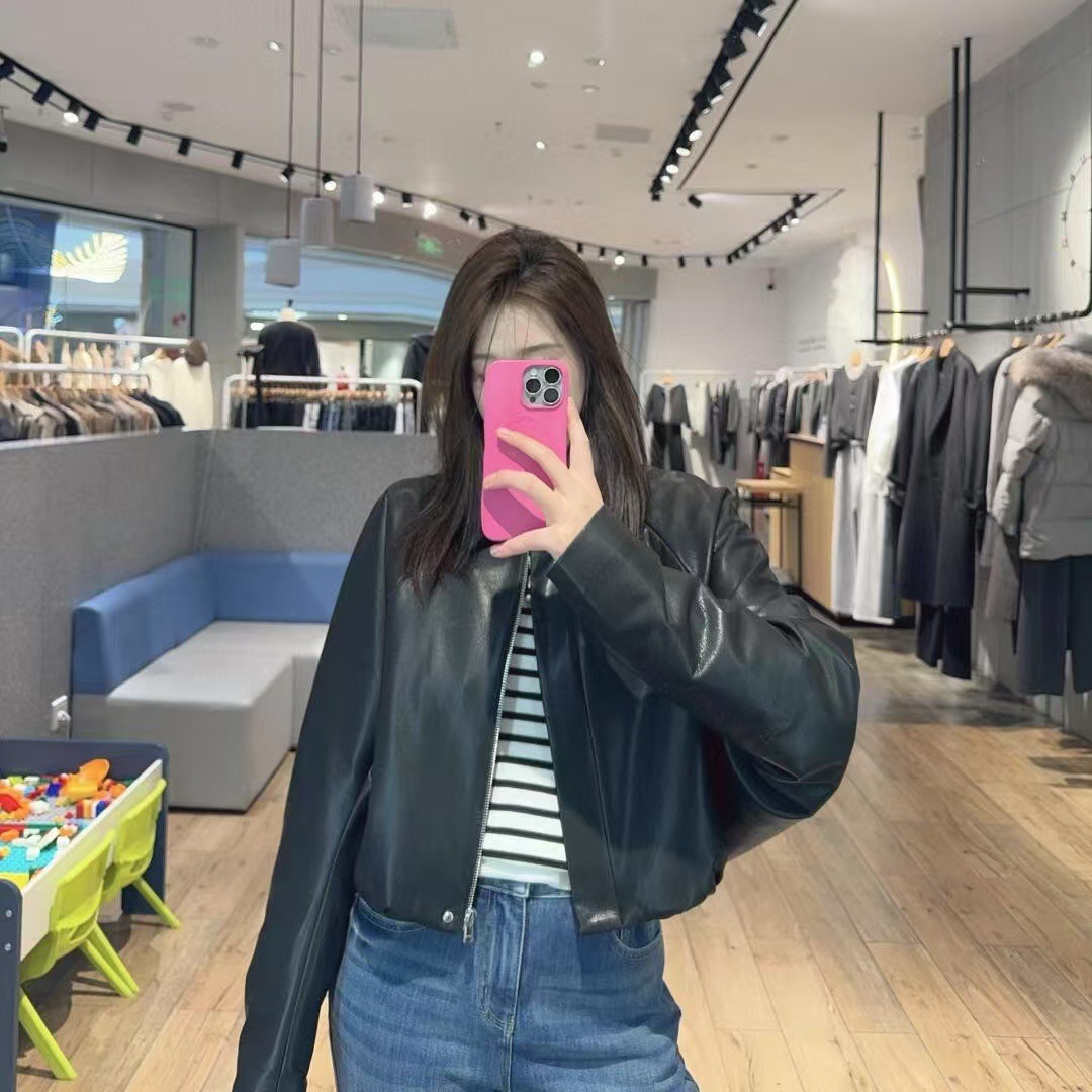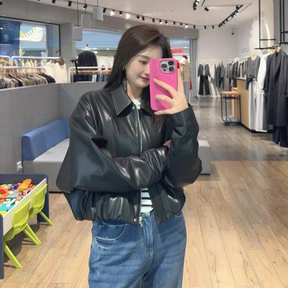 재고 2025 봄 새로운 우아한 블랙 짧은 PU 가죽 부드러운 옷깃 가죽 코트 여성 5G2110651스토어 가기