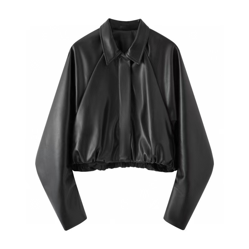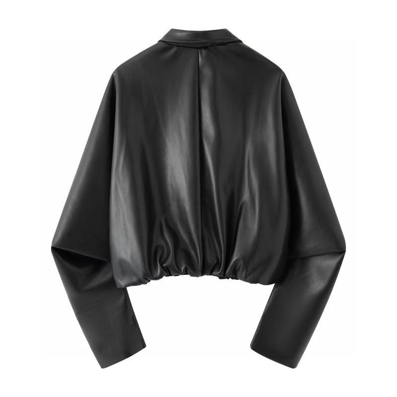 재고 2025 봄 새로운 우아한 블랙 짧은 PU 가죽 부드러운 옷깃 가죽 코트 여성 5G2110651