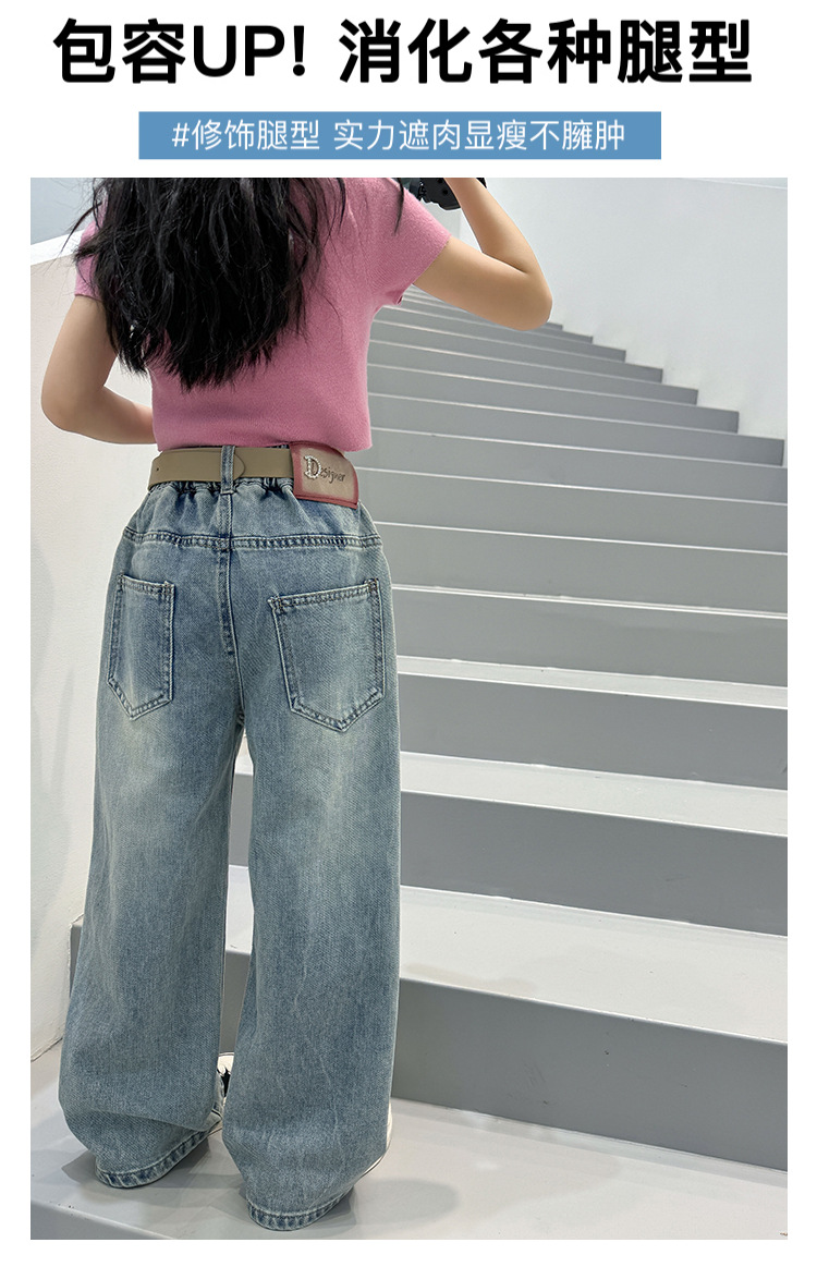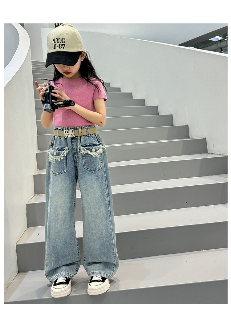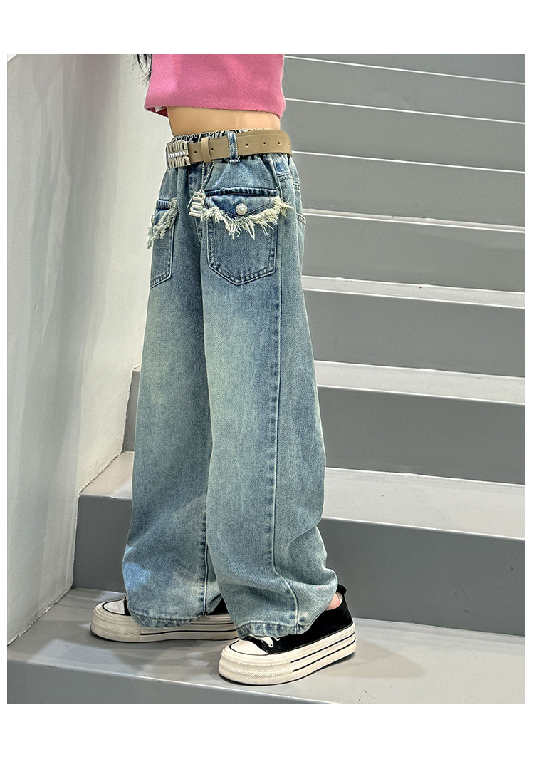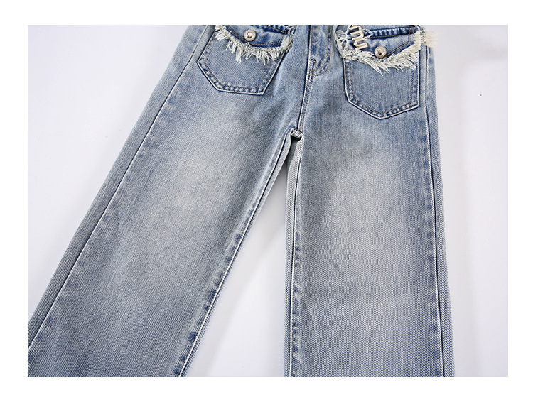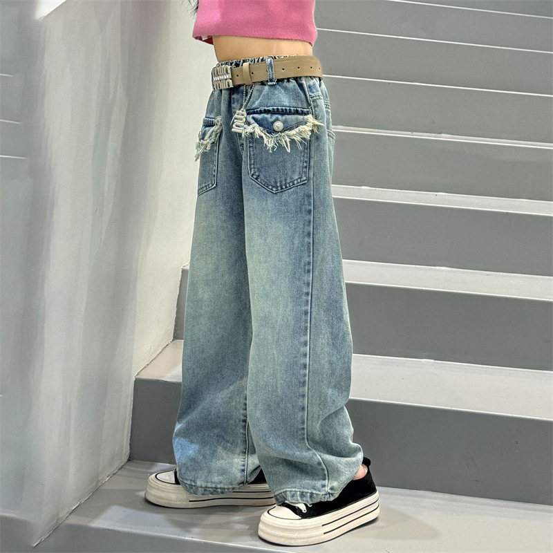 소녀 바지 봄 거친 가장자리 유행 한국 스타일 어린이 서양식 올매치 소녀의 스트레이트 데님 와이드 다리 바지 Huzhou Zhili