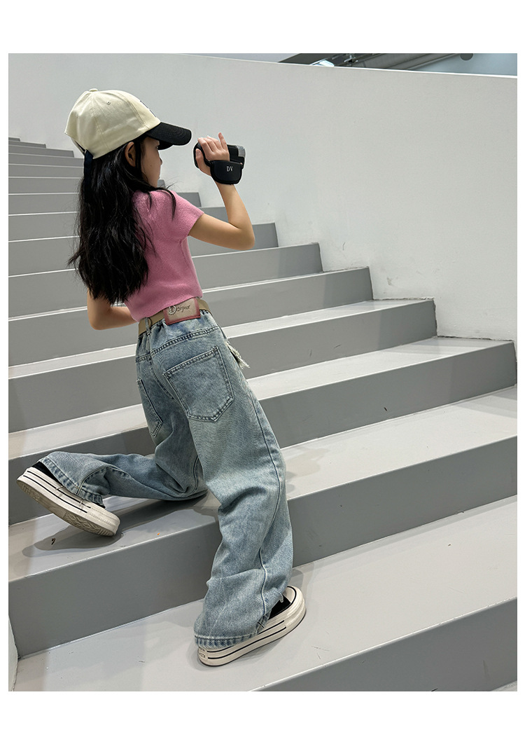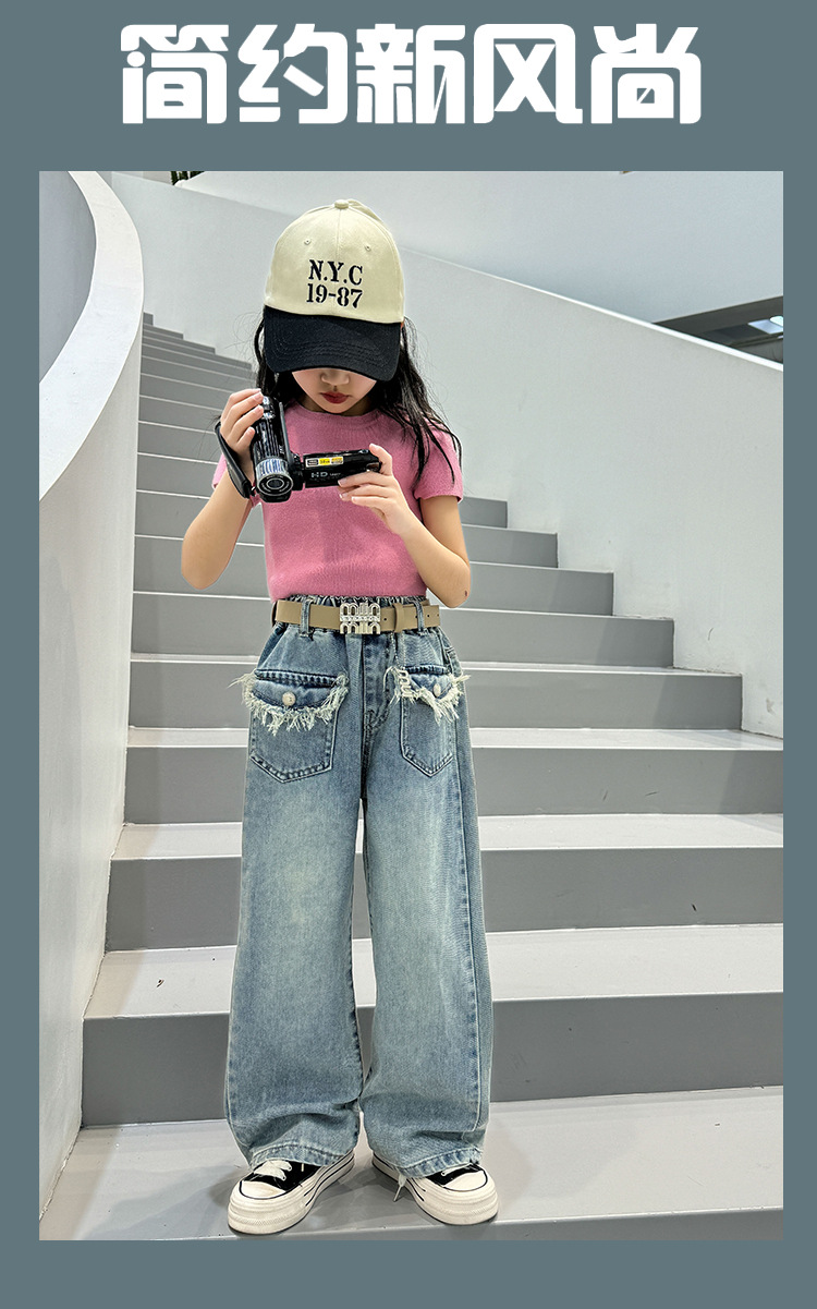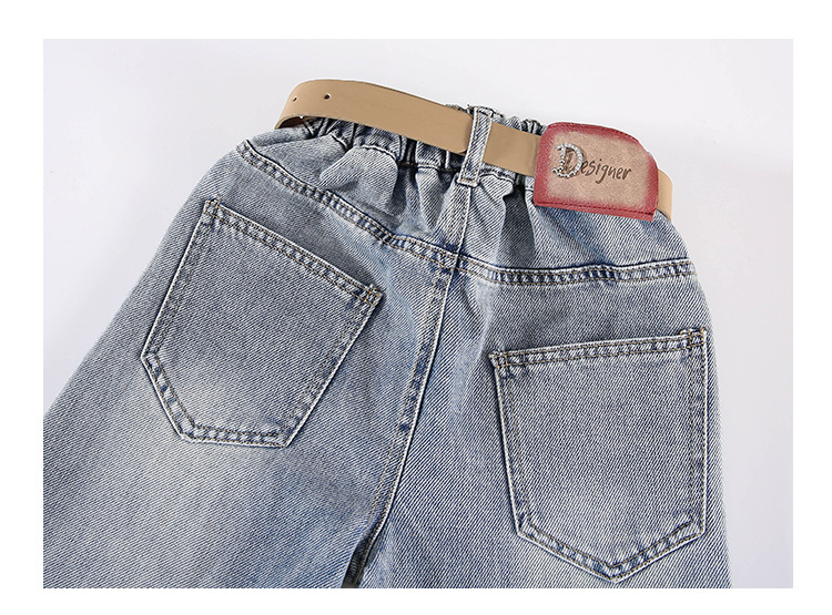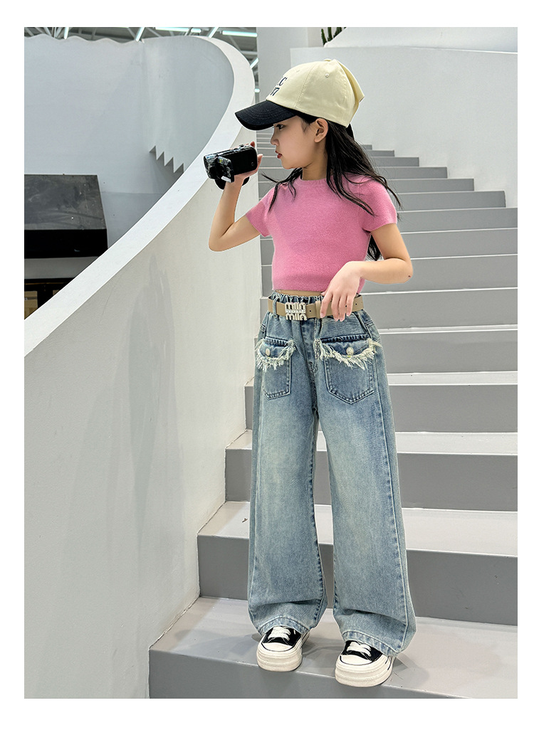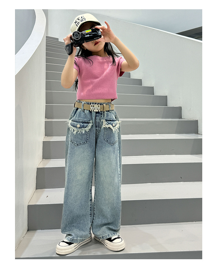 소녀 바지 봄 거친 가장자리 유행 한국 스타일 어린이 서양식 올매치 소녀의 스트레이트 데님 와이드 다리 바지 Huzhou Zhili