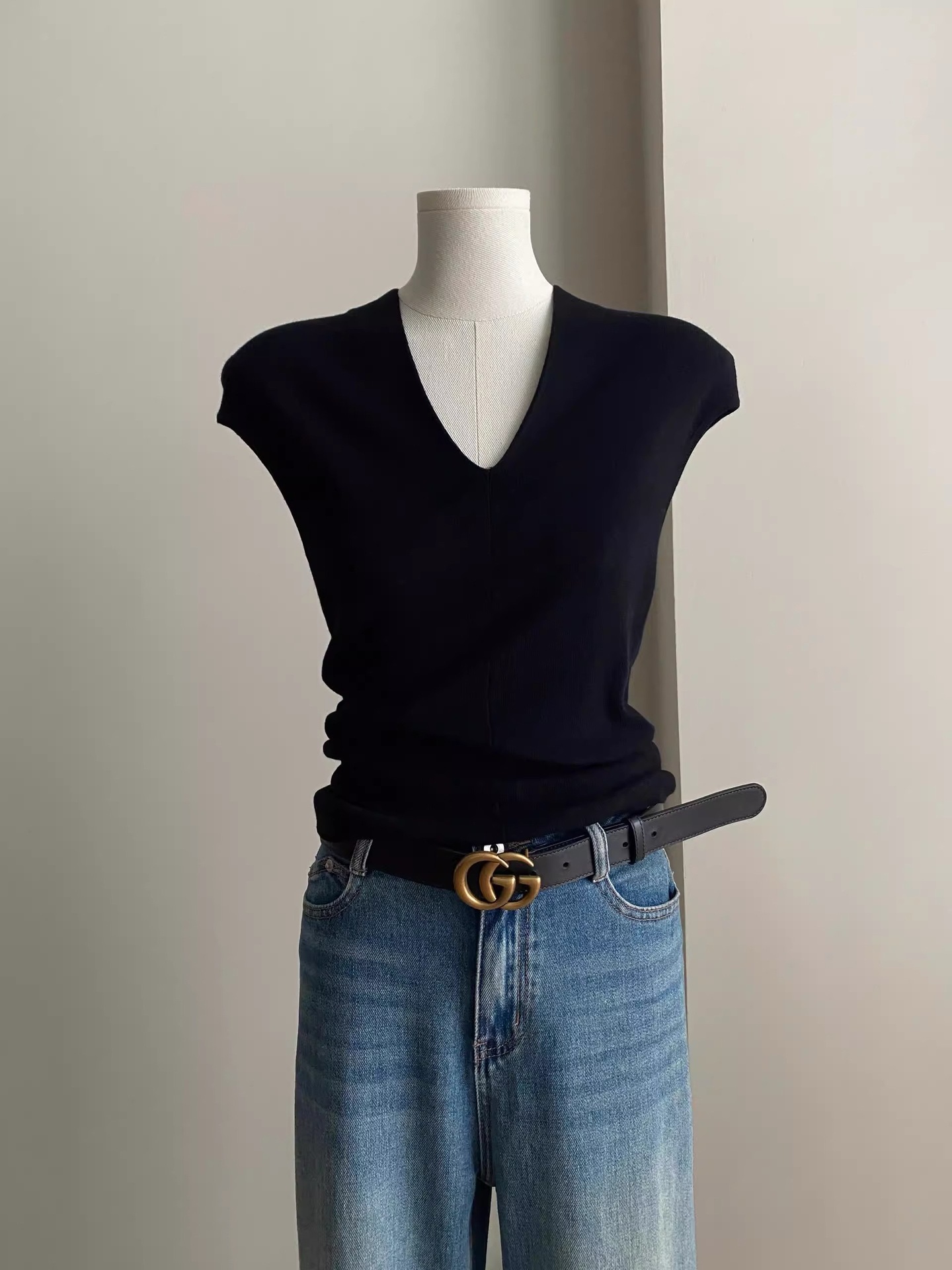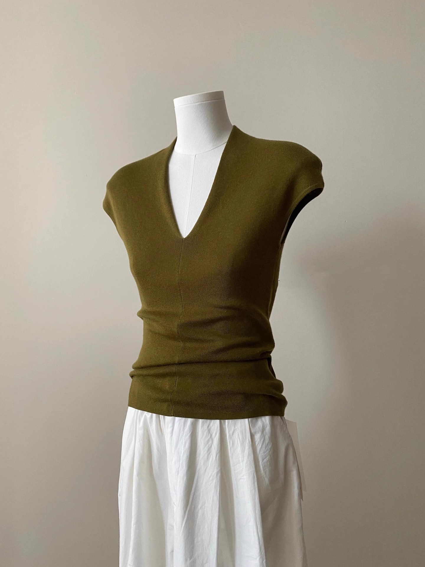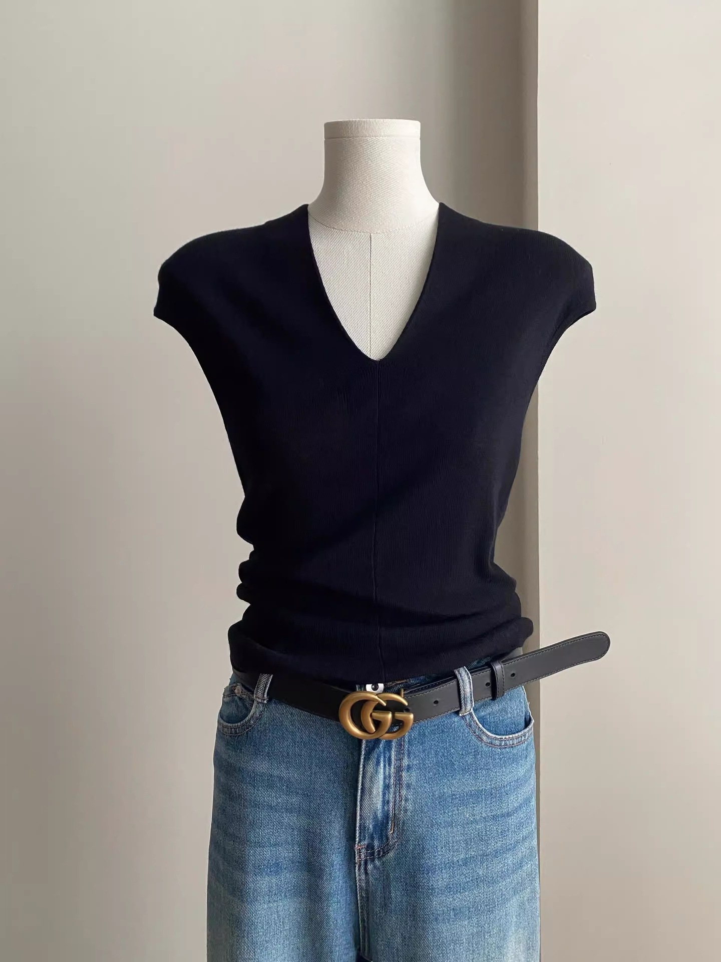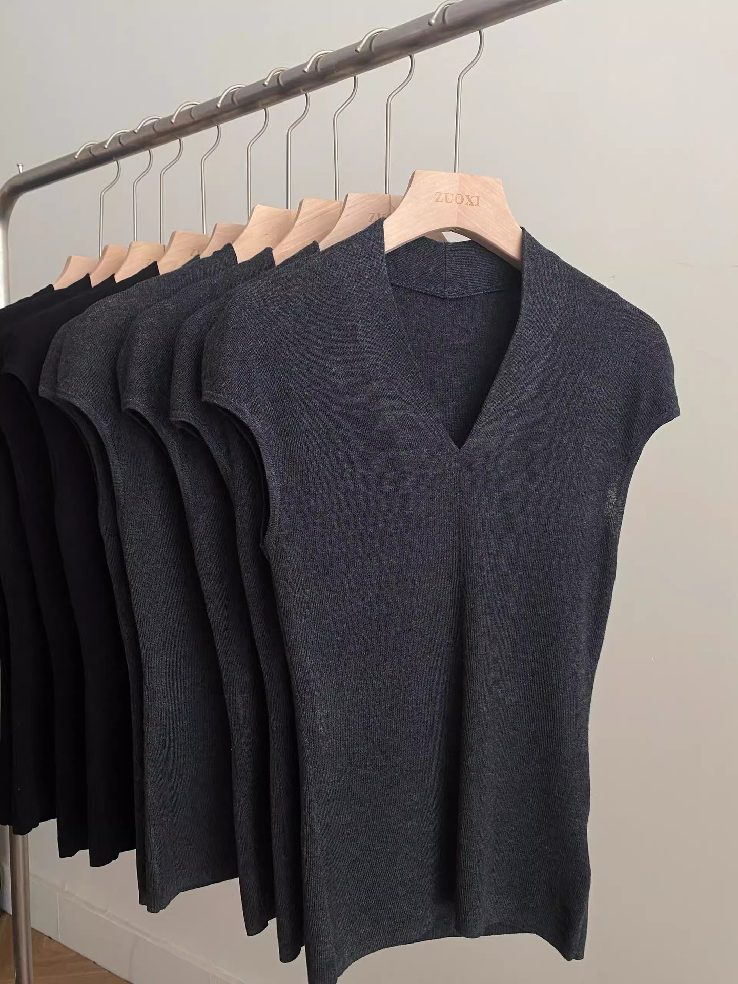 欧货灰色v领小飞袖冰丝针织t恤女夏季短款修身显瘦薄款背心上衣夏