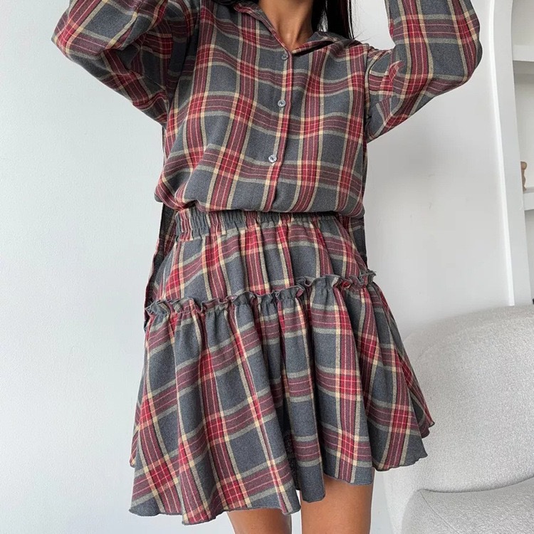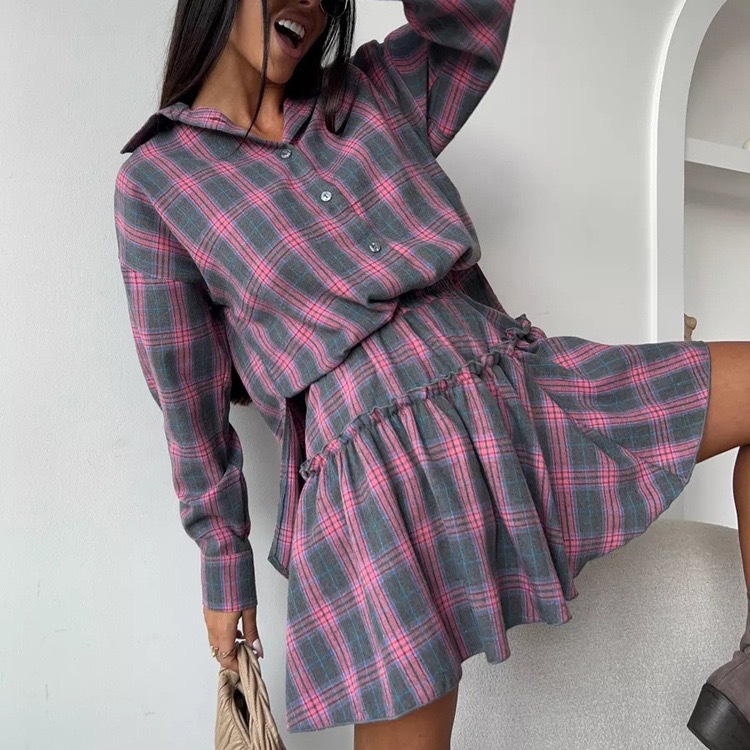 2025 새로운 패션 캐주얼 격자 무늬 스커트 정장 여성 옷깃 느슨한 셔츠 스트랩 주름 스커트 투피스 세트