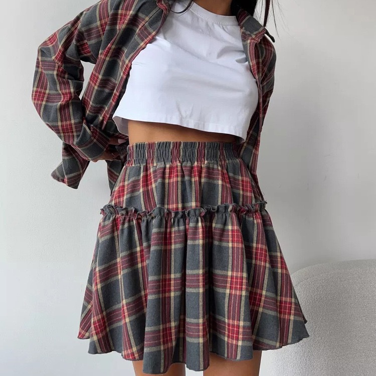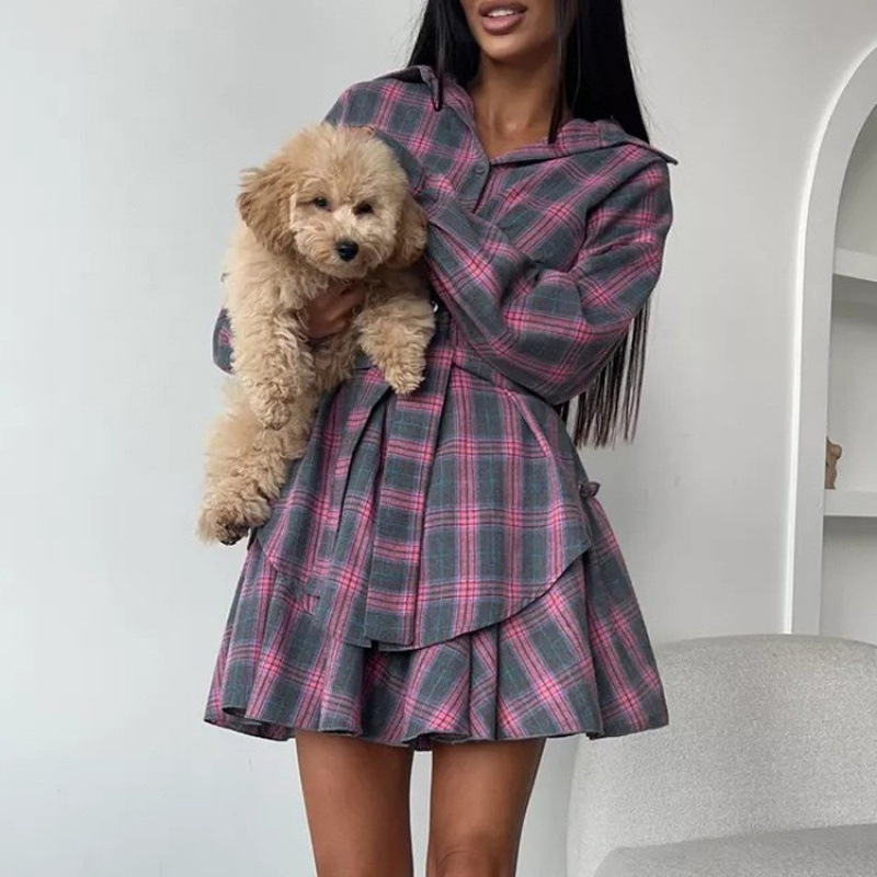 2025 새로운 패션 캐주얼 격자 무늬 스커트 정장 여성 옷깃 느슨한 셔츠 스트랩 주름 스커트 투피스 세트스토어 가기