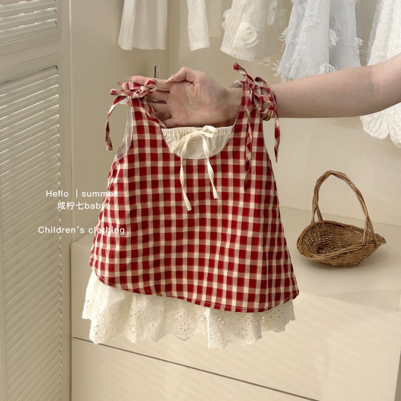 2025 여름 아동복 소녀 붉은 격자 무늬 가짜 투피스 원피스 여름 새 어린이 여성 아기 조끼 치마 조수