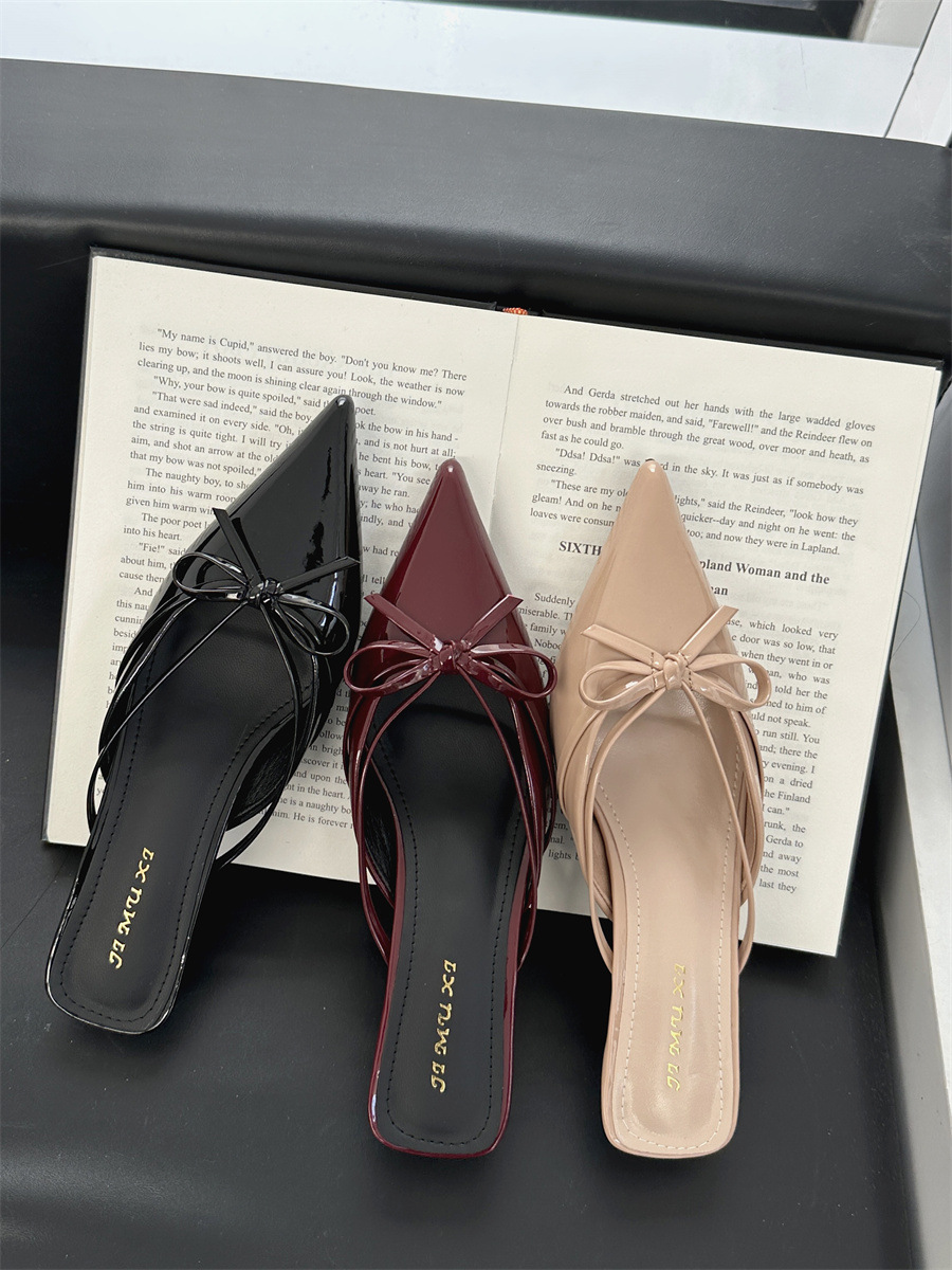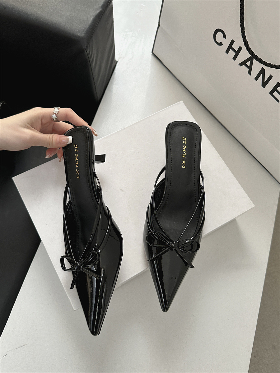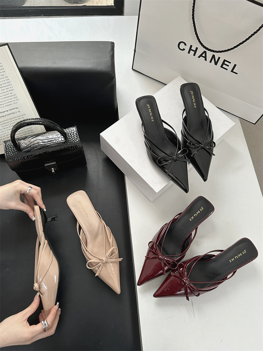 얇은 힐 보우 레트로 스퀘어 토 바오 터우 하프 슬리퍼 여성 2025 뉴 스타일 아우터 착용 하이힐 뮬러 신발 게으른 여성 신발
