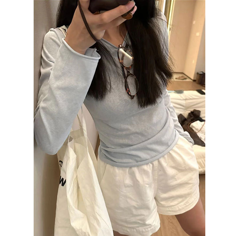 블루 긴팔 어깨 티셔츠 여성의 초가을 얇은 슬림 핏 슬리밍 디자인 센스 니쉬 컬베이스 올 매치 탑