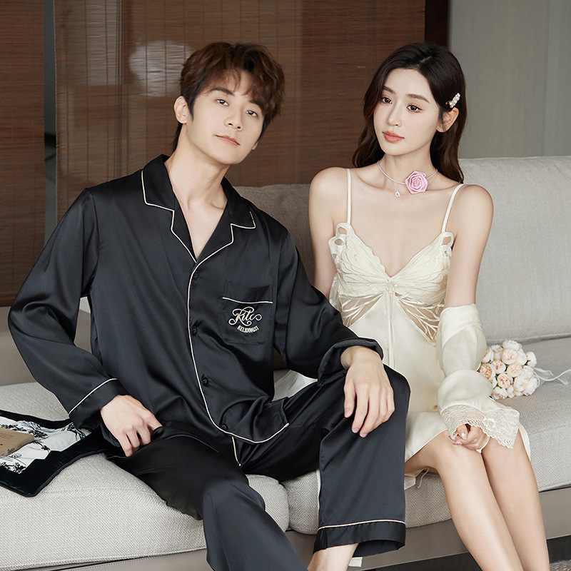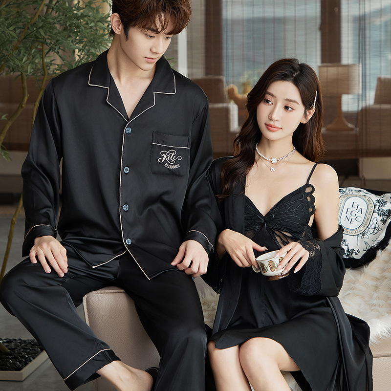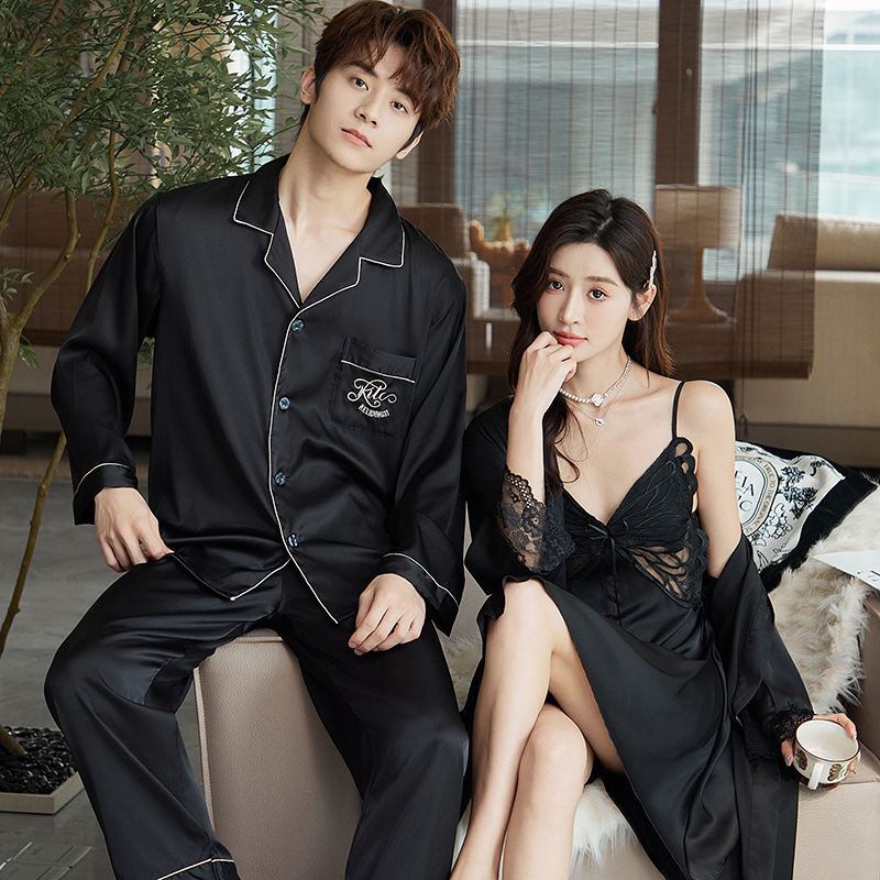 2025 년 봄과 가을 잠옷 아이스 실크 여성의 긴 소매 섹시한 레이스 슬링 나이트 가운 아침 가운 남자 홈 의류 세트