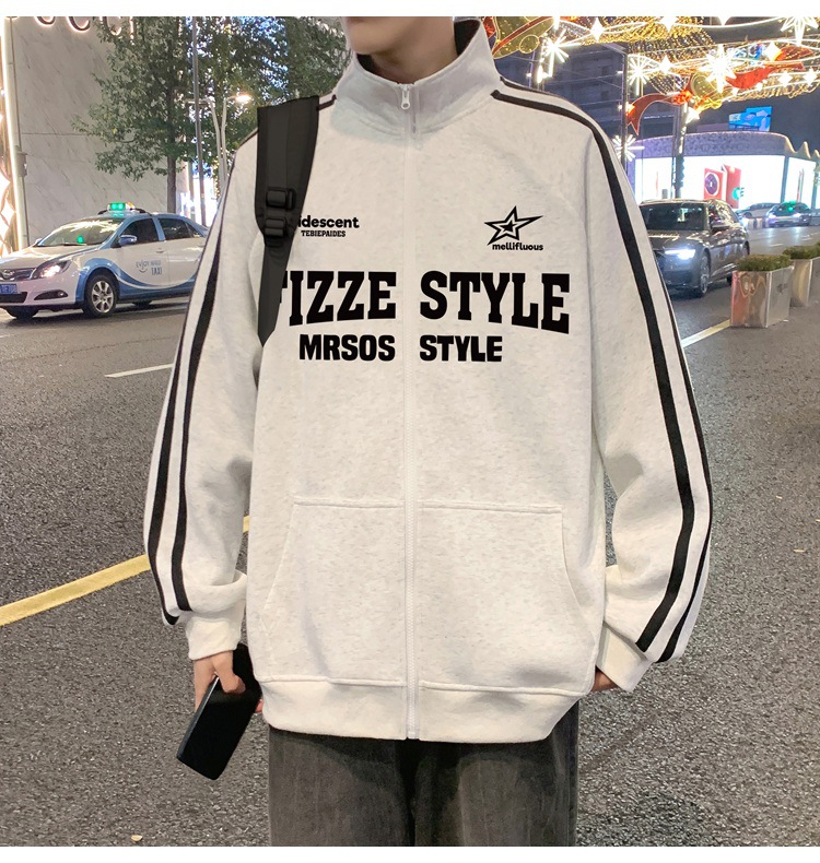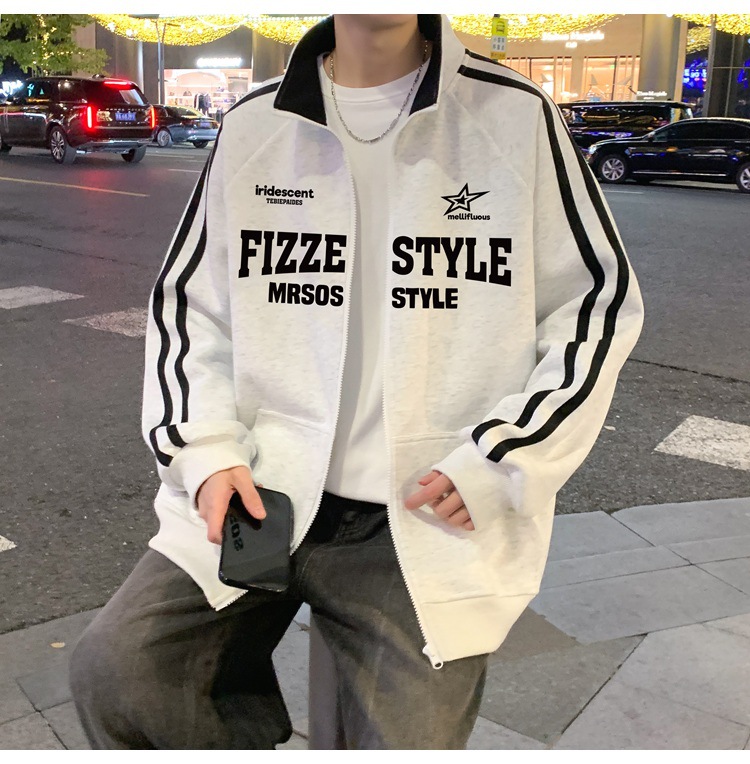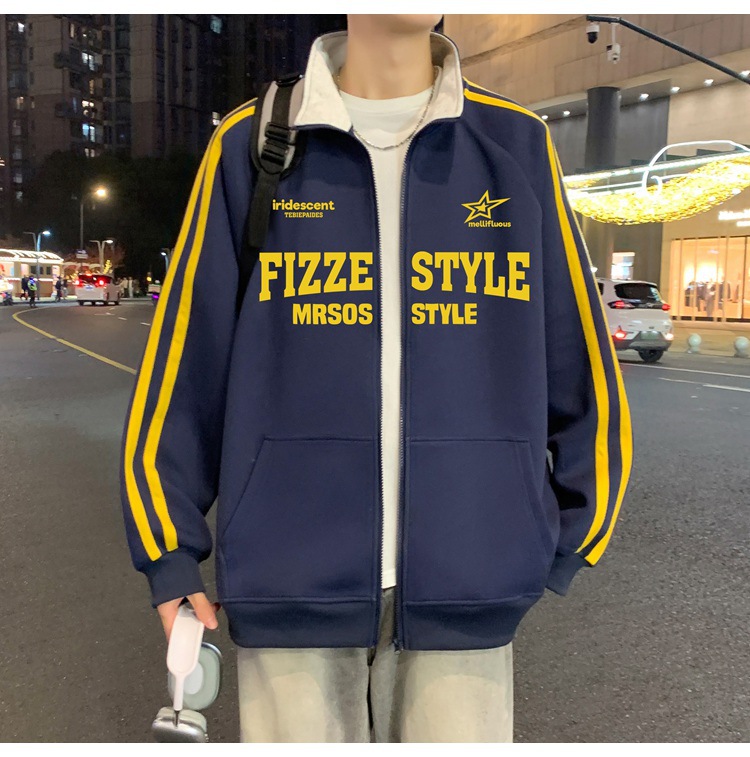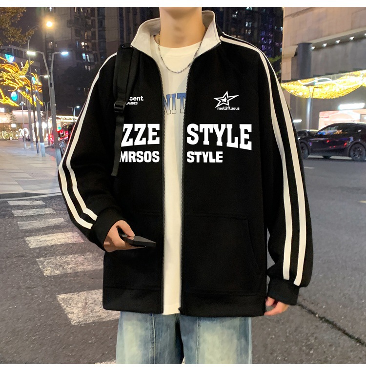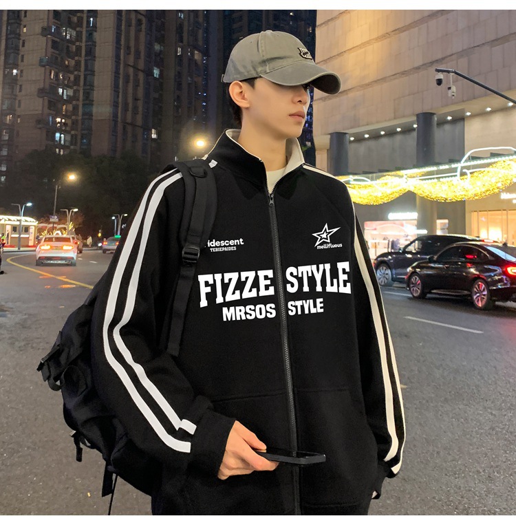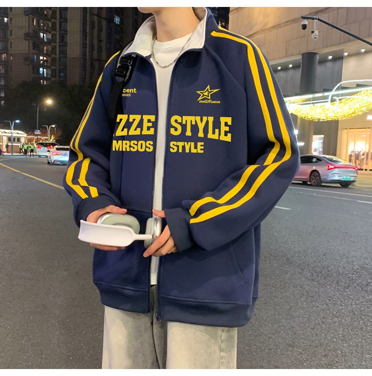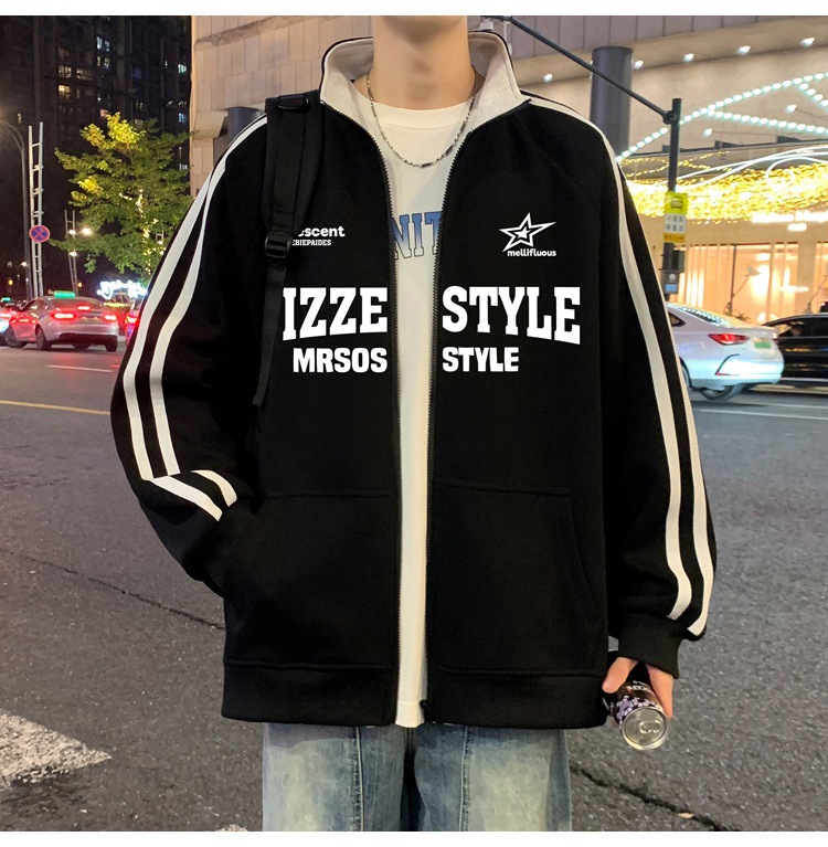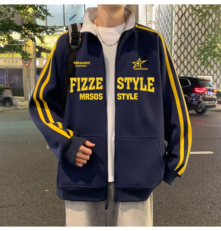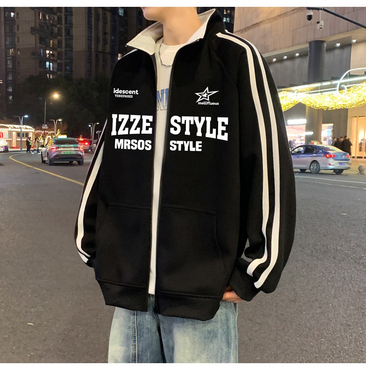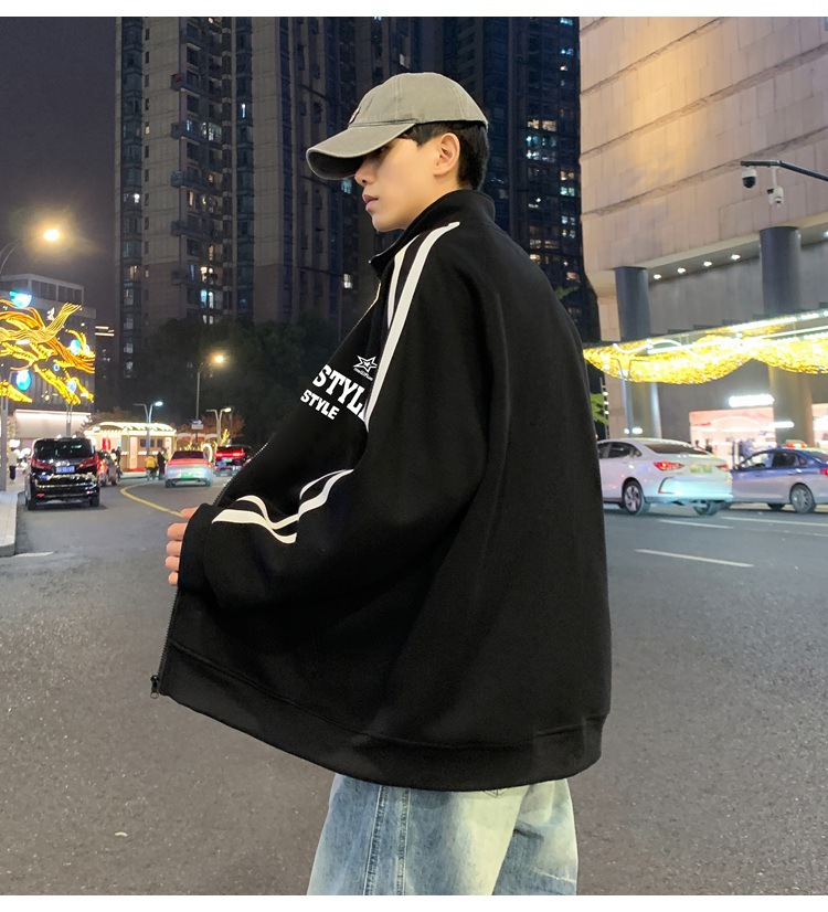 수직 칼라 지퍼 카디건 스웨터 남자 봄과 가을 뉴 스트라이프 코트 오버 사이즈 미국 캐주얼 스포츠 탑스토어 가기