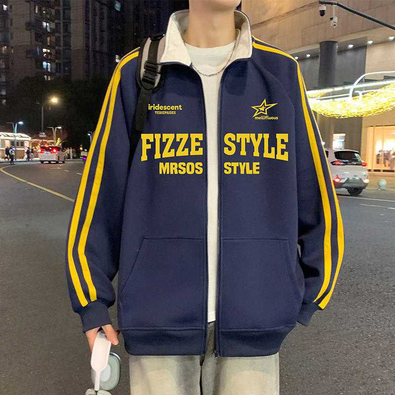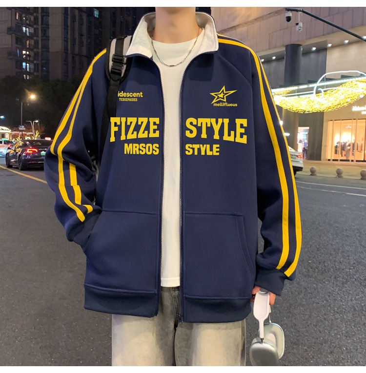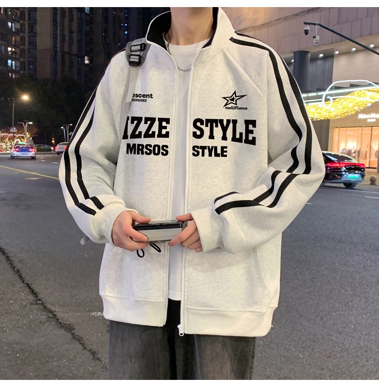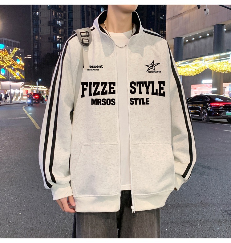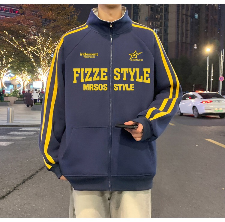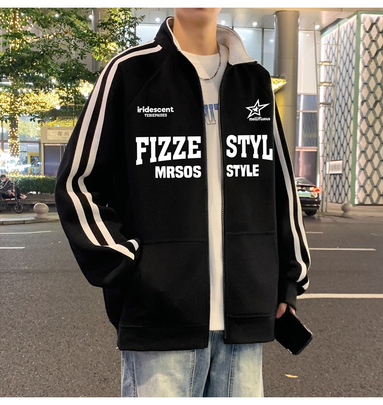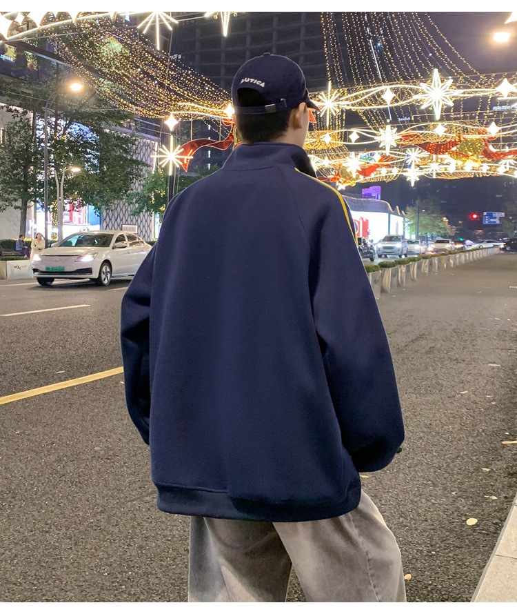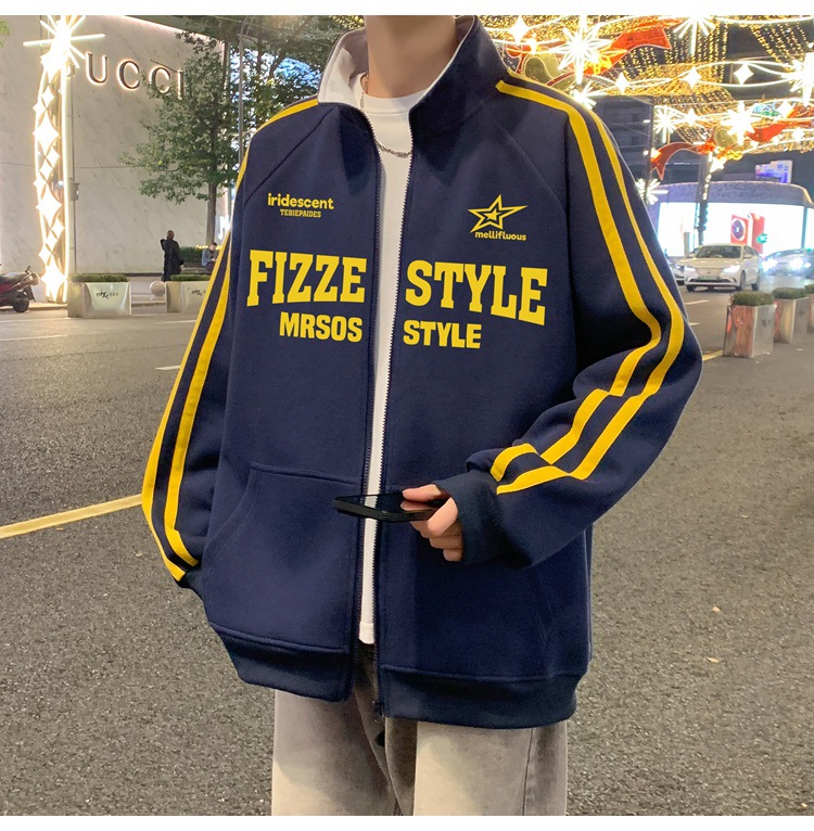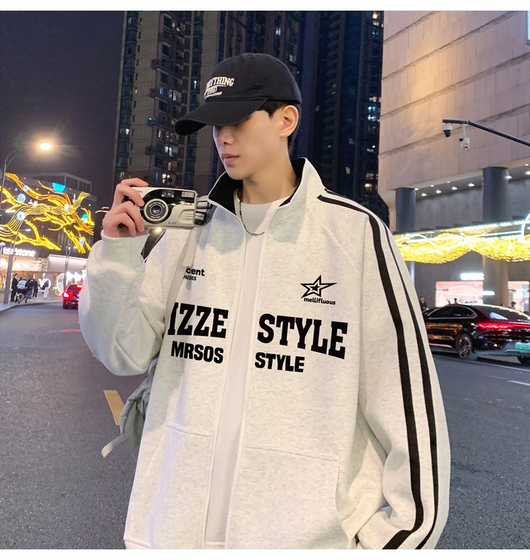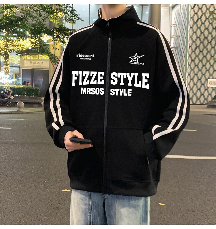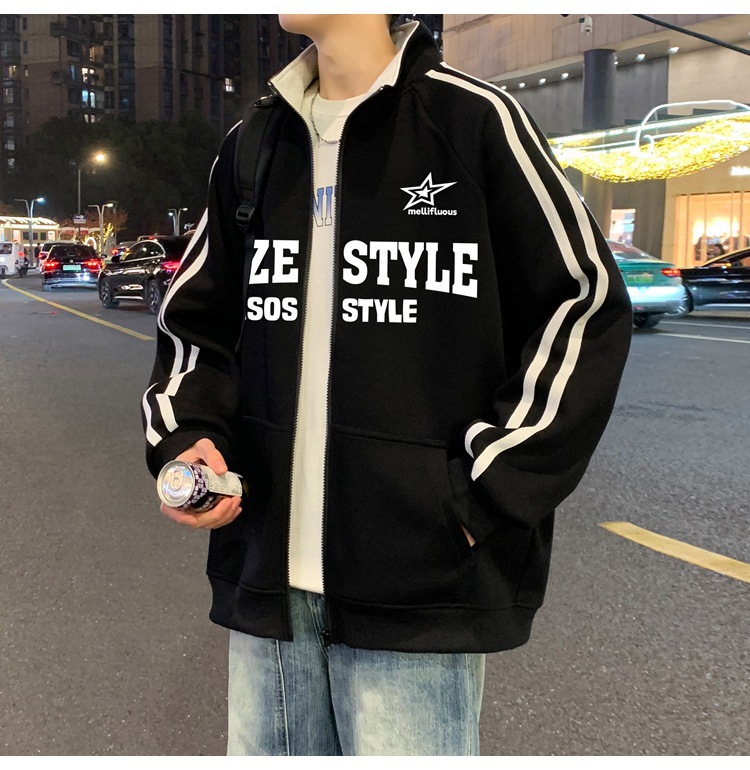 수직 칼라 지퍼 카디건 스웨터 남자 봄과 가을 뉴 스트라이프 코트 오버 사이즈 미국 캐주얼 스포츠 탑스토어 가기