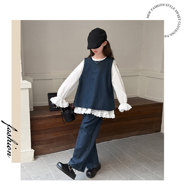 여자 데님 세트 봄 2025 새로운 어린이 서양식 조끼 한국 레이스 셔츠 넓은 다리 바지 3 조각 세트