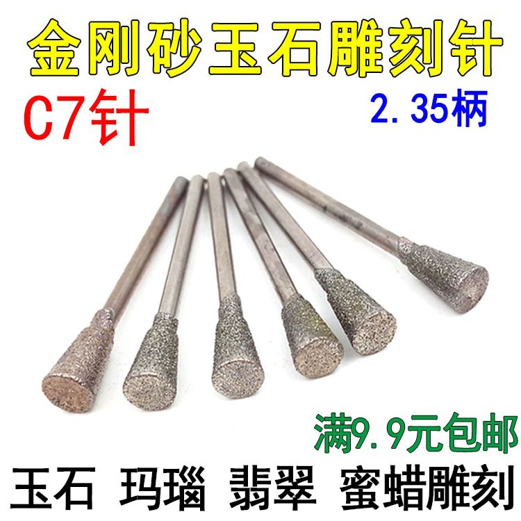 5.轻压给进,金刚石工具是靠磨削来加工工件的,过分用力,磨粉不易排除,工具(特别是小工具)也容易损坏。 C7针:俗称压轮、轧坨、压坨。 偏重于除胚、除皮及造型雕刻。适合于玉器、玉石、翡翠、玛瑙 、玻璃、磨具等修整、打磨、雕刻等用。可配合在各种柄径2.35mm的电磨、高速玉雕机、吊机、电子机上使用。