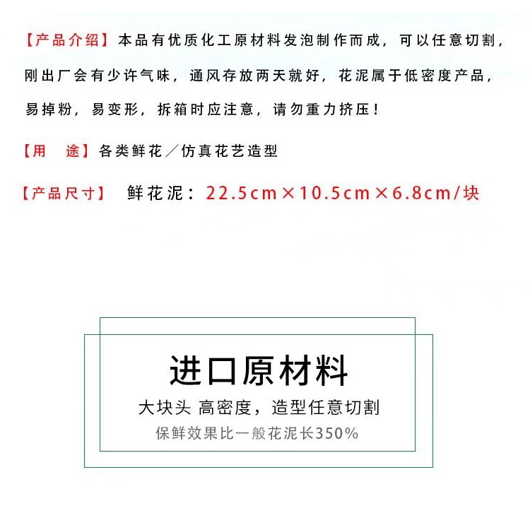 花泥属于低密度产品,发货时会有磨损,粉末会有掉落现象,这都是正常情况不影响使用,主义者慎拍!!!