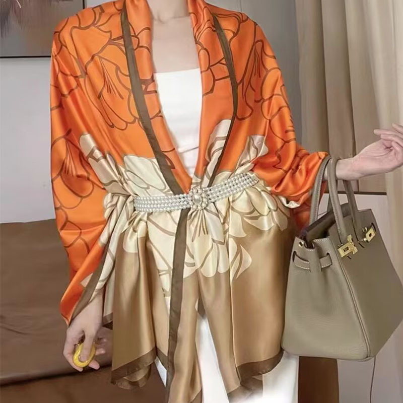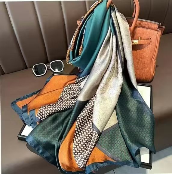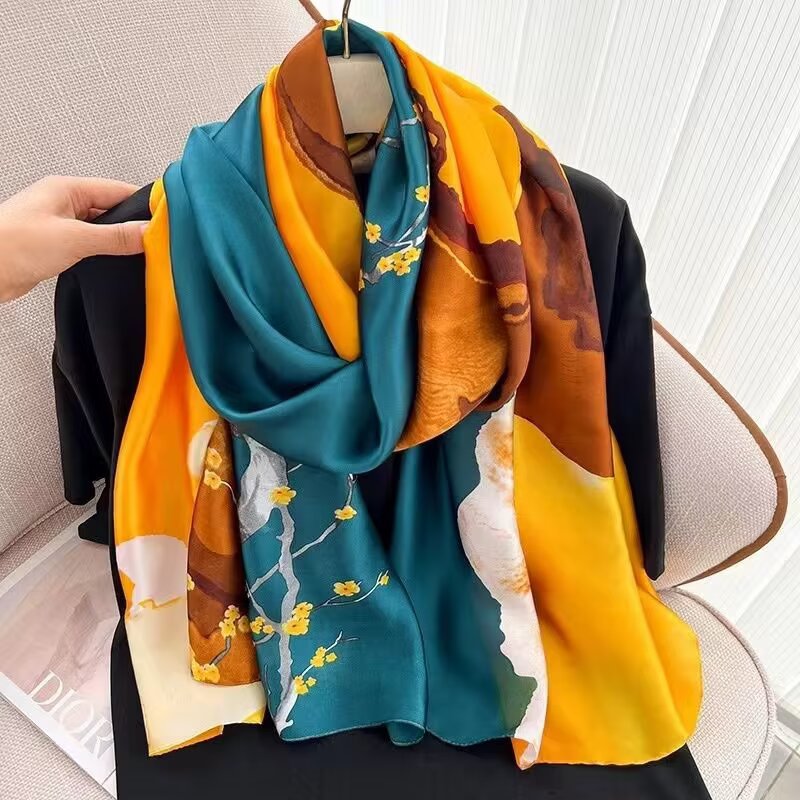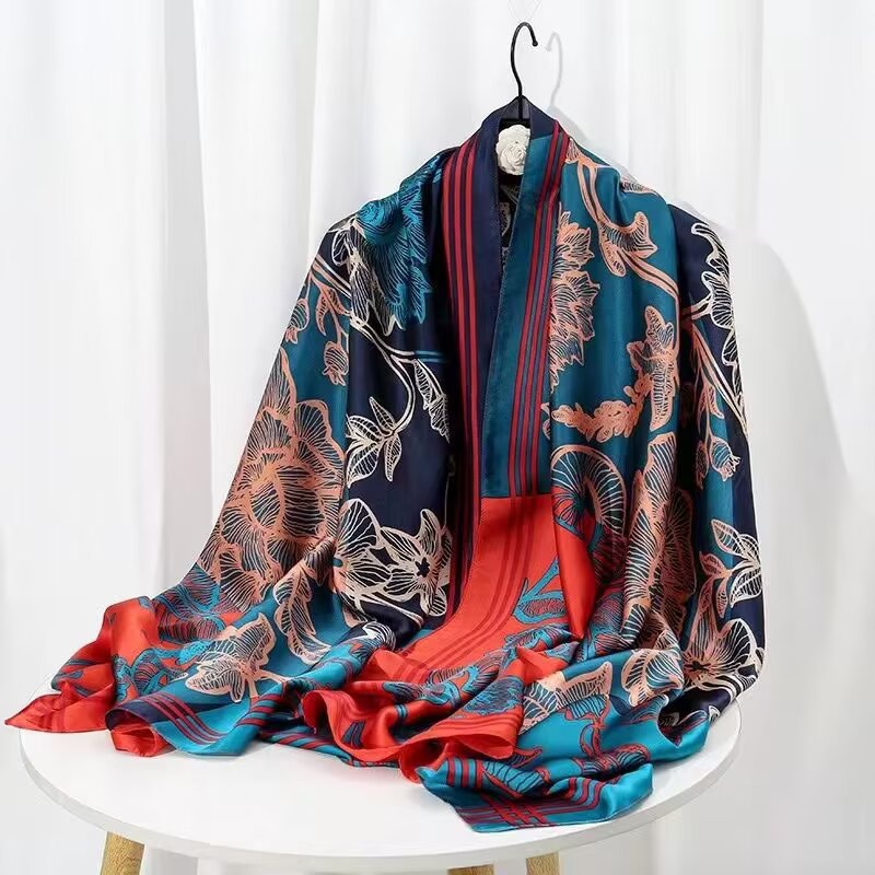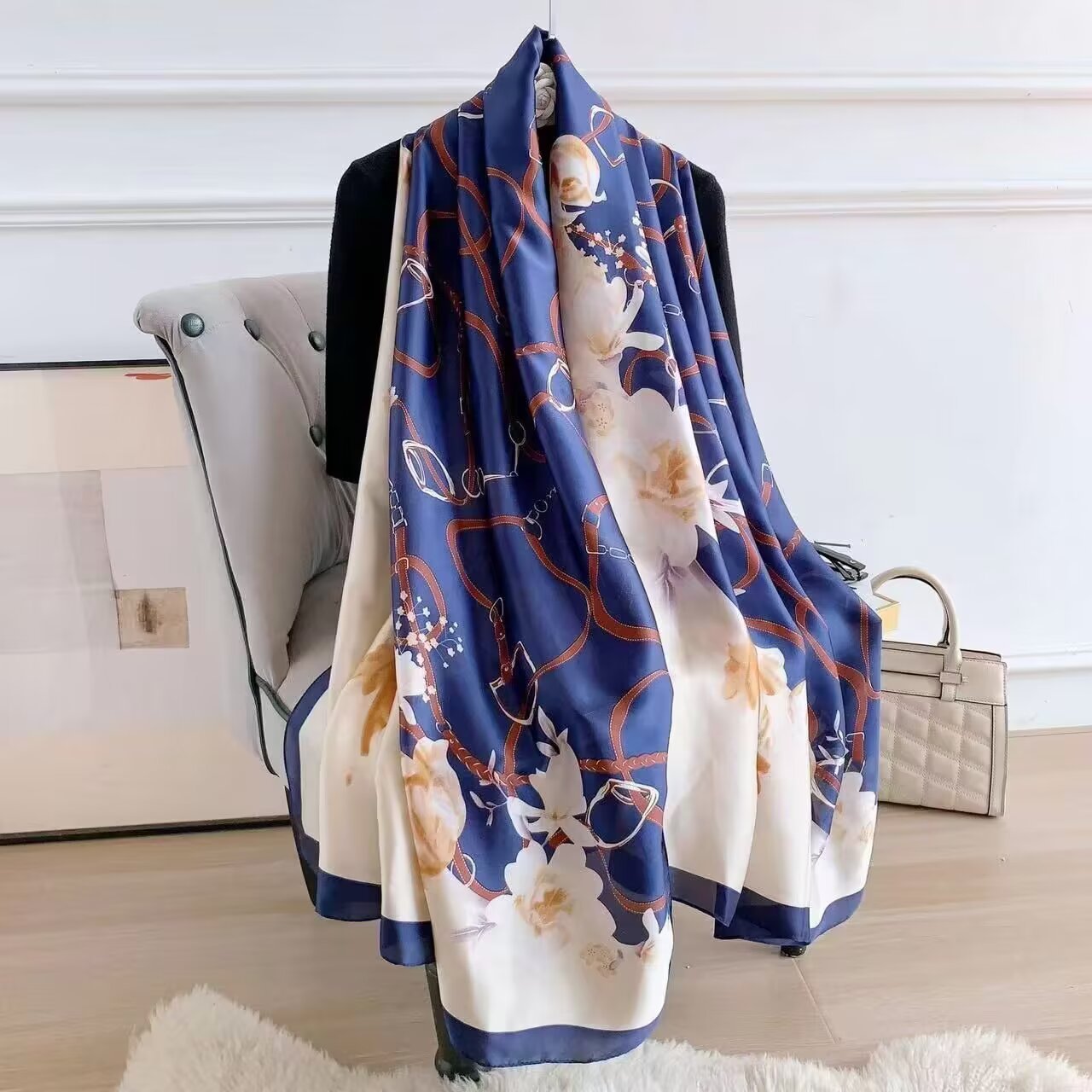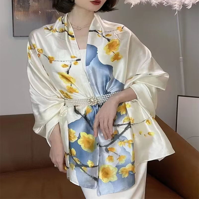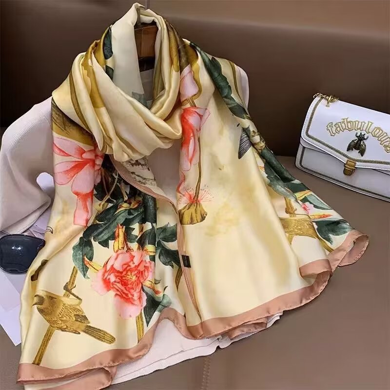 새로운 모조 실크 브로케이드 새틴 야외 목도리 선 스크린 비치 타월 에어컨 프린트 스카프 여성 도매스토어 가기