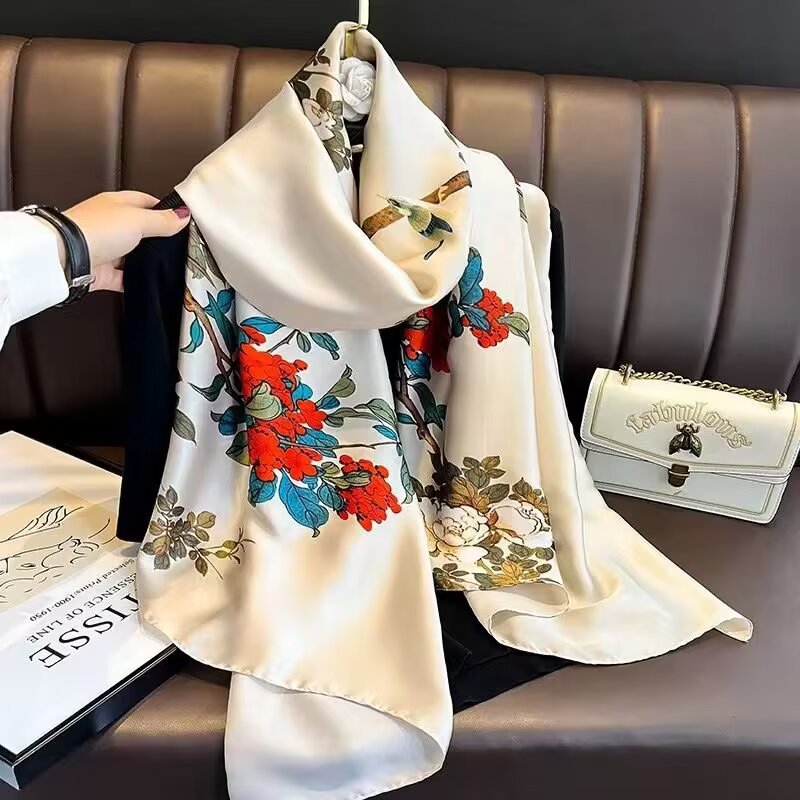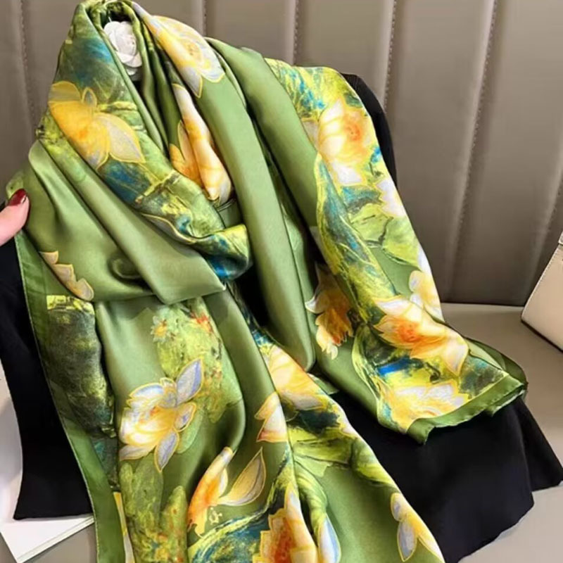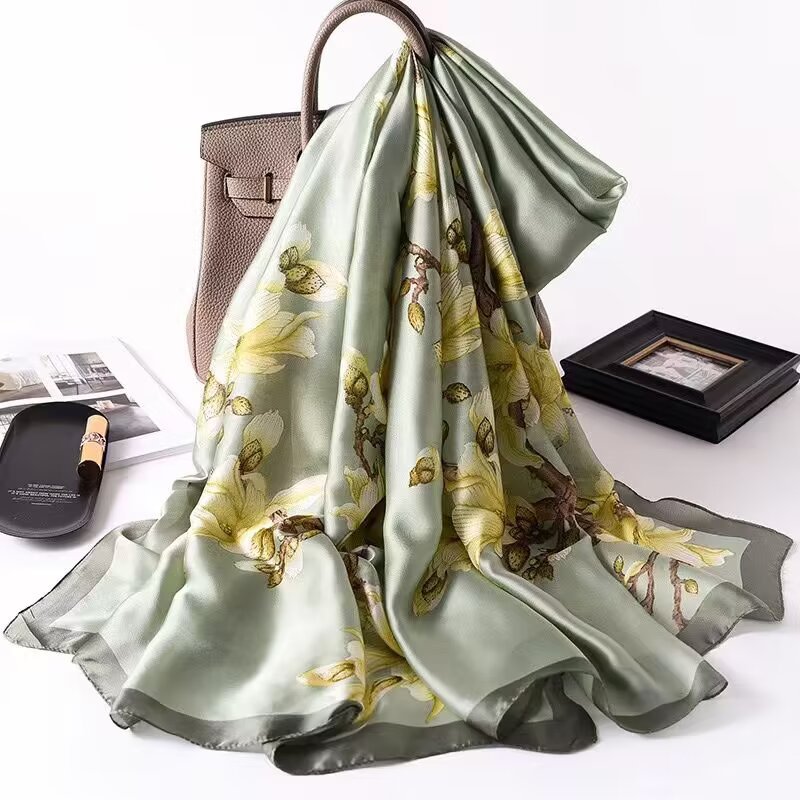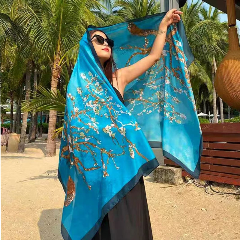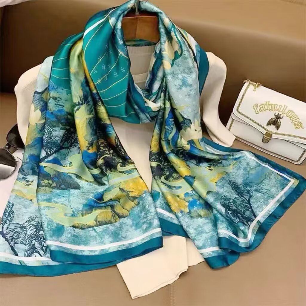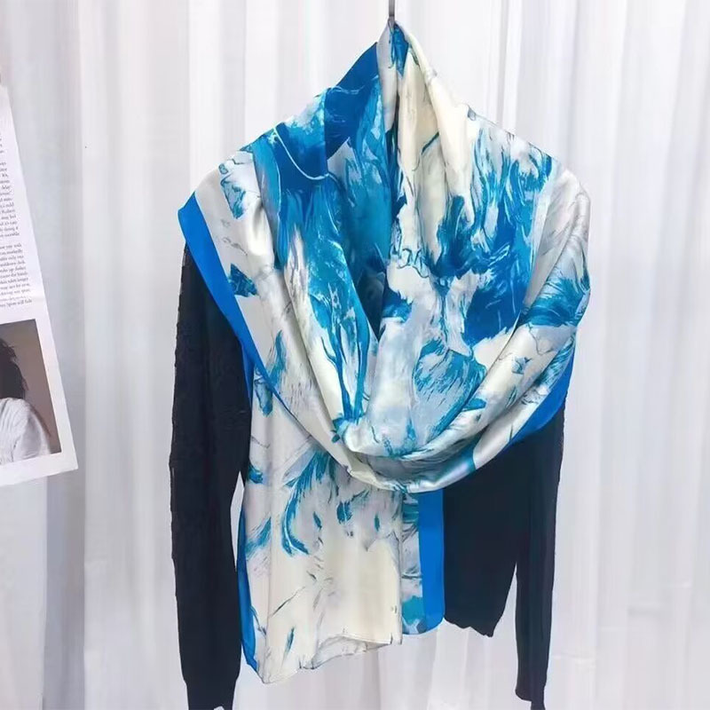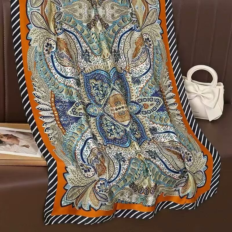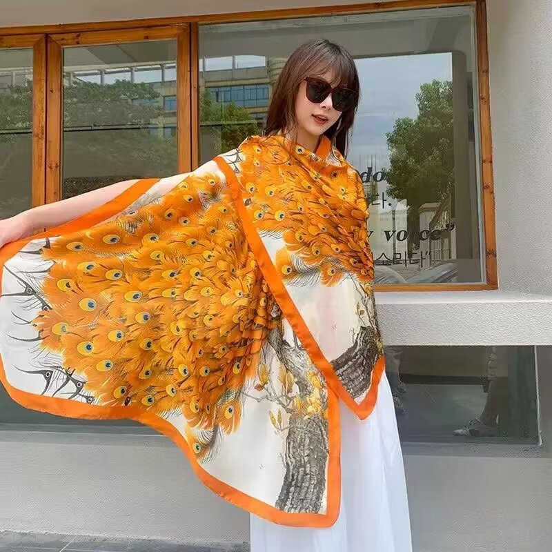 새로운 모조 실크 브로케이드 새틴 야외 목도리 선 스크린 비치 타월 에어컨 프린트 스카프 여성 도매스토어 가기
