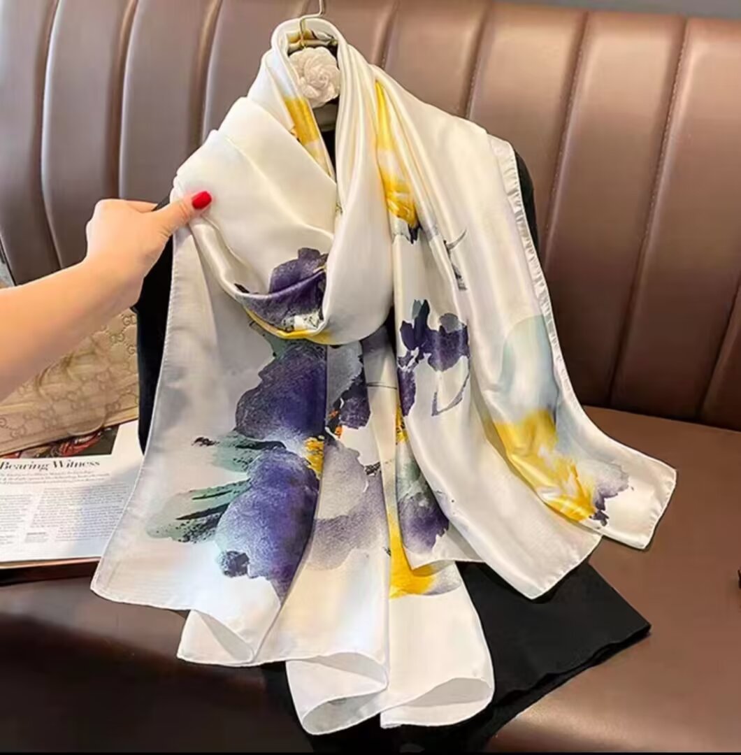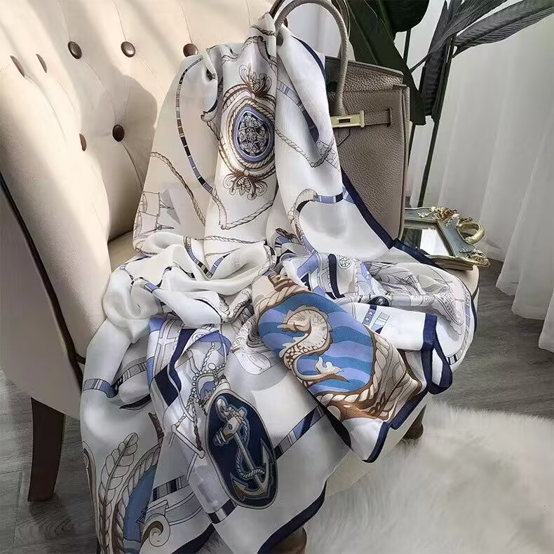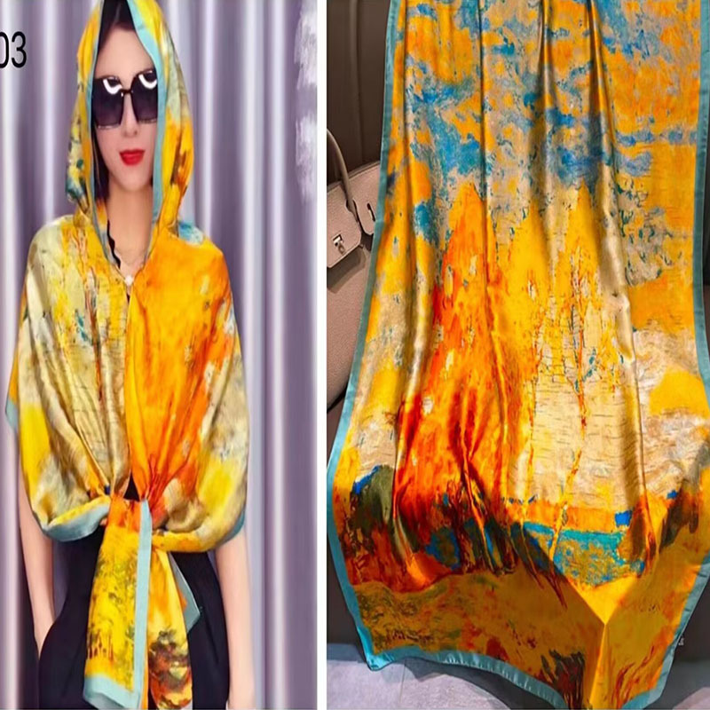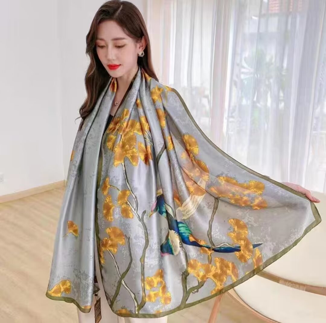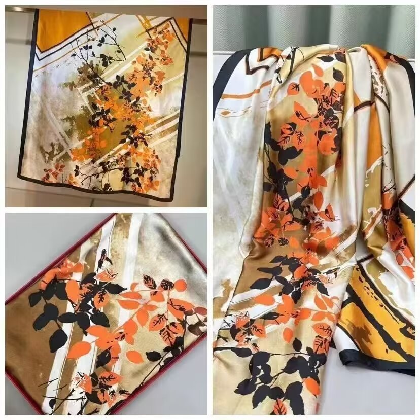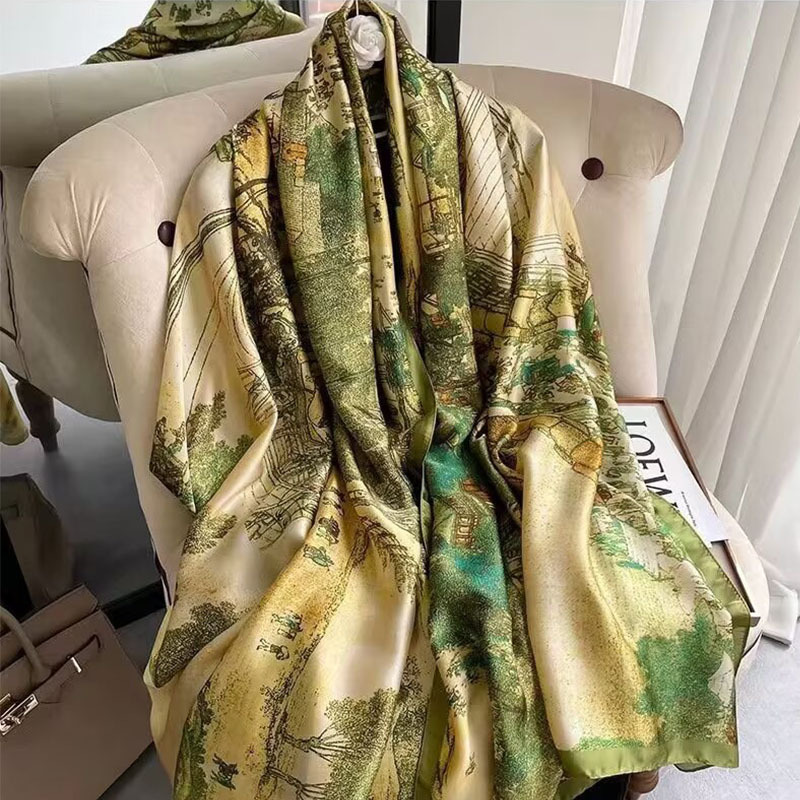 새로운 모조 실크 브로케이드 새틴 야외 목도리 선 스크린 비치 타월 에어컨 프린트 스카프 여성 도매스토어 가기