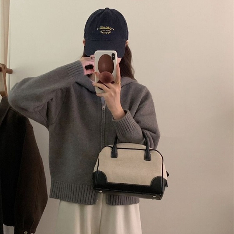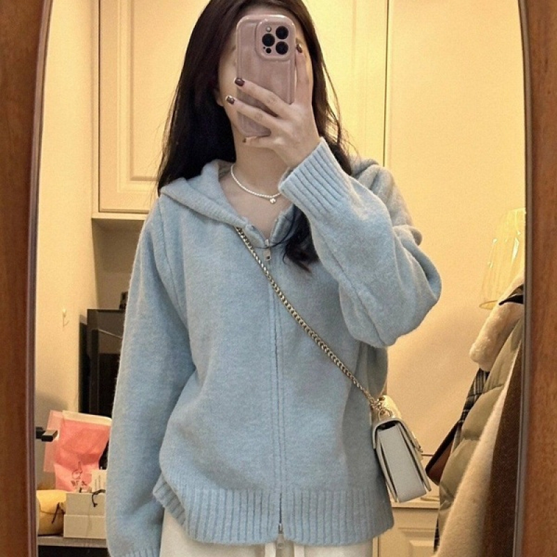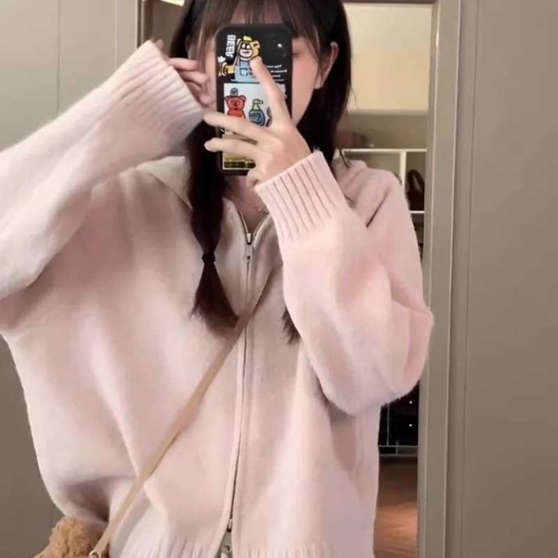 핑크 후드 니트웨어 봄 코트 여성의 봄과 가을 느슨한 게으른 스타일 지퍼 스웨터 카디건 쇼트 탑스토어 가기