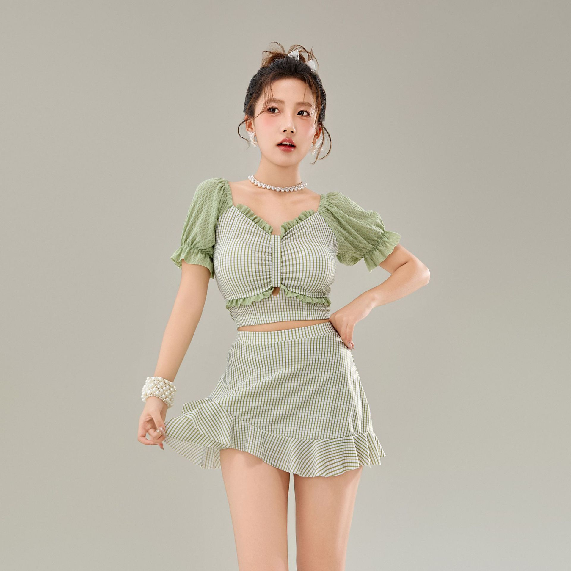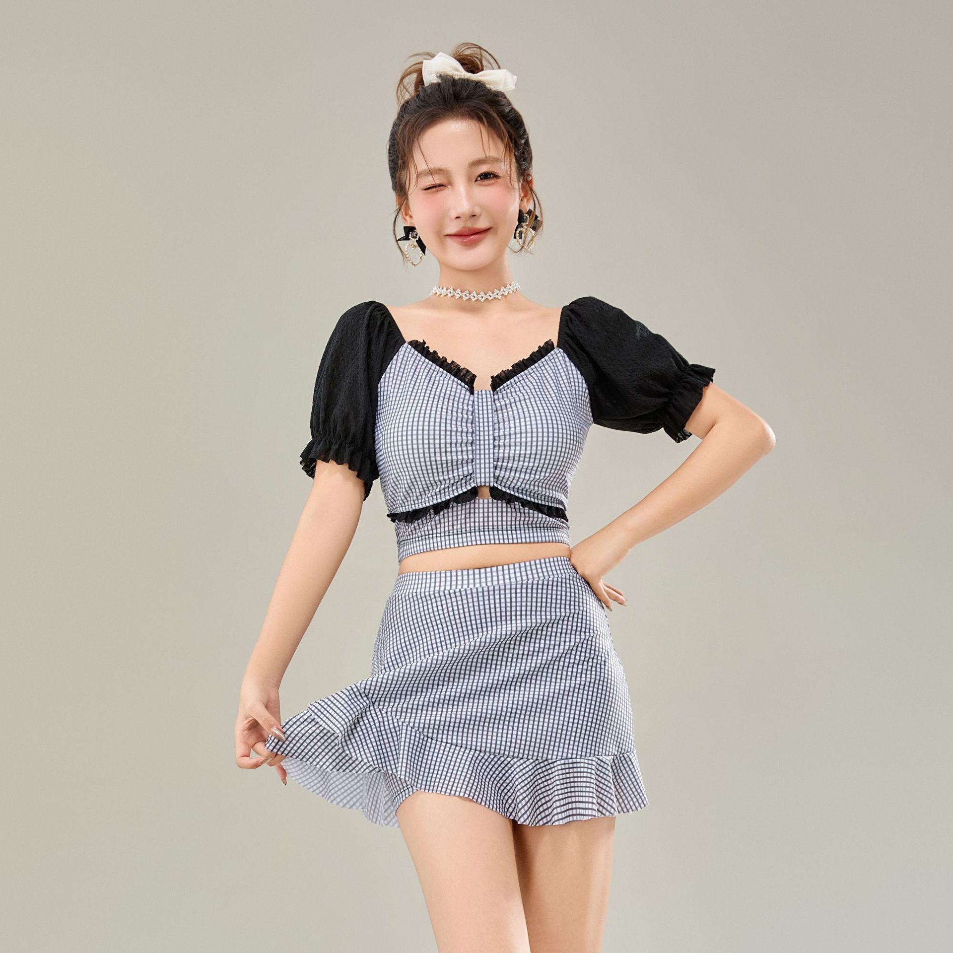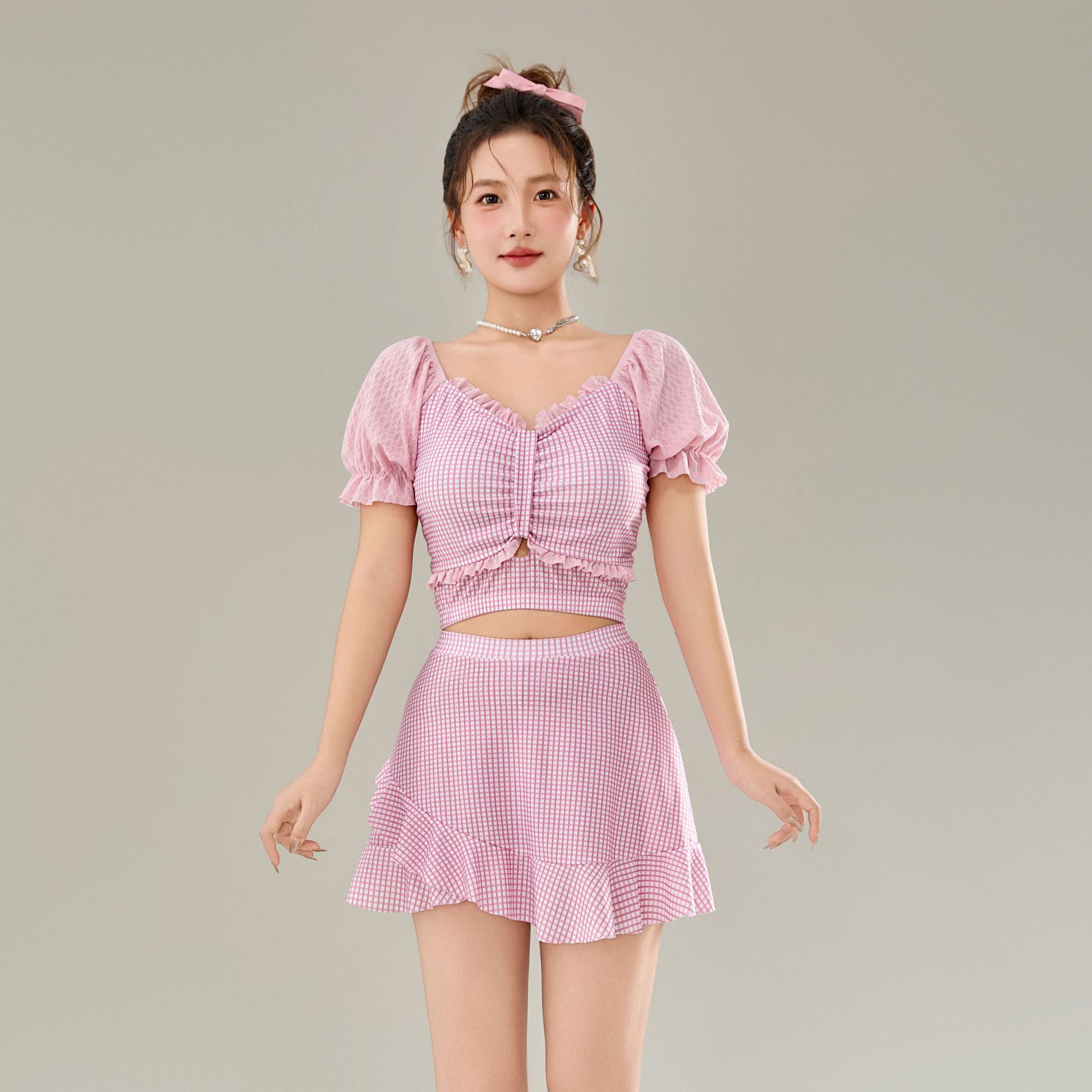 2025 격자 무늬 쪼개진 수영복 여성의 보수적 인 슬림 모양의 고기 덮인 학생 소녀 폴리 에스터 플랫 앵글 스커트 온천 수영복스토어 가기
