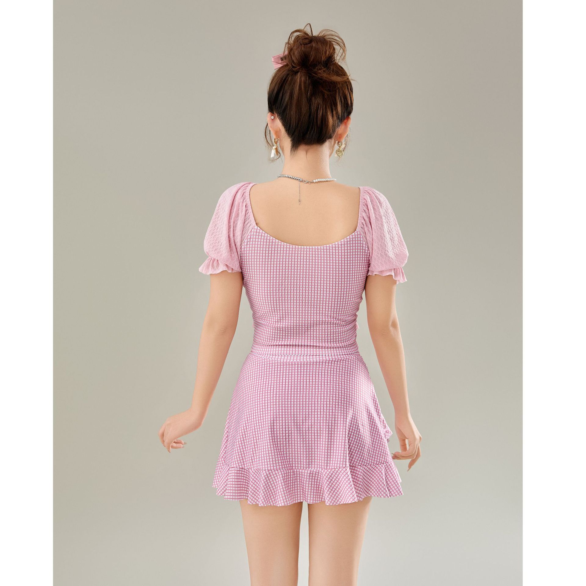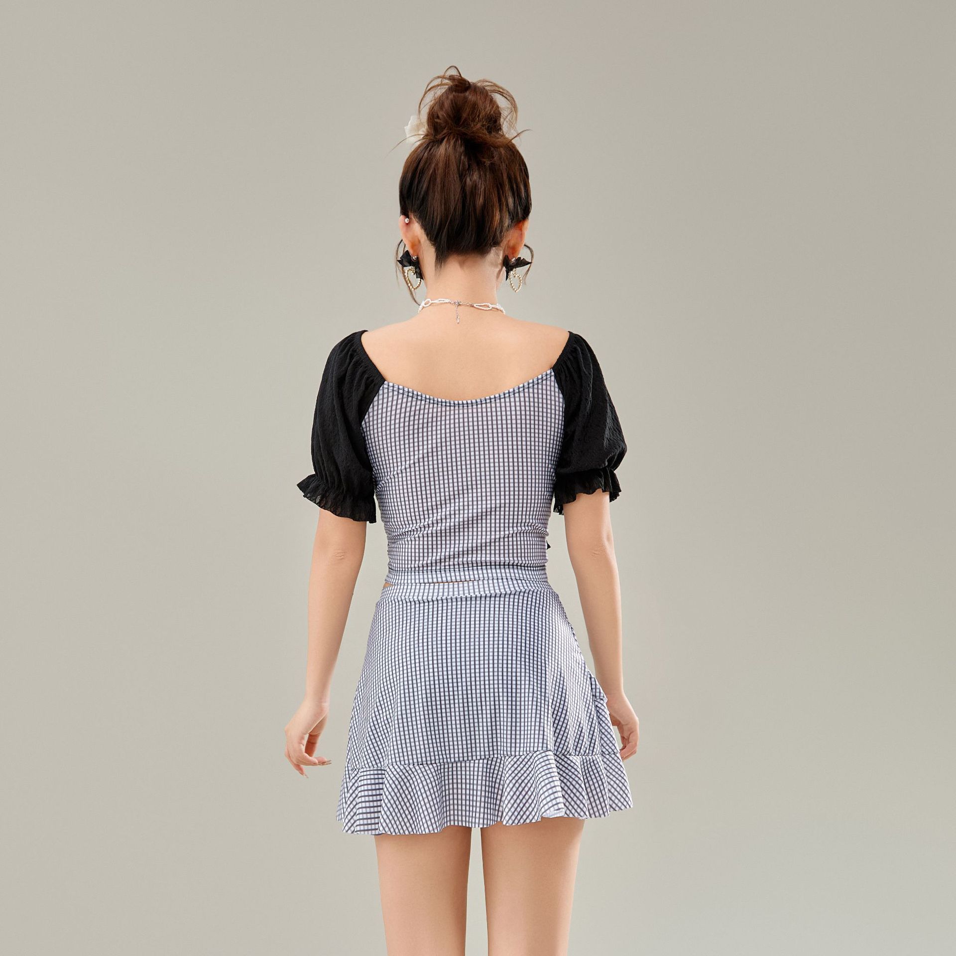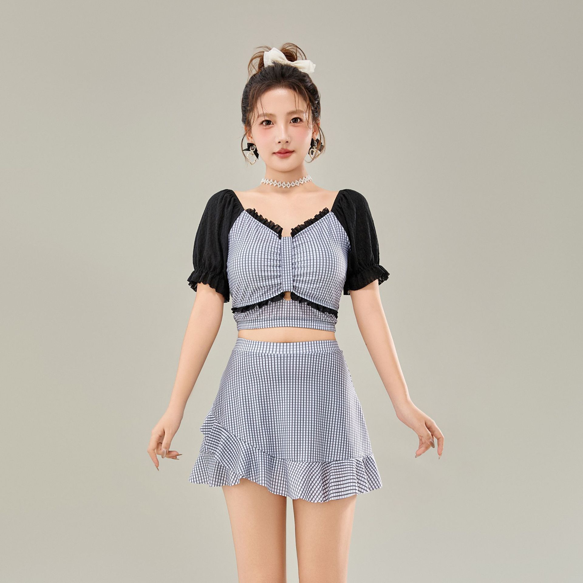 2025 격자 무늬 쪼개진 수영복 여성의 보수적 인 슬림 모양의 고기 덮인 학생 소녀 폴리 에스터 플랫 앵글 스커트 온천 수영복스토어 가기