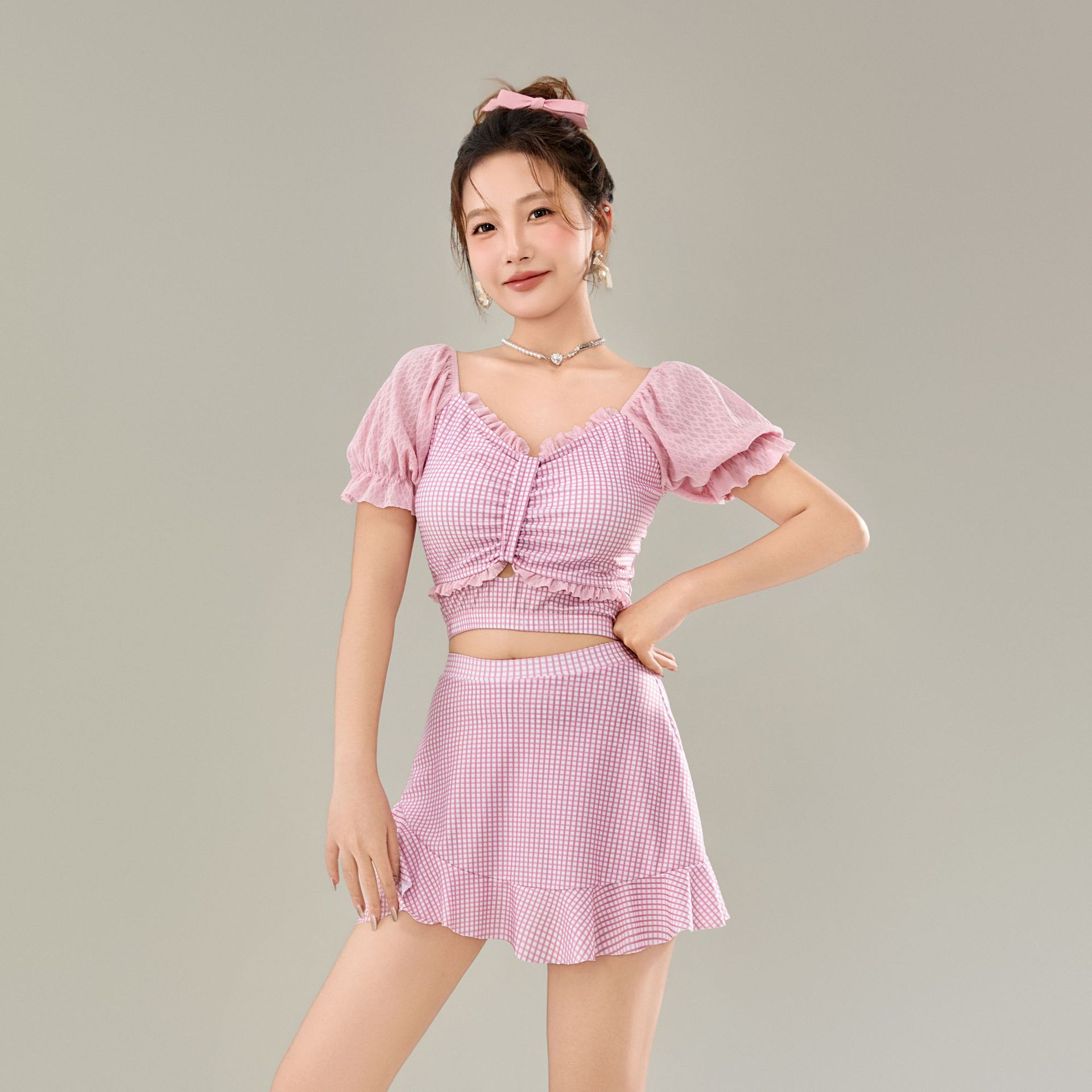 2025 격자 무늬 쪼개진 수영복 여성의 보수적 인 슬림 모양의 고기 덮인 학생 소녀 폴리 에스터 플랫 앵글 스커트 온천 수영복
