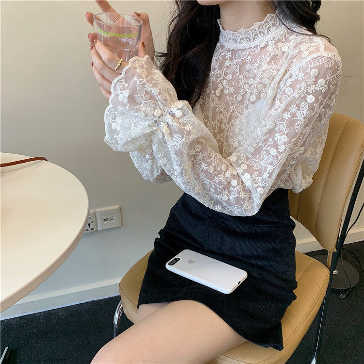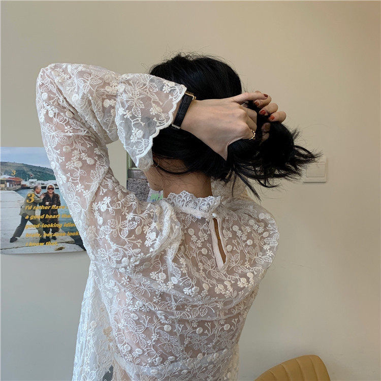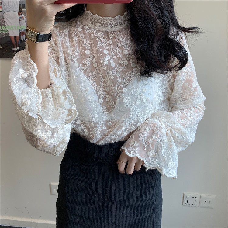 긴 소매 우아한 스파이스 소녀 레이스베이스 셔츠 여성의 새로운 도착 관점 메쉬 탑 절묘한 할로우 요정 쉬폰 셔츠스토어 가기