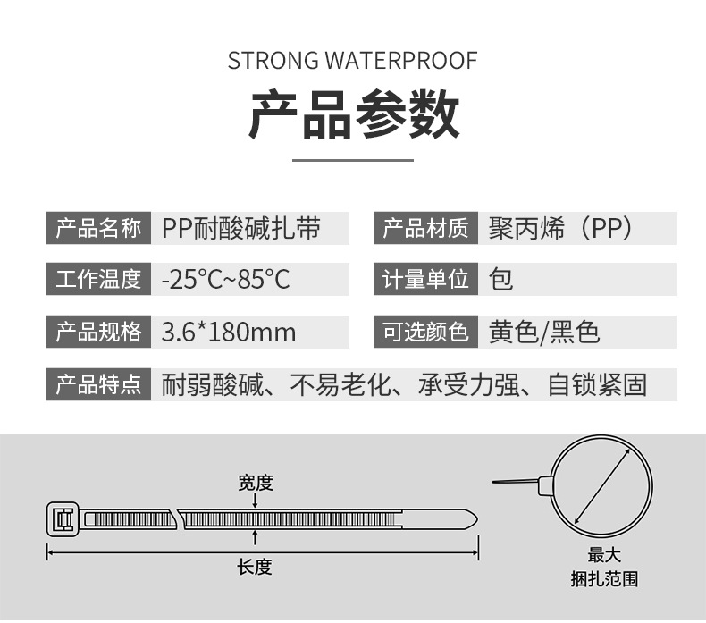 • 노란색 산 및 알칼리 방지 PP 케이블 타이, 3.6*180mm/100개/팩