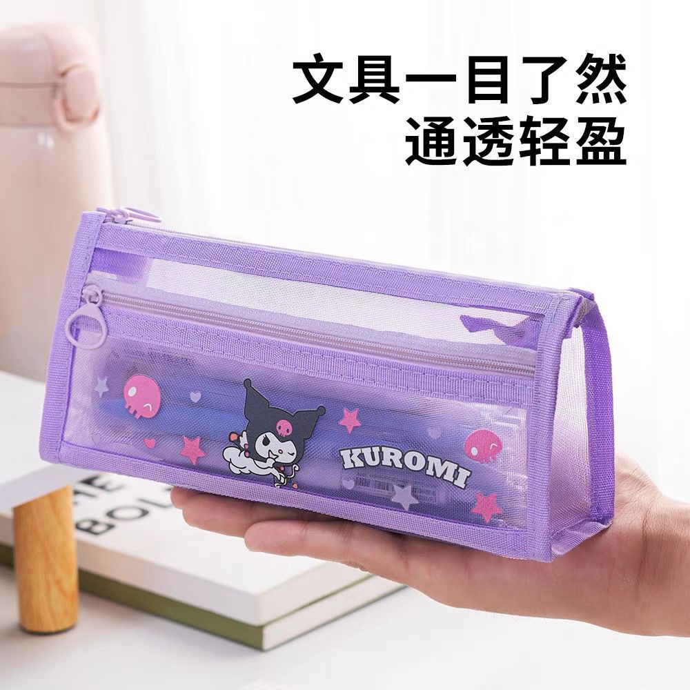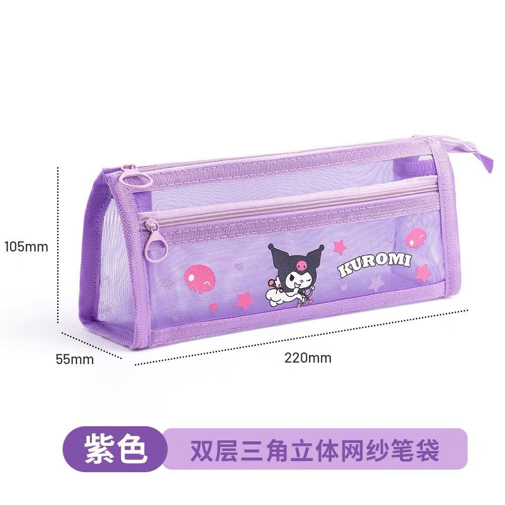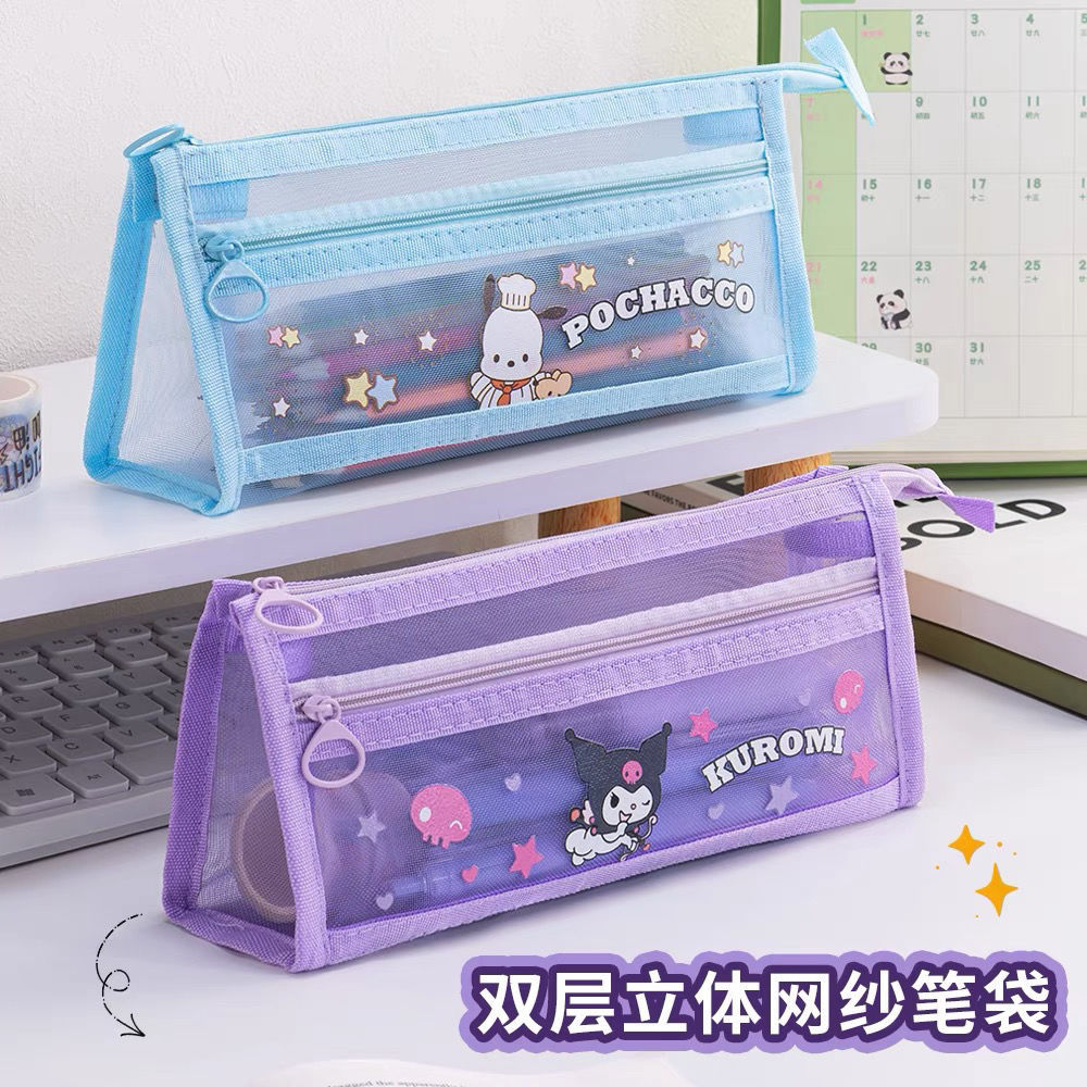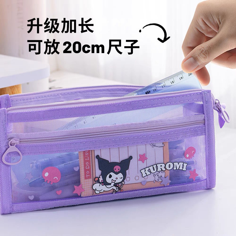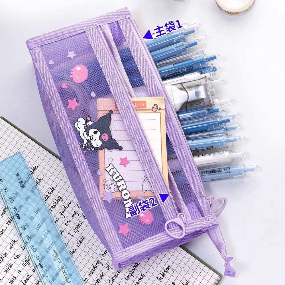 초등학생을위한 새로운 Sanrio Kulomi 메쉬 연필 가방 더블 레이어 연필 가방 문구 가방 대용량 저장 가방
