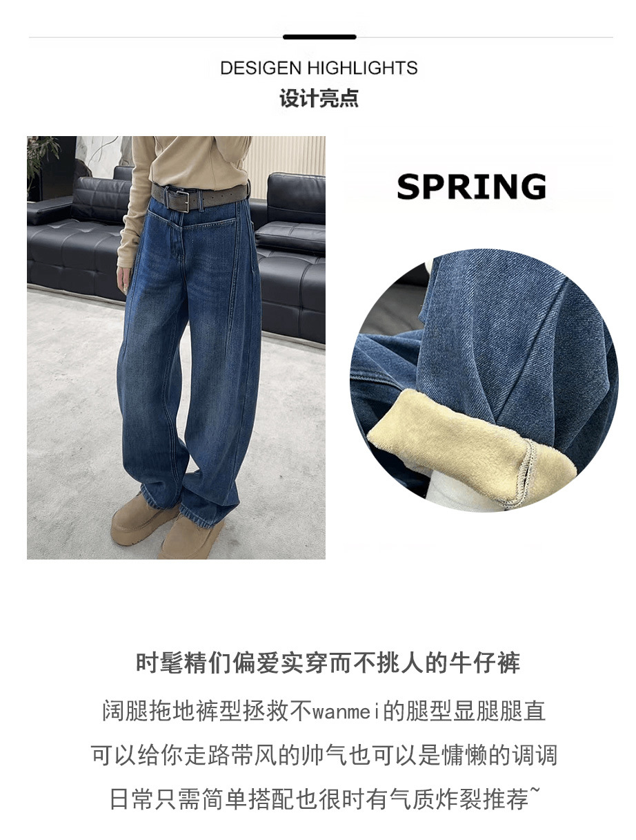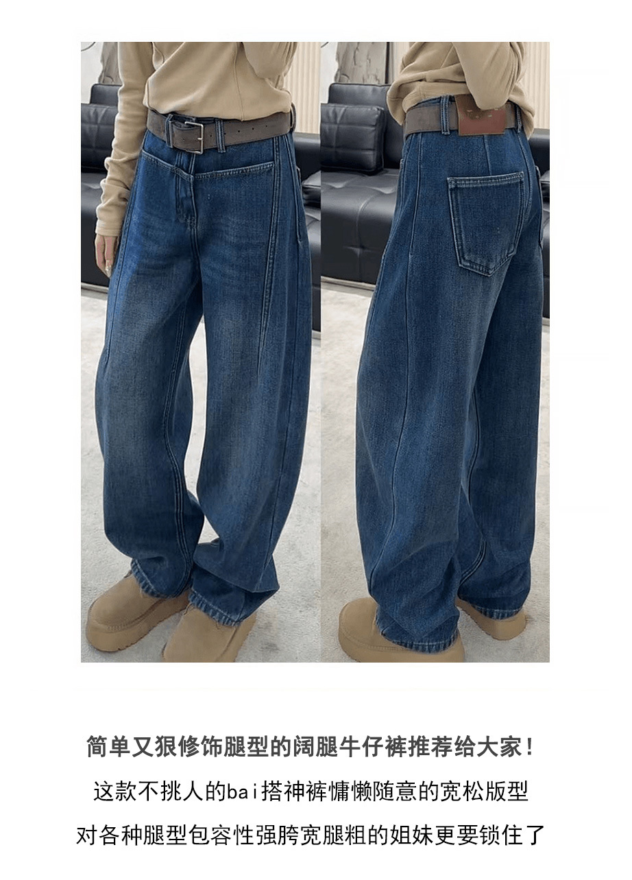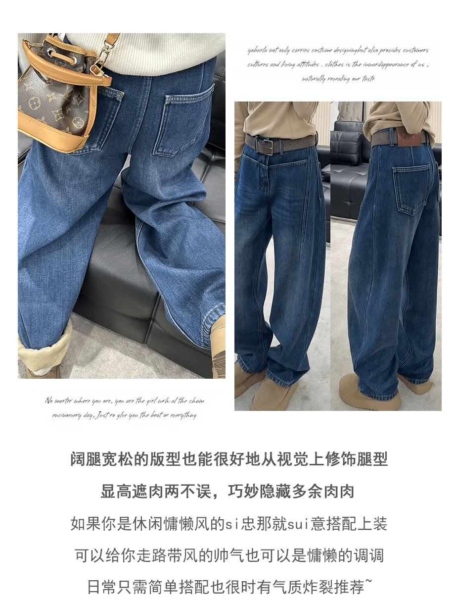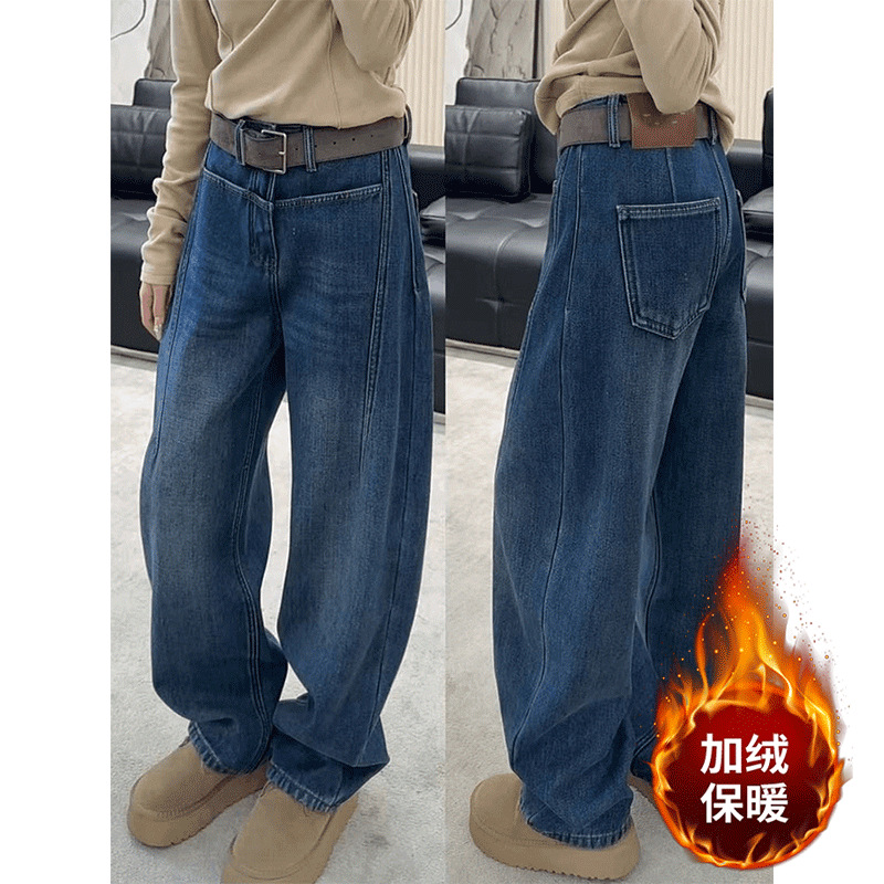 아메리칸 스타일 빈티지 다크 블루 넓은 다리 Machete 청바지 여성의 가을과 겨울 높은 허리 기모 두꺼운 느슨한 바닥 긴 바지스토어 가기