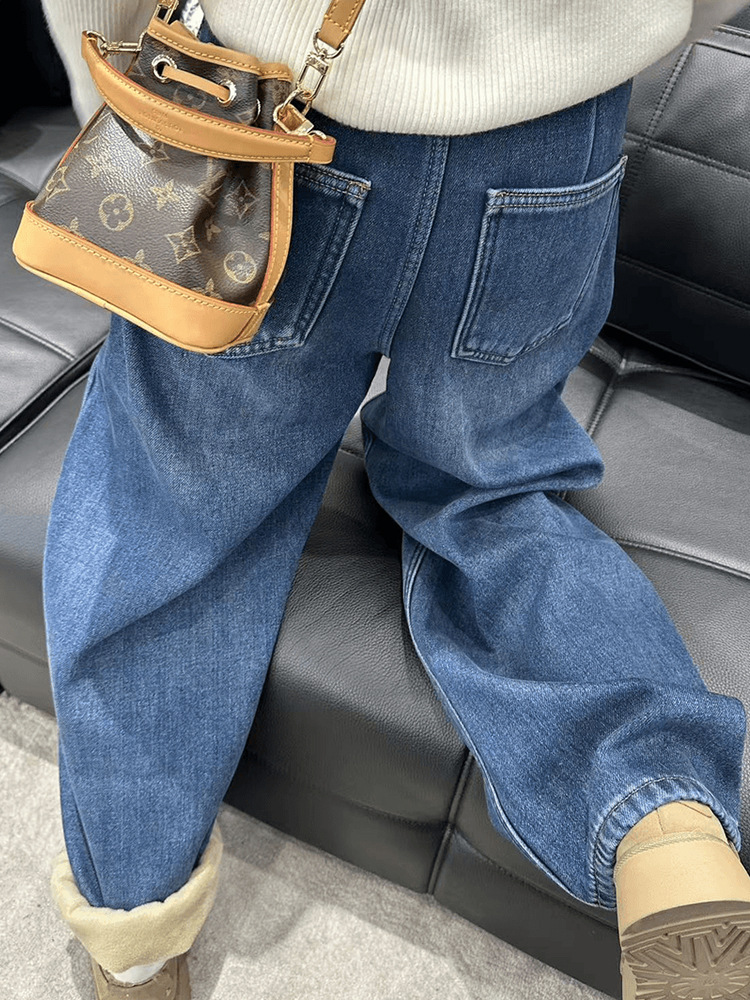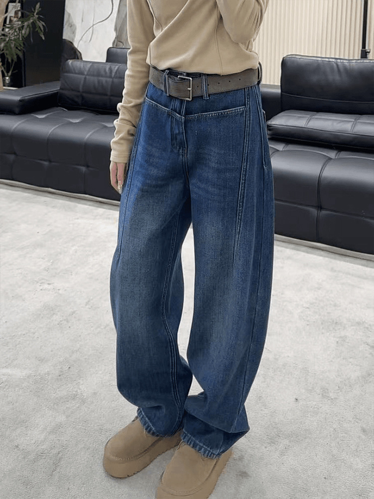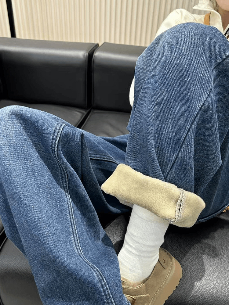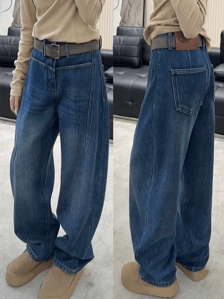 아메리칸 스타일 빈티지 다크 블루 넓은 다리 Machete 청바지 여성의 가을과 겨울 높은 허리 기모 두꺼운 느슨한 바닥 긴 바지스토어 가기