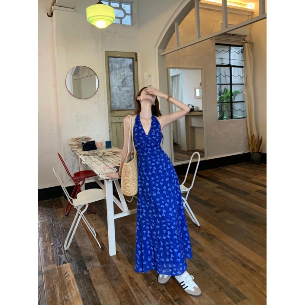 새로운 중국 스타일 국가 스타일 꽃 우아한 목 교수형 원피스 여성 여름 2024 새로운 허리 등이없는 긴 치마스토어 가기