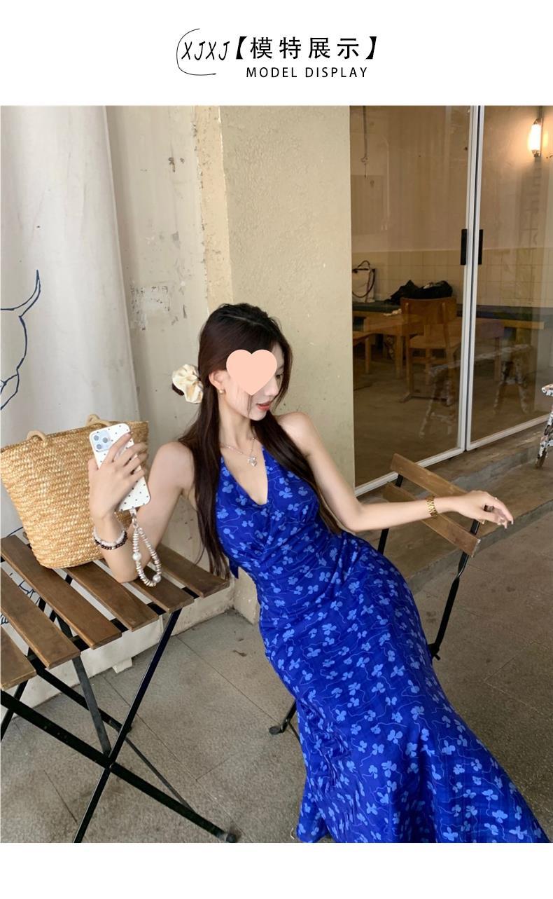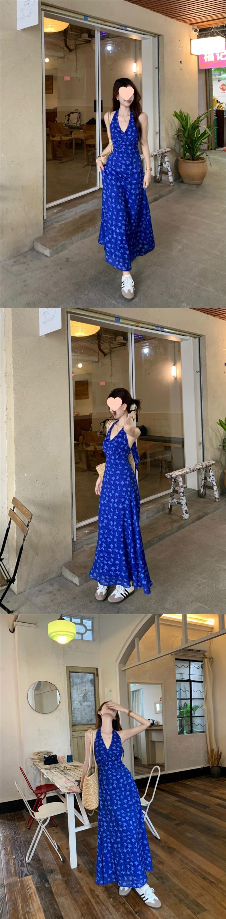 새로운 중국 스타일 국가 스타일 꽃 우아한 목 교수형 원피스 여성 여름 2024 새로운 허리 등이없는 긴 치마