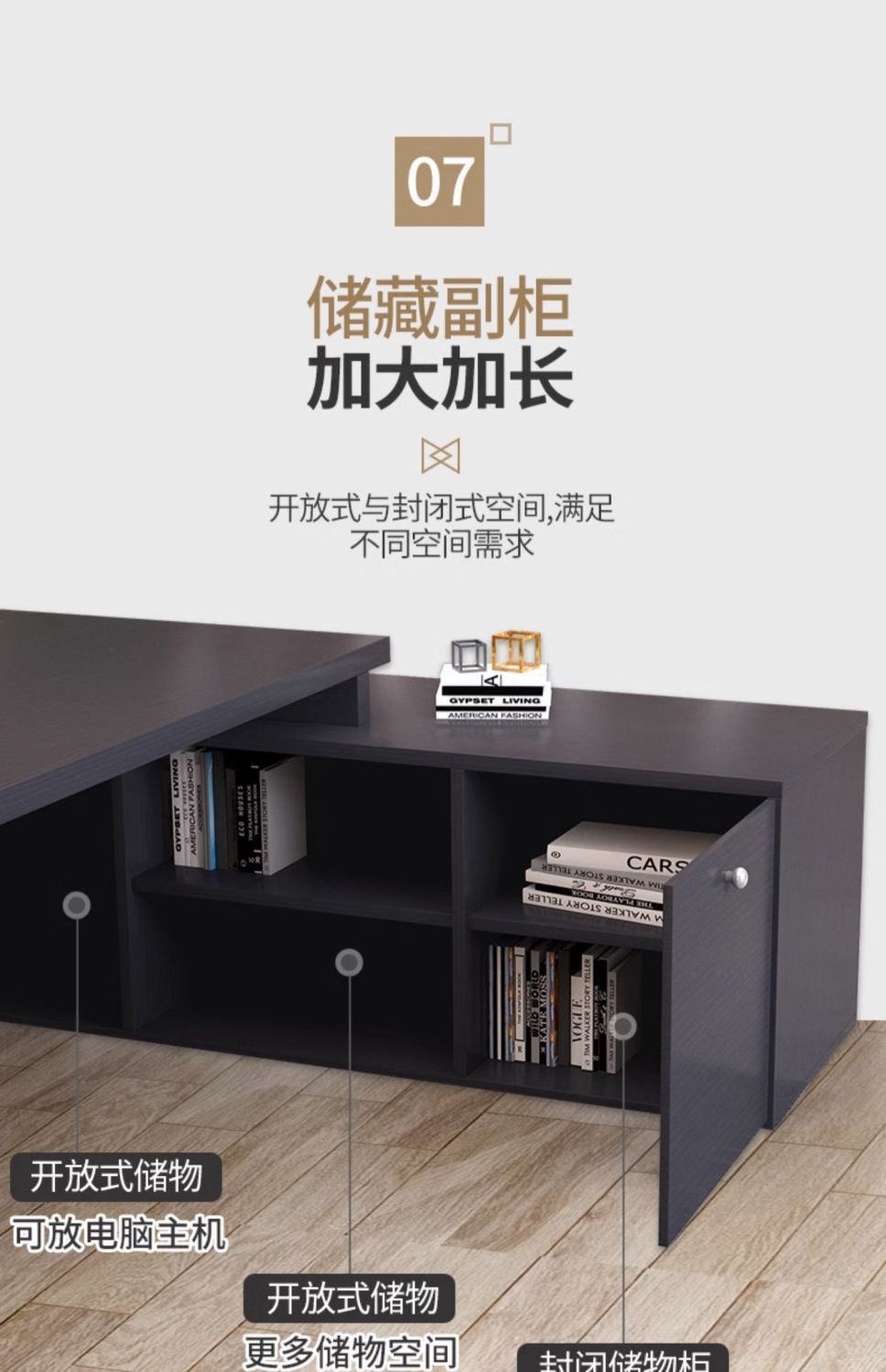 • 그레이 오크 테이블 상판 + 블랙 월넛 캐비닛 [깊은 측면 캐비닛]