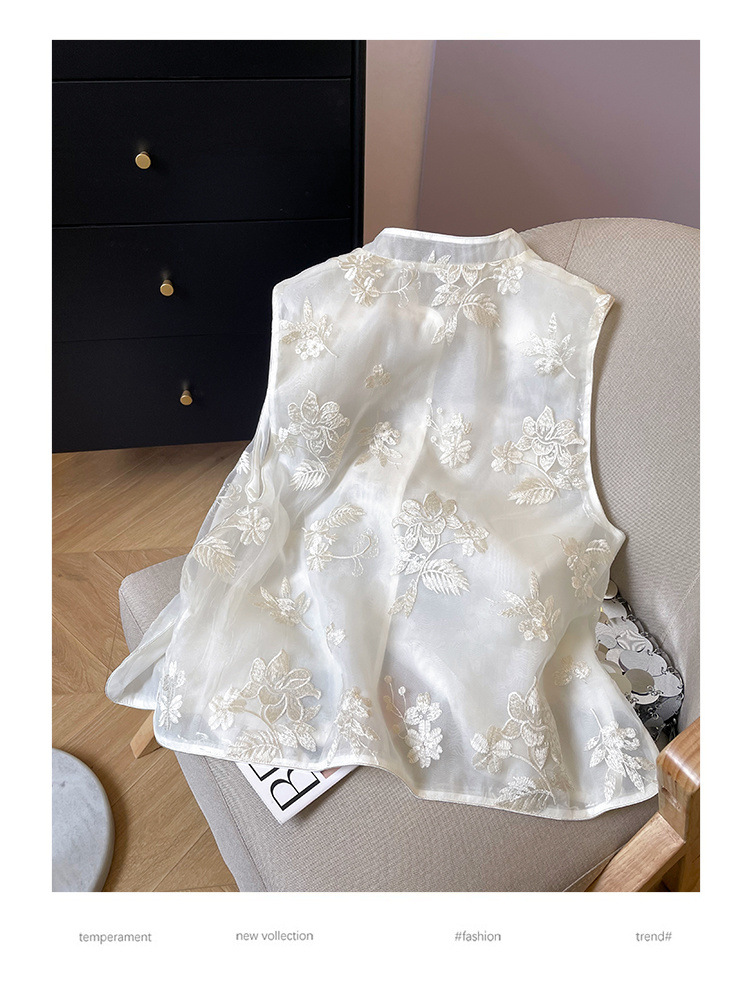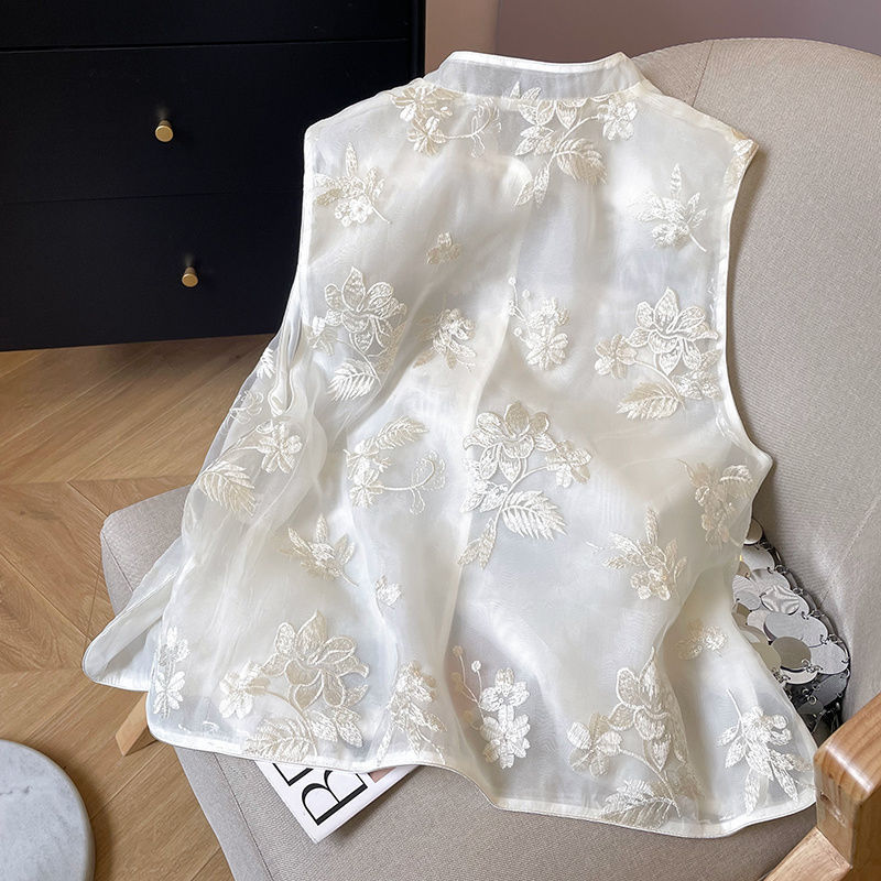새로운 중국식 컨설팅 여성용 버클 자수 실크 조끼 여름 얇은 마이크로 투명 외부 조끼 조끼 조끼 착용